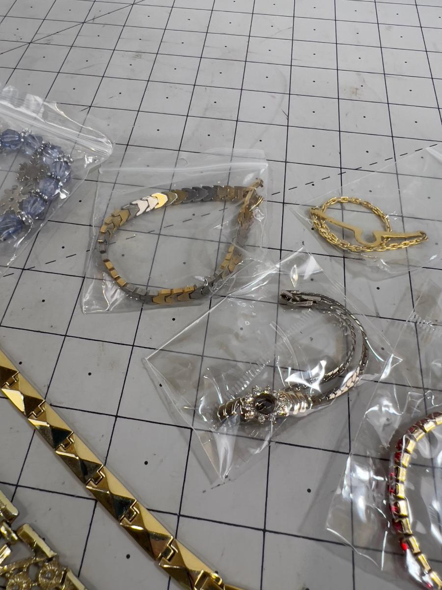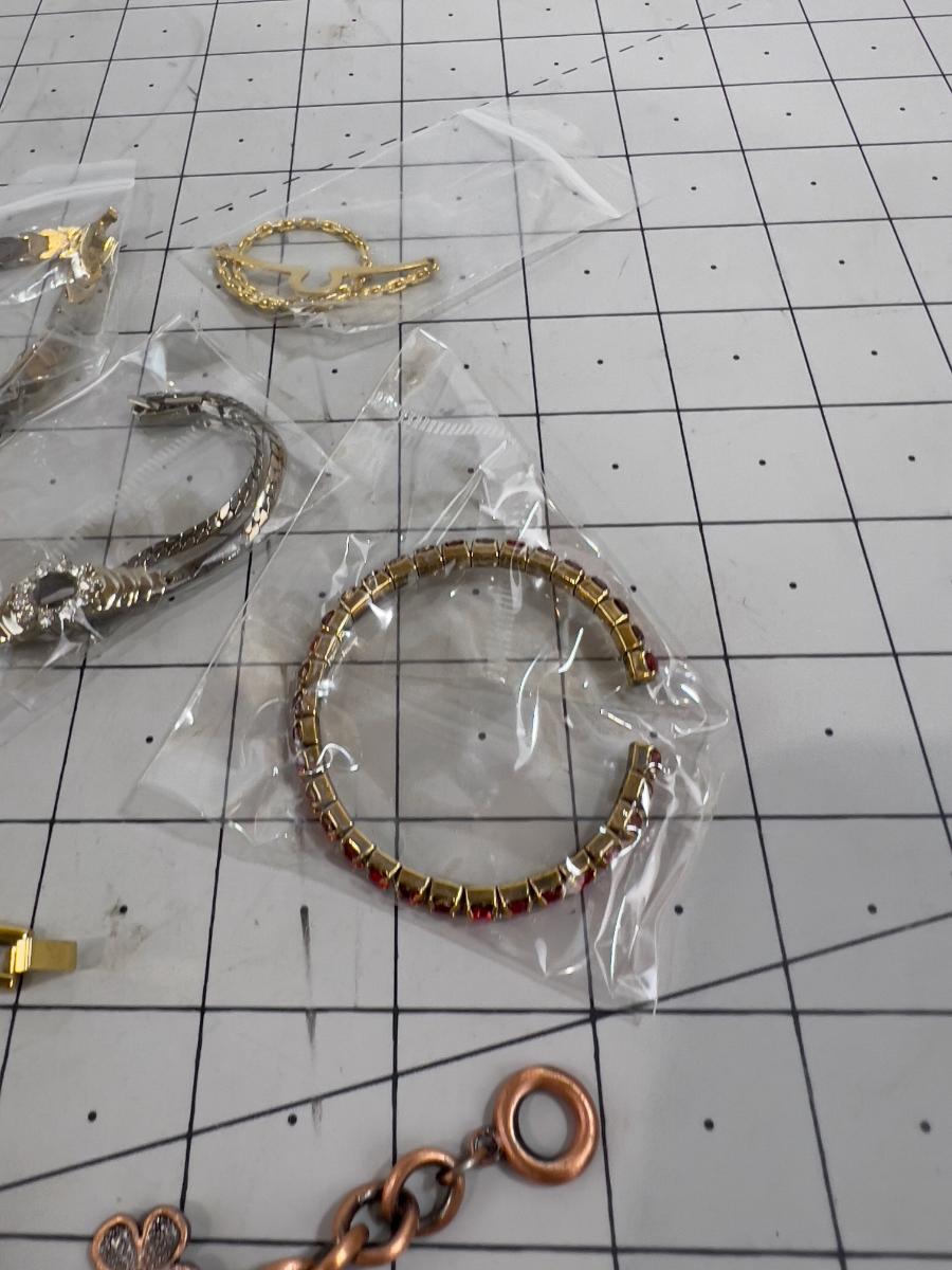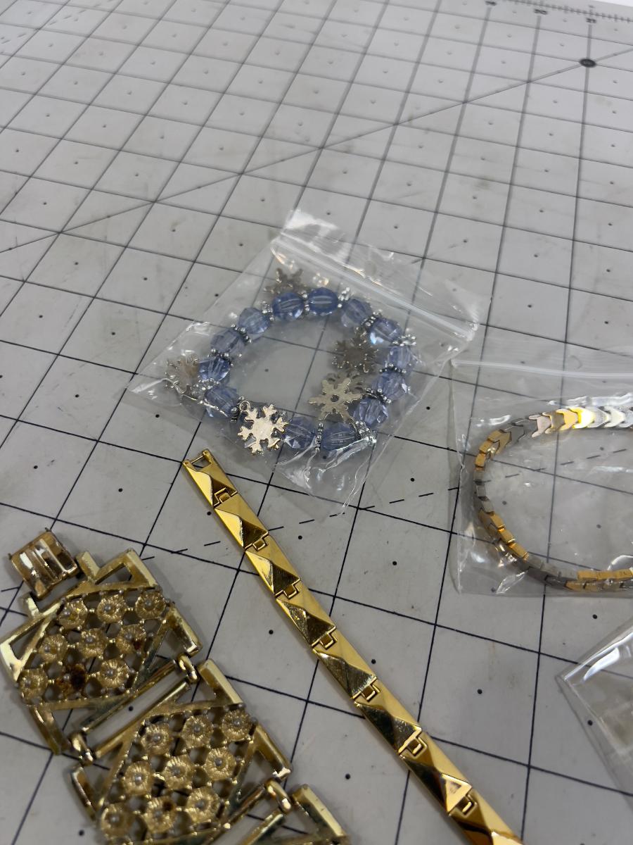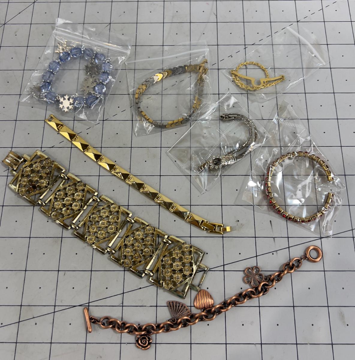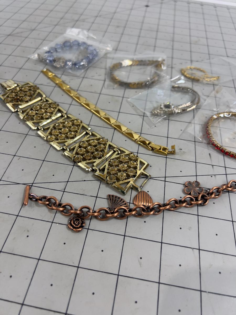 Most Metal with Faux Jewels. Good Condition. Wearable. Fun.