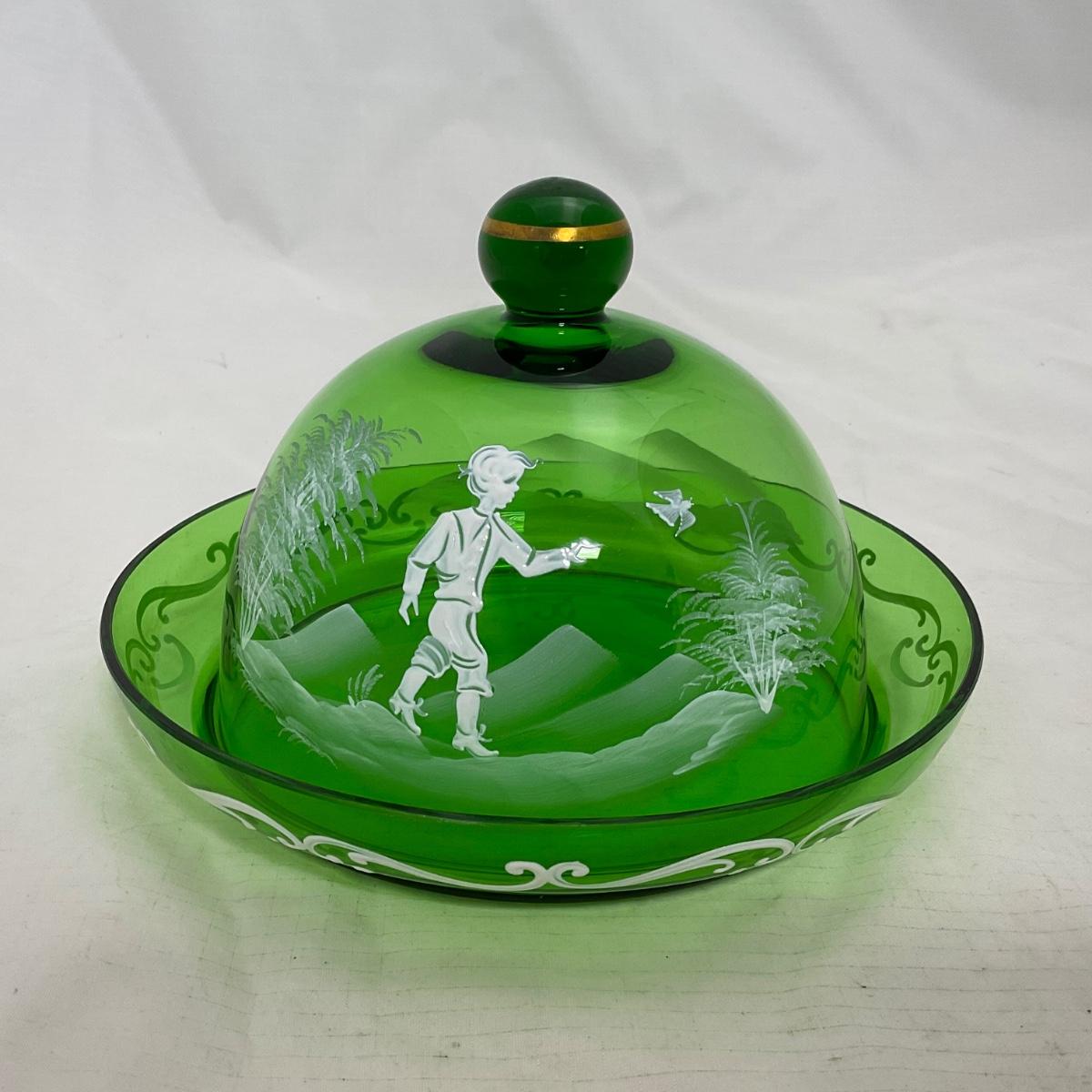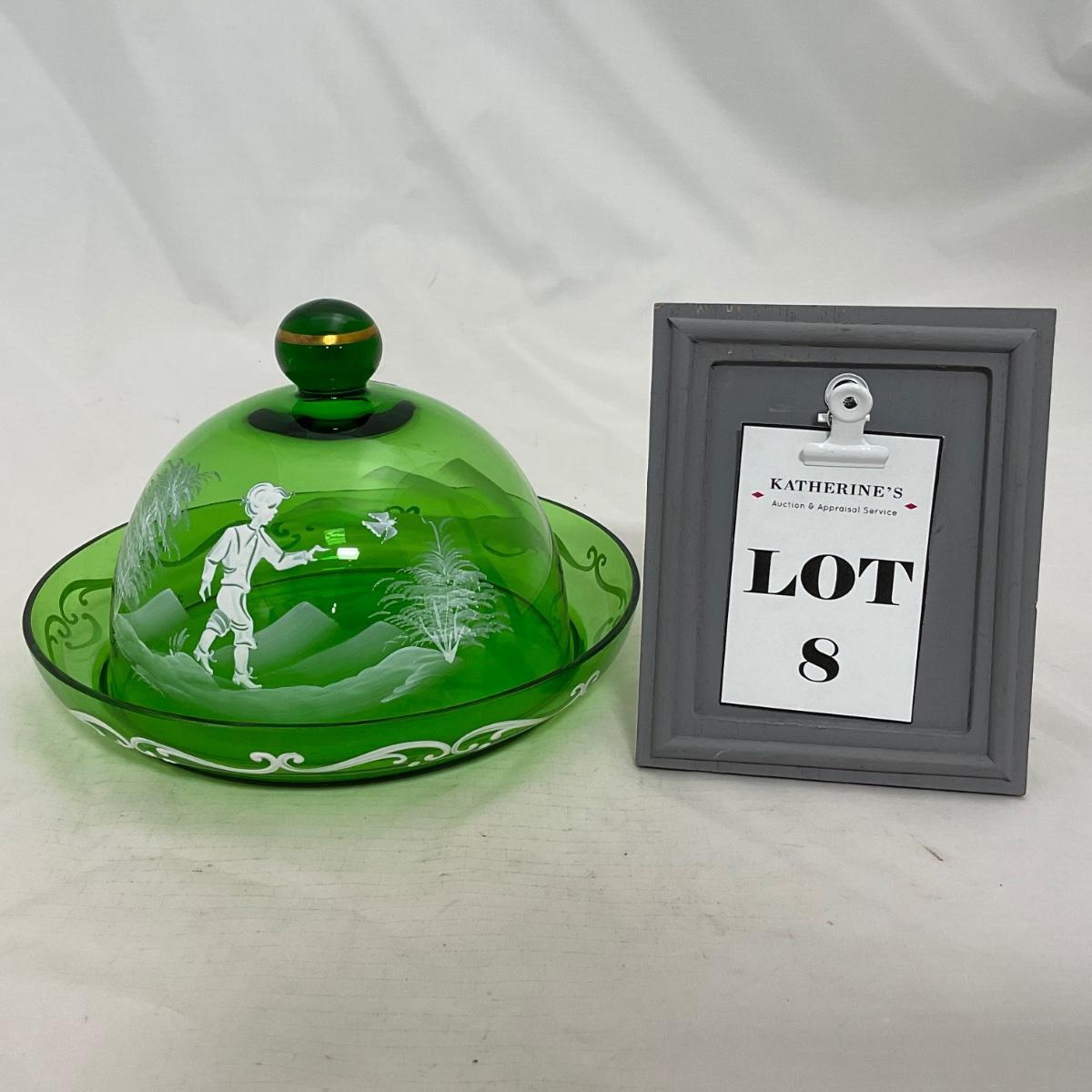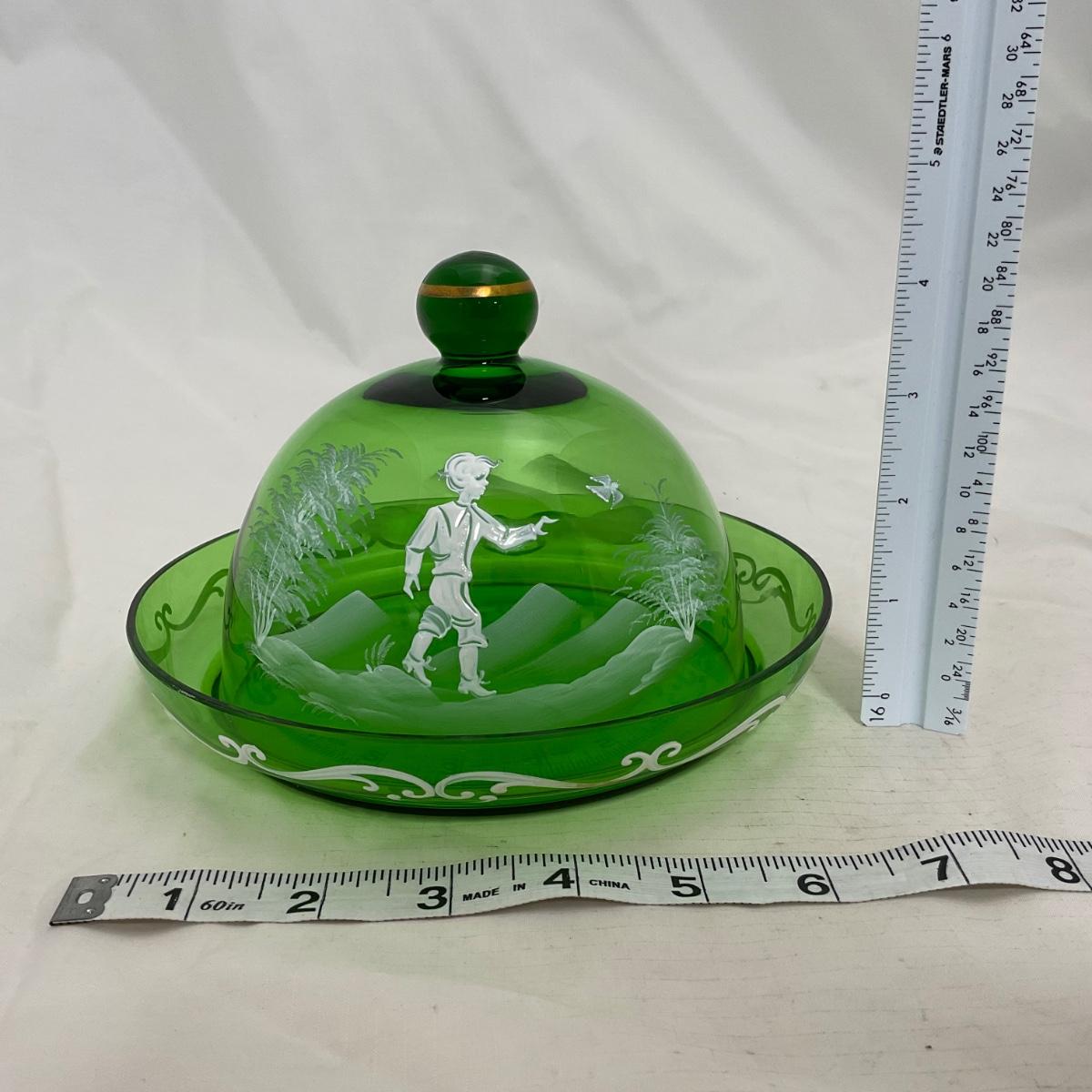 -8- Hand Painted Green | Mary Gregory Covered Butter Dish