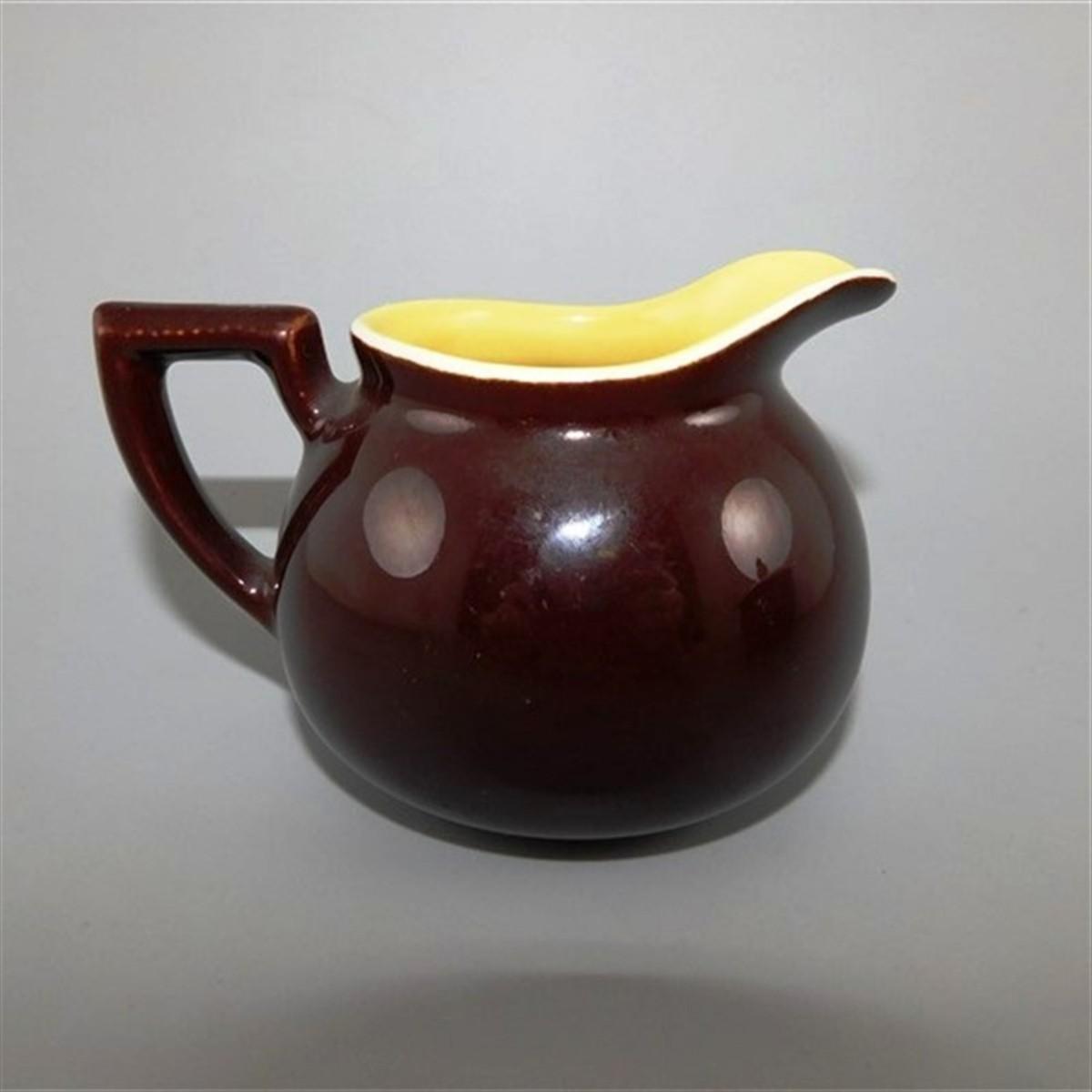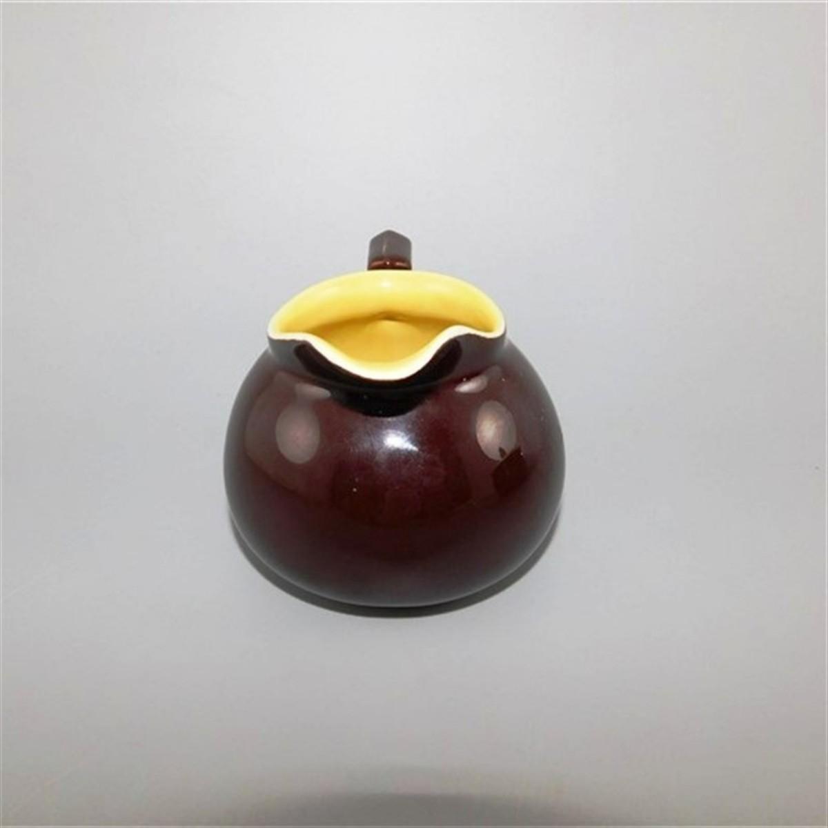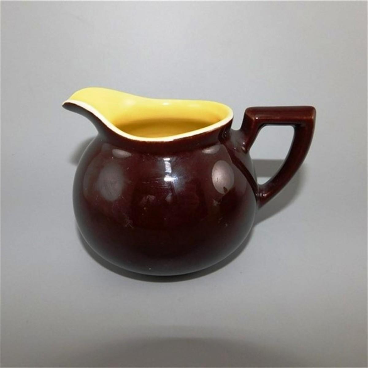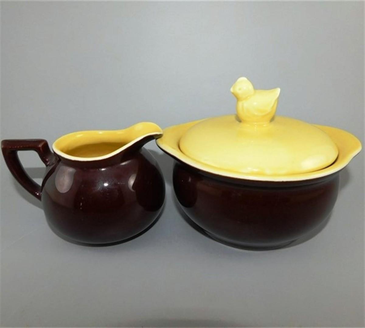 8 Lot of 2 - Hall Bright Yellow and Brown Pottery Creamer and Condiment Jar with Chick on Lid