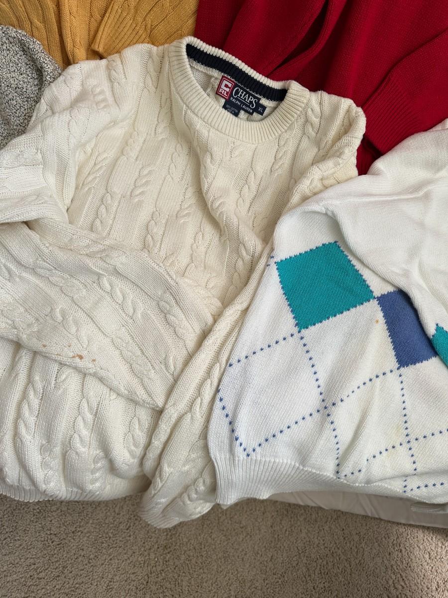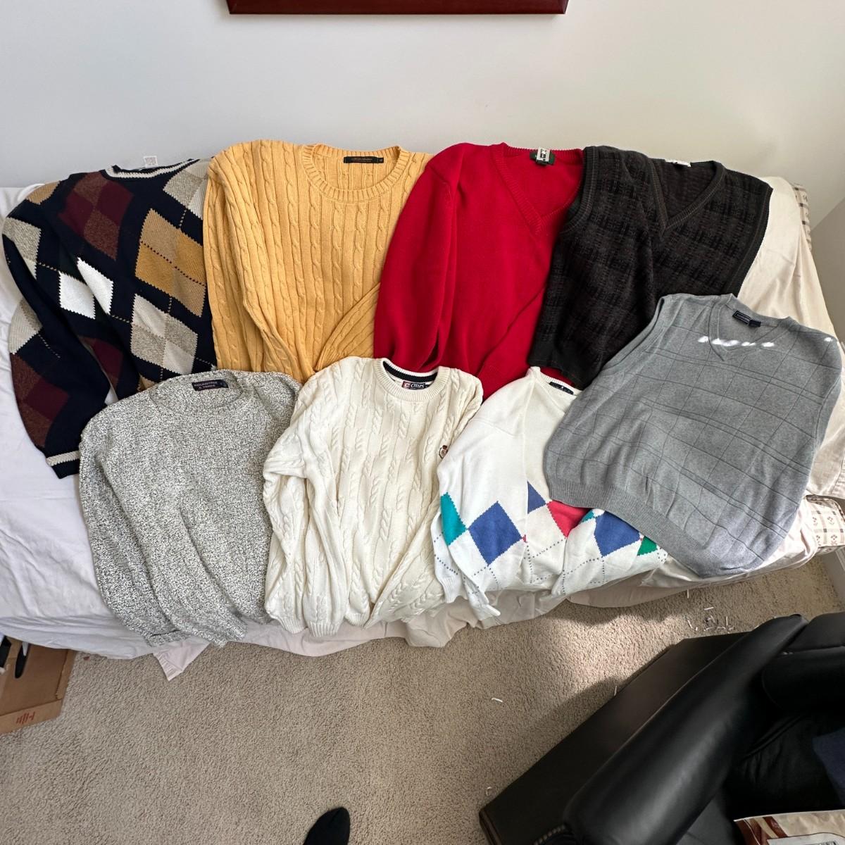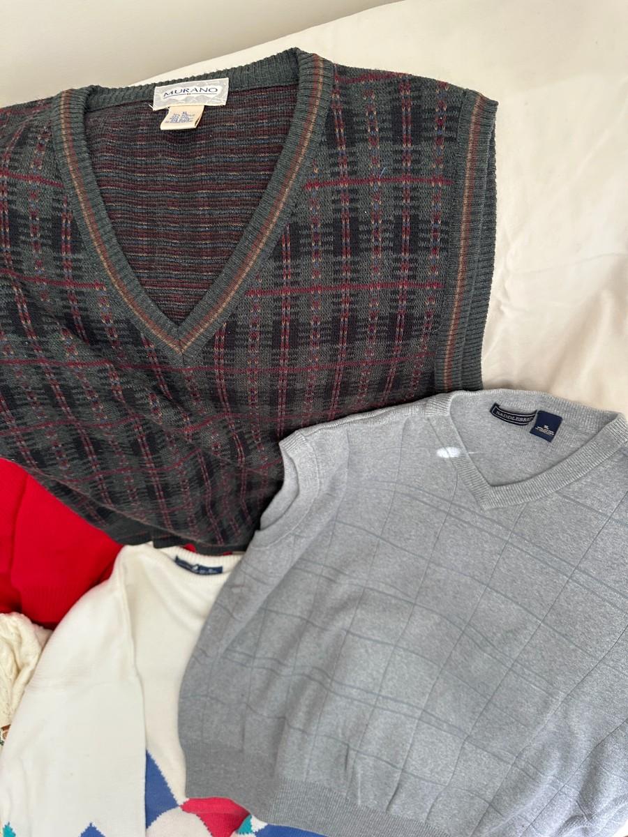 Brands: Chaps, Roundtree & Yorke, Stanley Blacker, American Outpost, Joe's Casual/Jos A Bank, Brooks Brothers, Murano & Saddlebred Vests. 3 have slight stains (red one shown is worst stain).