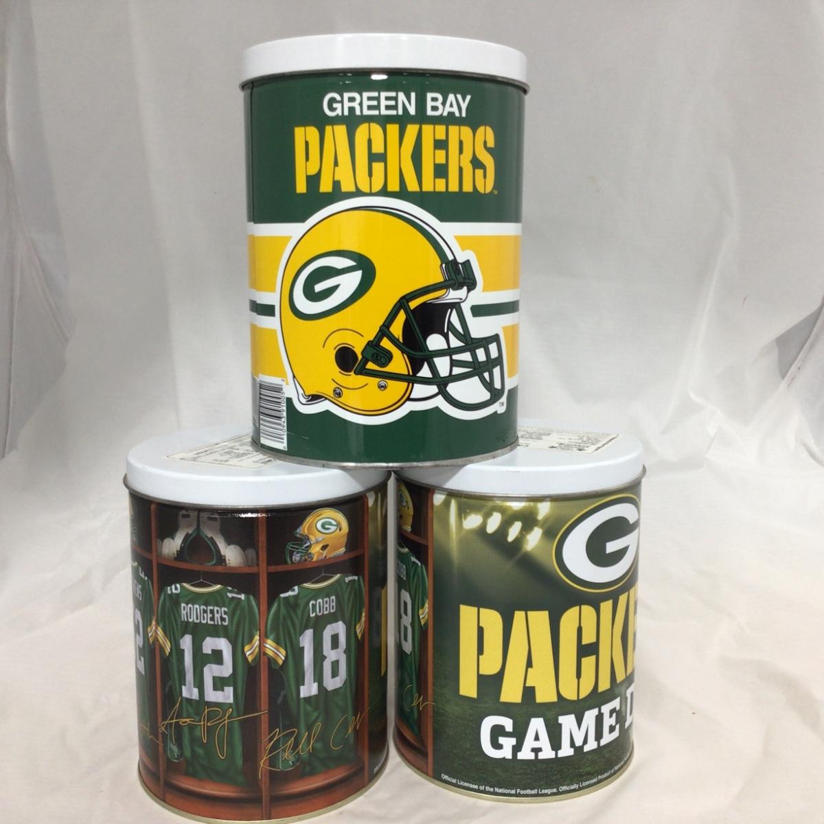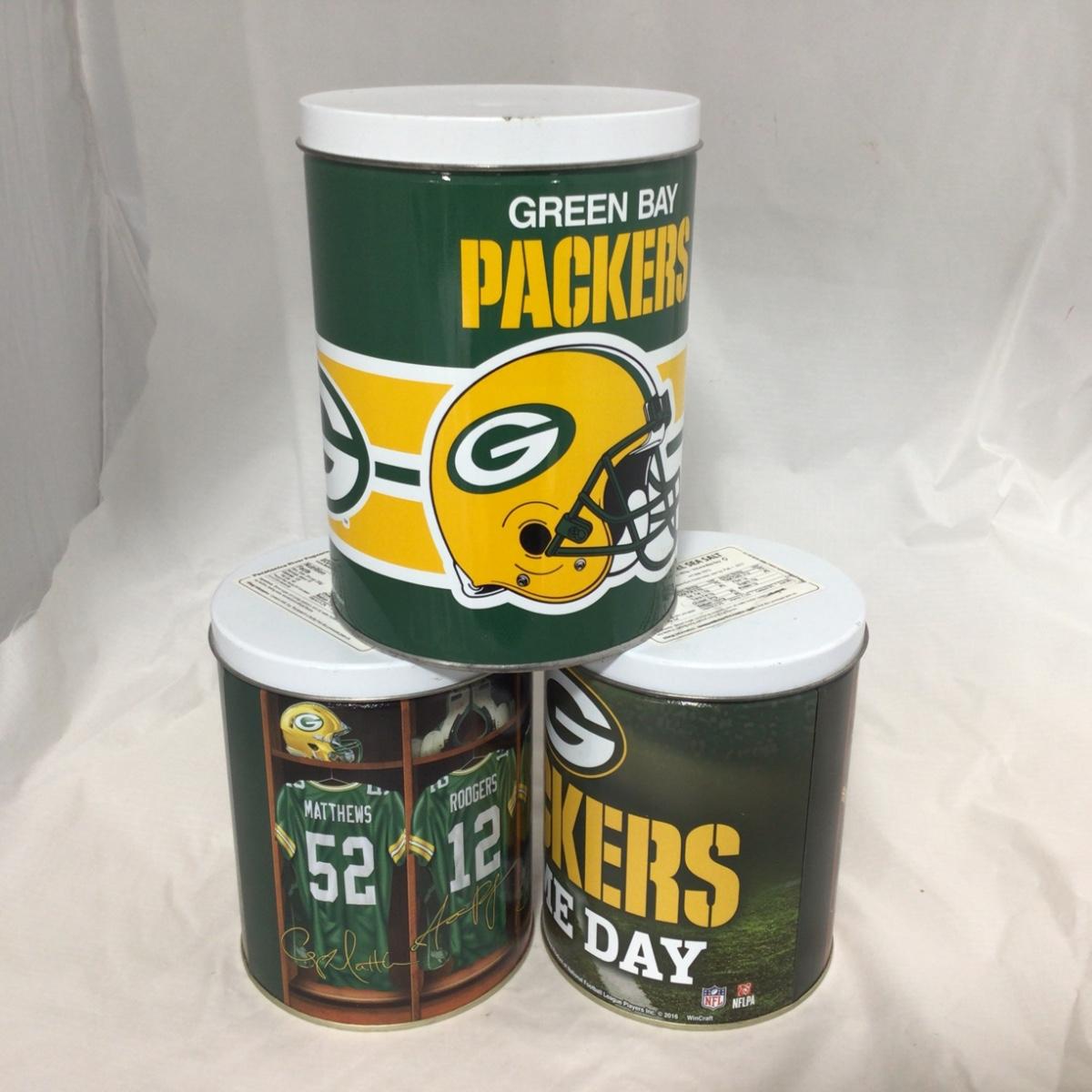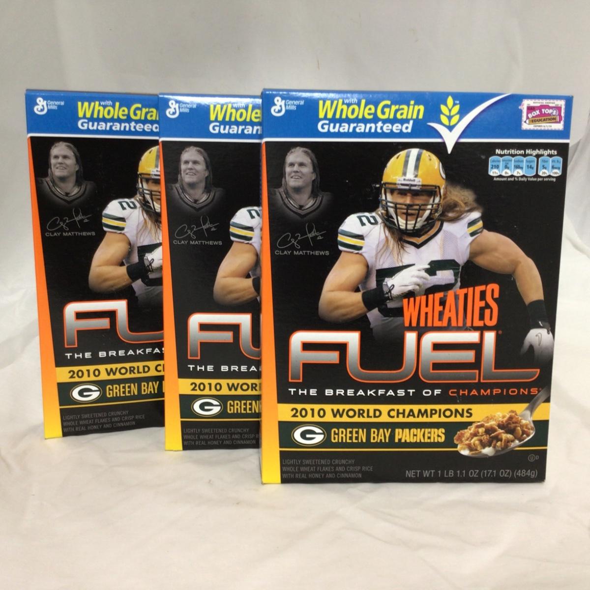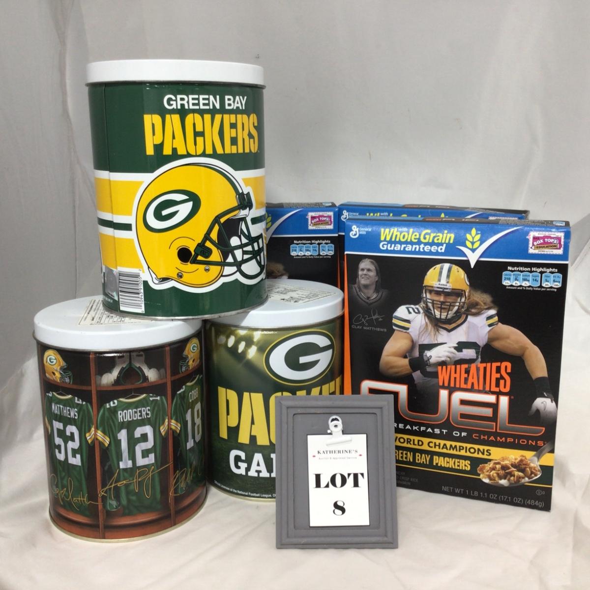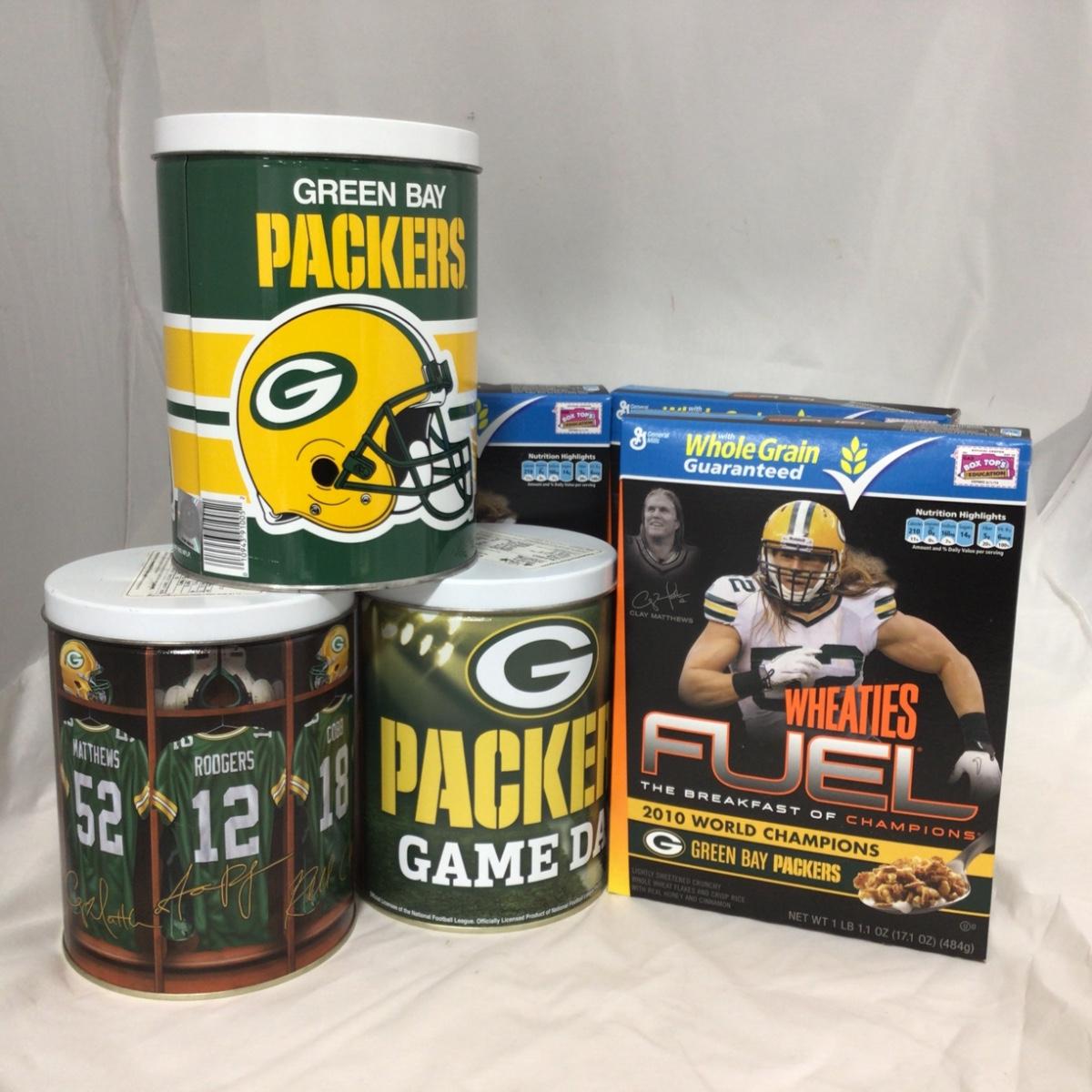 Three full, unopened Clay Mathews Wheaties Fuel boxes, and three Green Bay Packers empty popcorn tins. Two of the popcorn tins have the same design. Please see photos for details and condition. ::: Shipping is available on this lot. If you require shipping you must let us know at the close of the auction. We will coordinate with you after the item has been won. Shipping fees will include insurance up to or exceeding the value of all items being mailed. If you have any questions regarding this lot please contact the auctioneer either via this website, by direct email or by phone. PICK UP TIMES and other important information can be found in the TERMS and DESCRIPTION of the auction. Please take a look for pertinent information. Thanks!