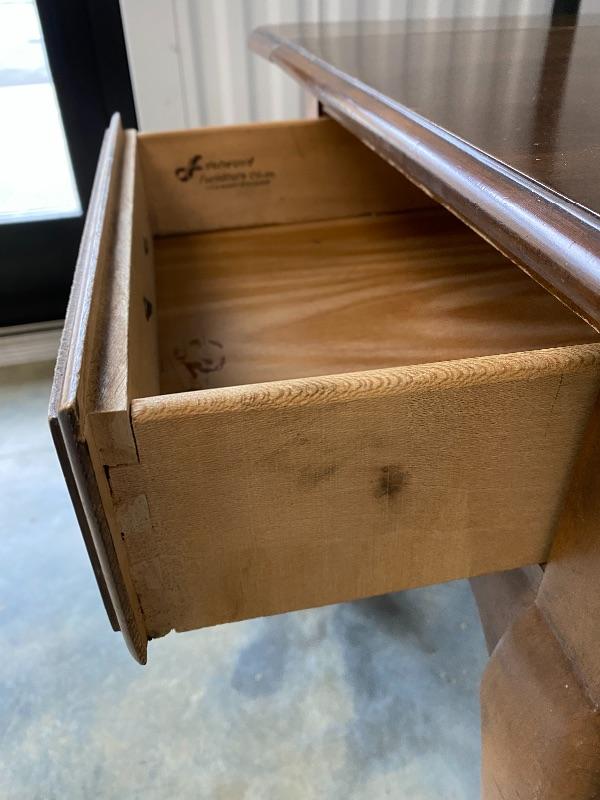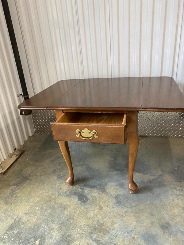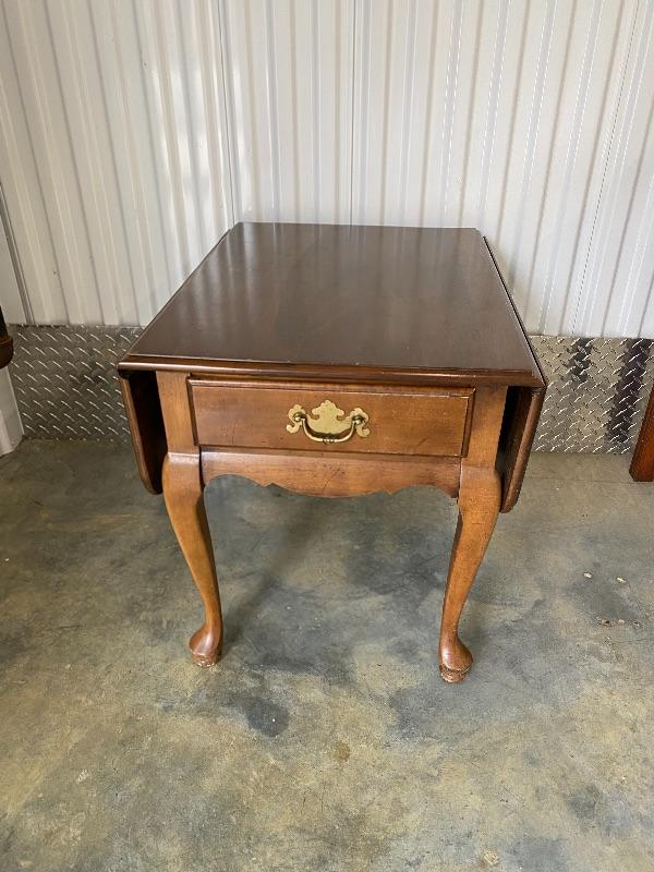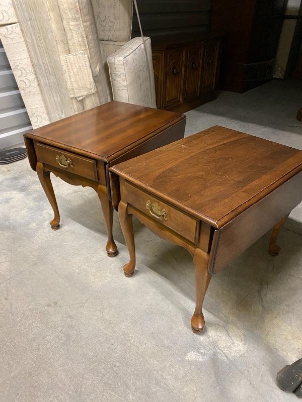 Lovely matching side tables with drop leaf sides for extra space if needed. Made by Delwood Furniture Company. 21"w x 27"d x 22.5"h (When fully open it is 36"w x 27"d)