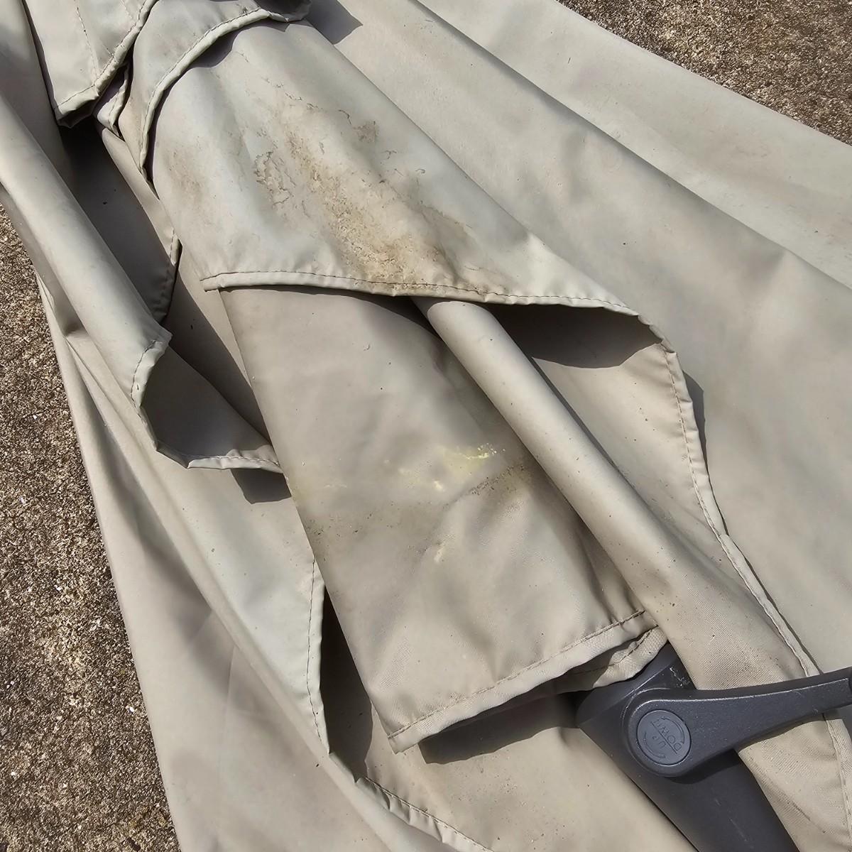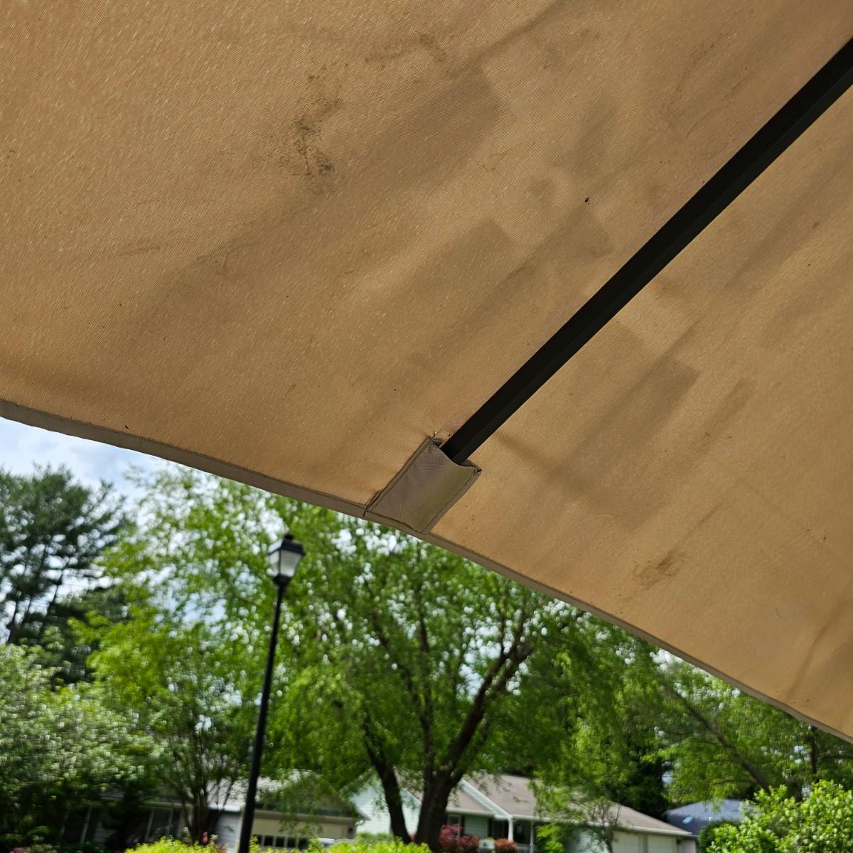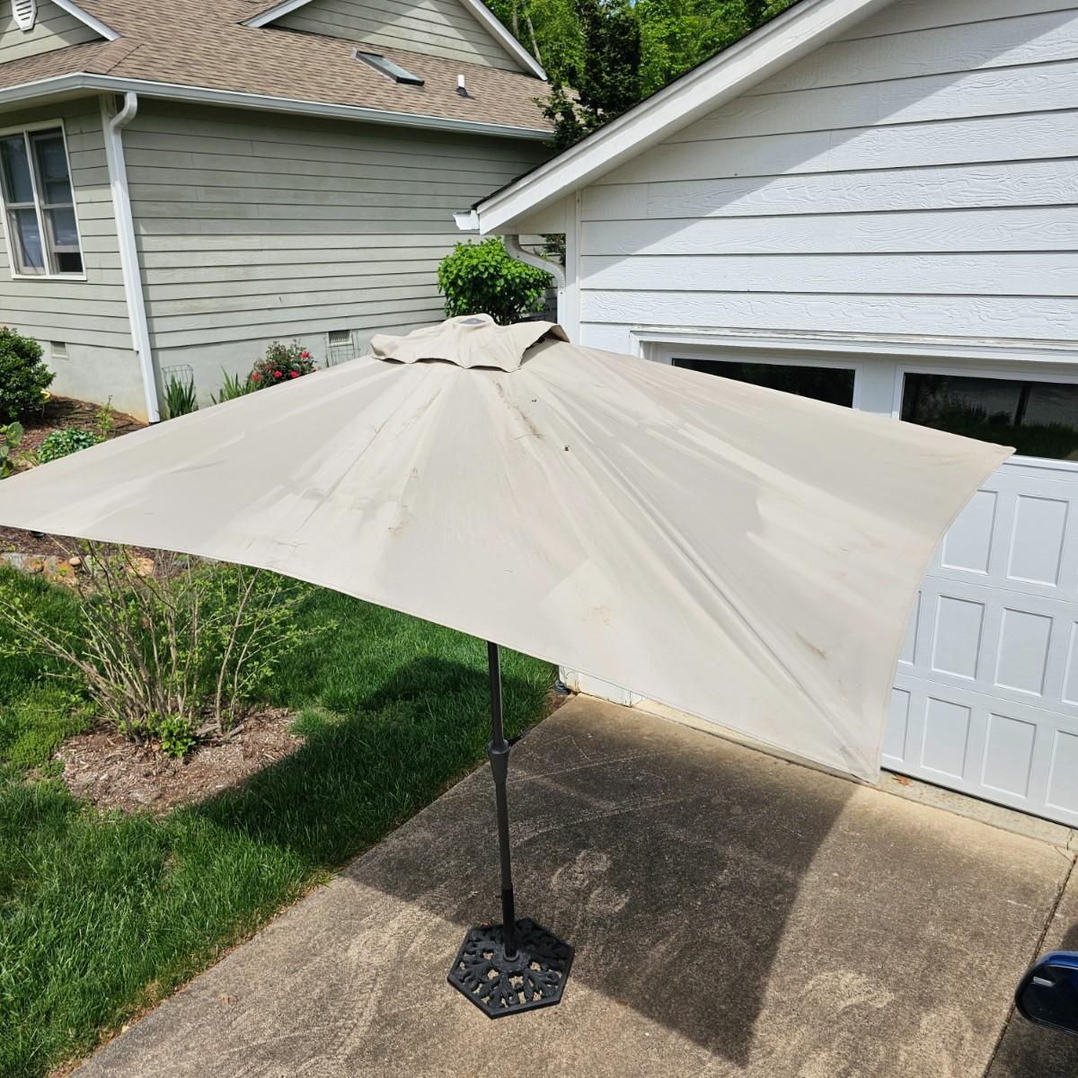 One eight foot tall patio umbrella with tilt capability. Umbrella itself is a rectangle shape, measures approximately 75"W x 108"D. Umbrella raises and lowers smoothly, needs a good cleaning. Has wrap strap to keep closed when lowered. Hexagon shaped wrought iron stand is 18"