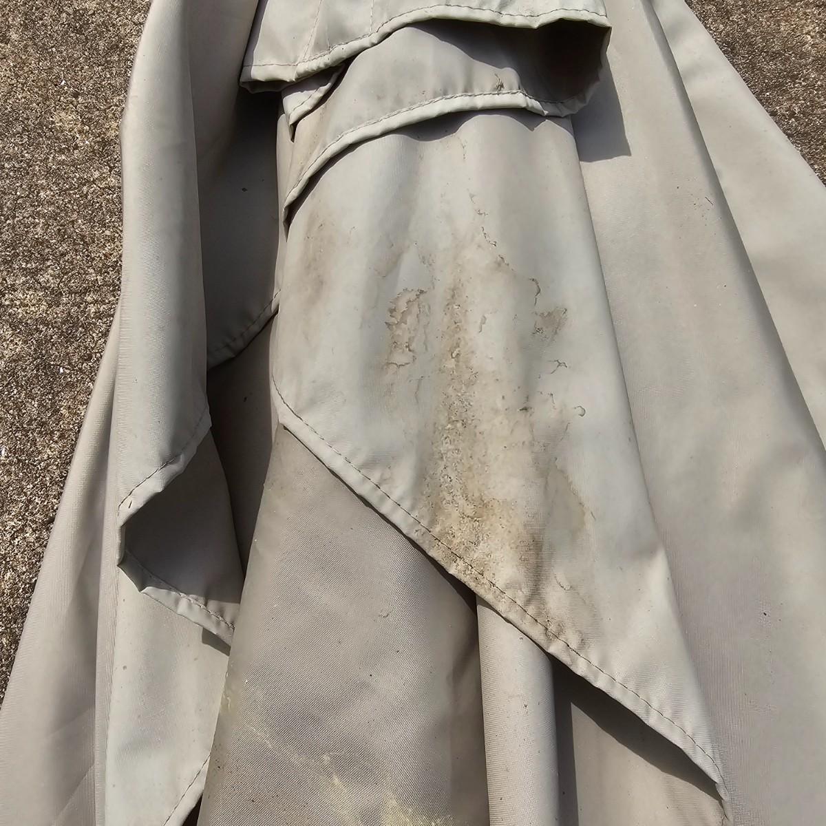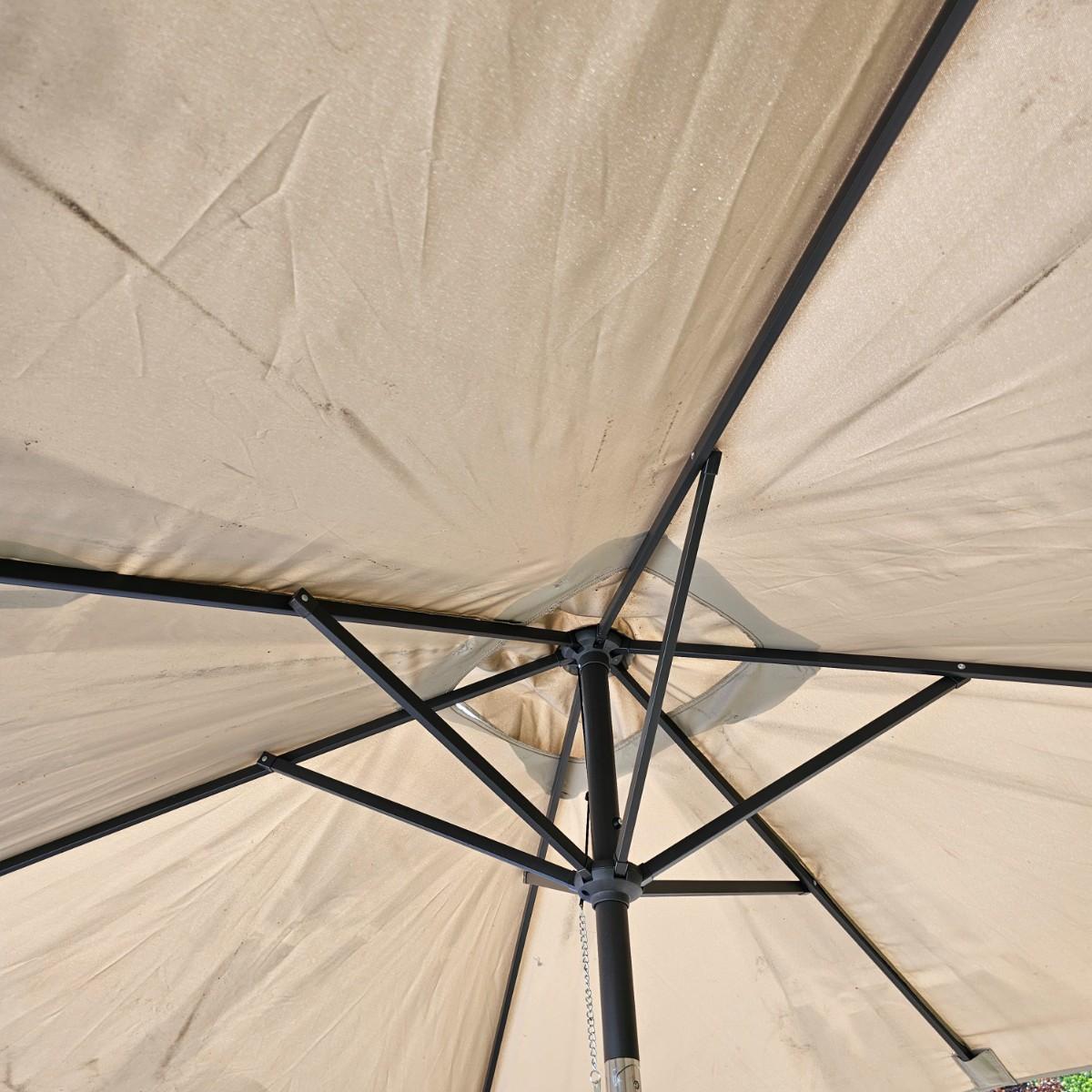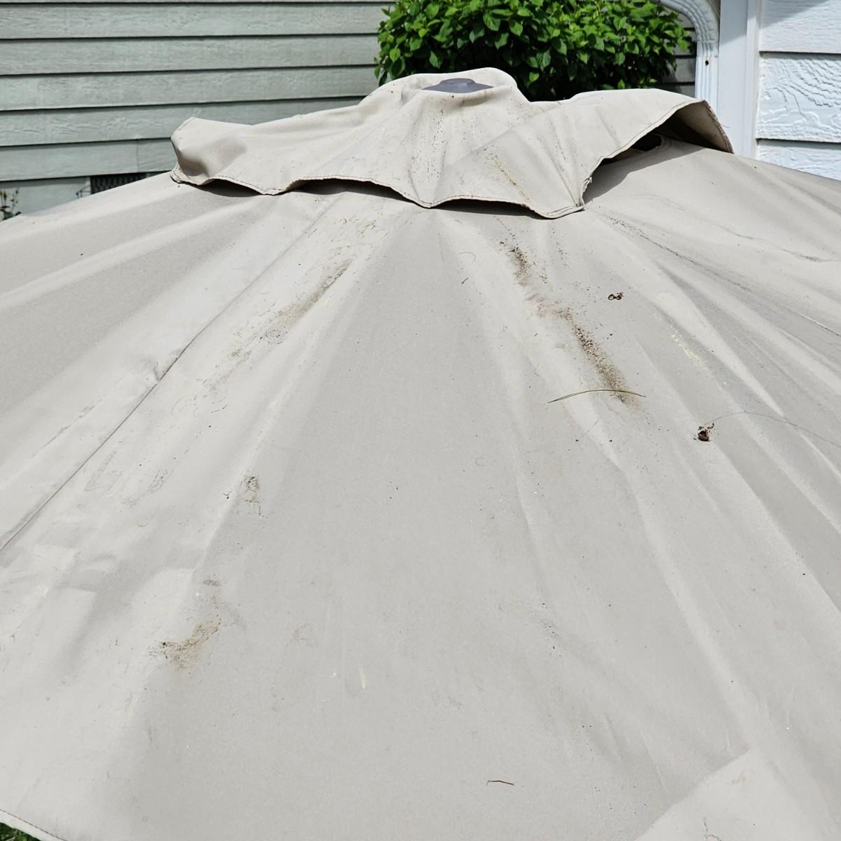 One eight foot tall patio umbrella with tilt capability. Umbrella itself is a rectangle shape, measures approximately 75"W x 108"D. Umbrella raises and lowers smoothly, needs a good cleaning. Has wrap strap to keep closed when lowered. Hexagon shaped wrought iron stand is 18"