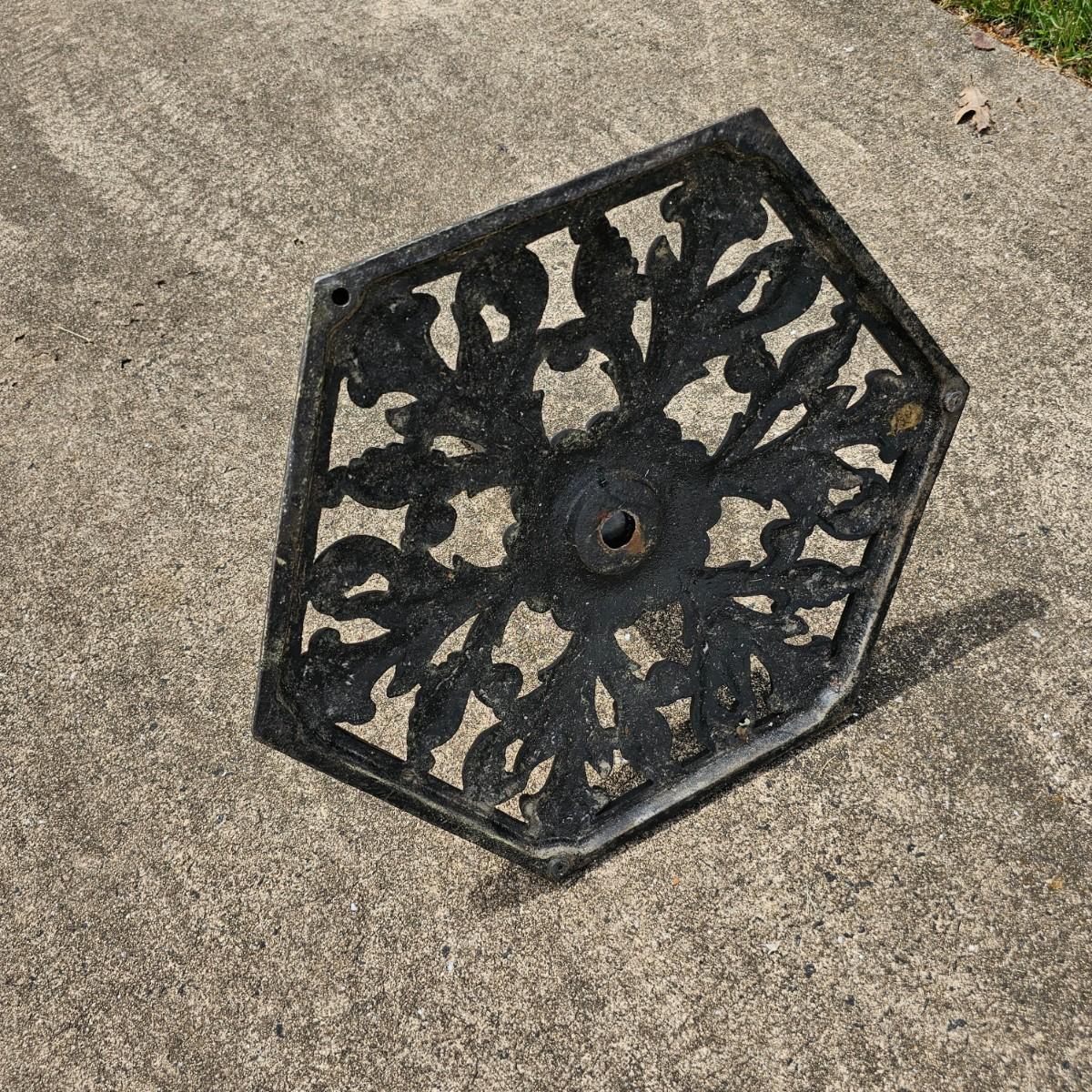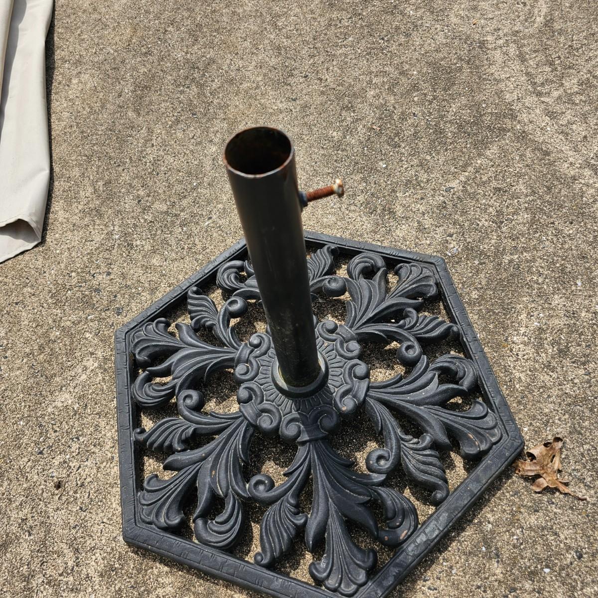 across and 16"H, has one set screw to hold umbrella in base. See photos for details. Local pickup only.