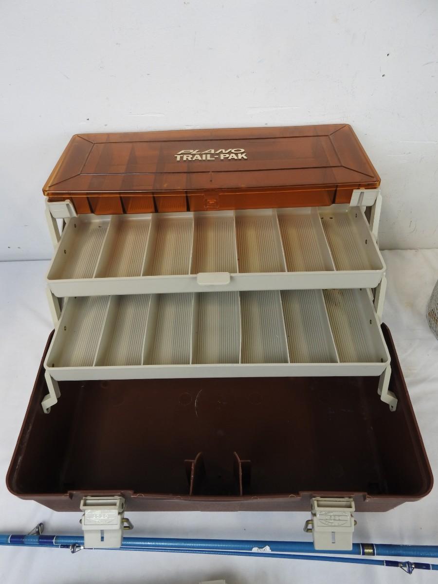 8 pc Camping/Fishing, Fishing Rod, Plano Tackle Box, Minnow Trap, Bait Bucket