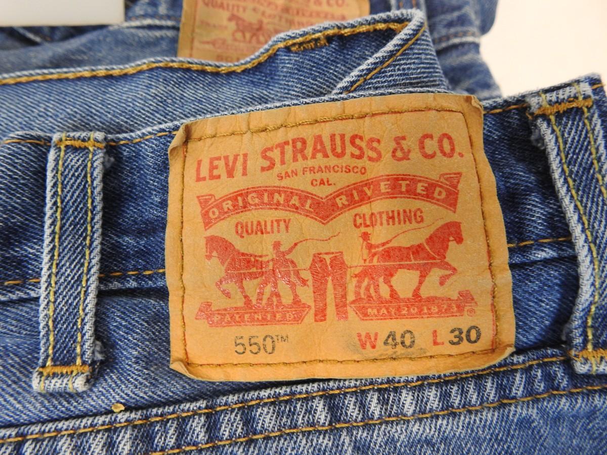 8 pc Men's Clothing: 2 Levi Jeans 40x30 & 38x38, 2 Kirkland Jeans 34x32, Black Suit JF 38L 34x32, Black T-Shirt Dickies XLT, Brown Button-Up Woolrich Med