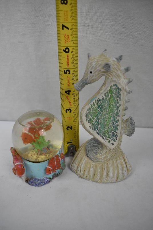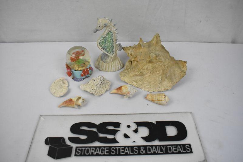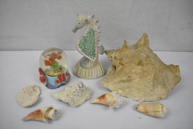 8 pc Ocean Theme Decor: 4 Shells, 1 seahorse figurine, 1 clownfish waterglobe