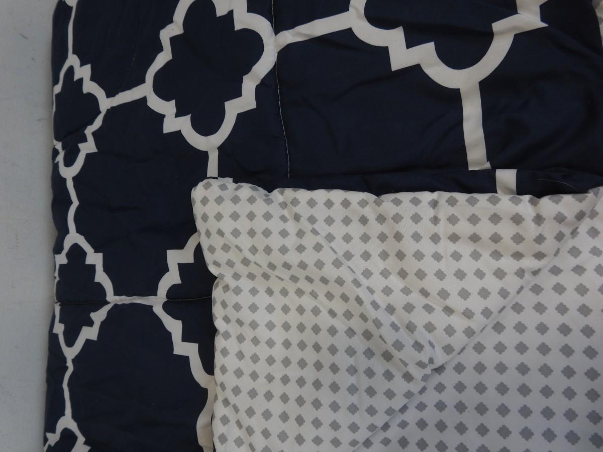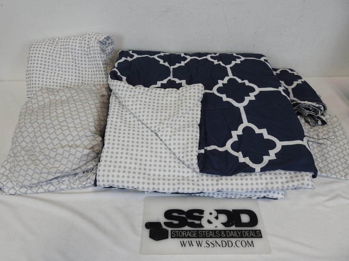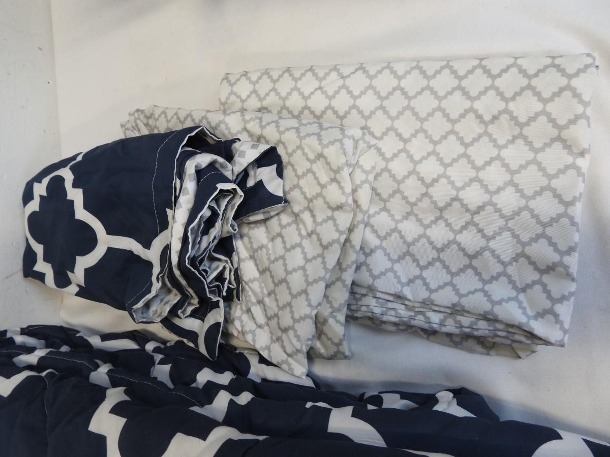 8 pc Queen Bedding Set, Navy/White/Gray: Skirt, Flat Sheet, Fitted Sheet, 2 pillow cases, 2 pillow shams, Comforter