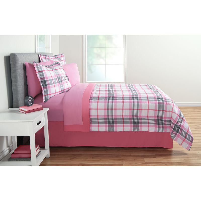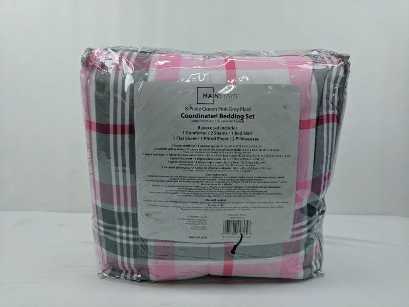 8 PC Queen Pink & Grey Plaid Coordinated Bedding Set, 1 Comforter/1 Shams/Sheets/Skirt - New