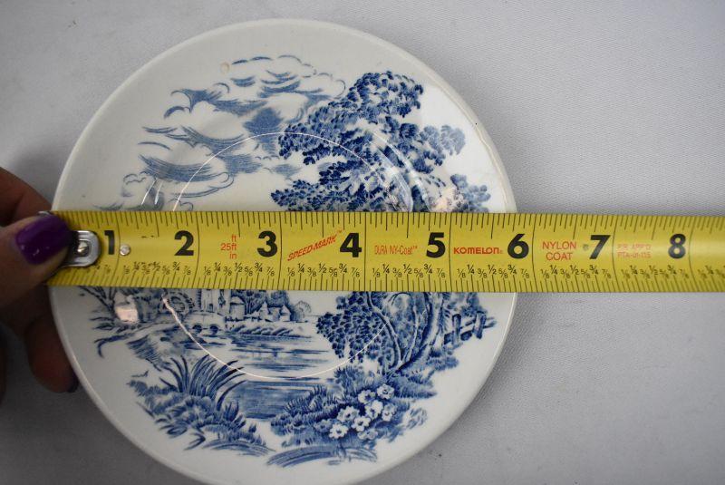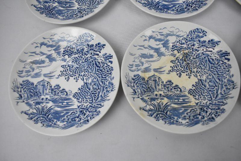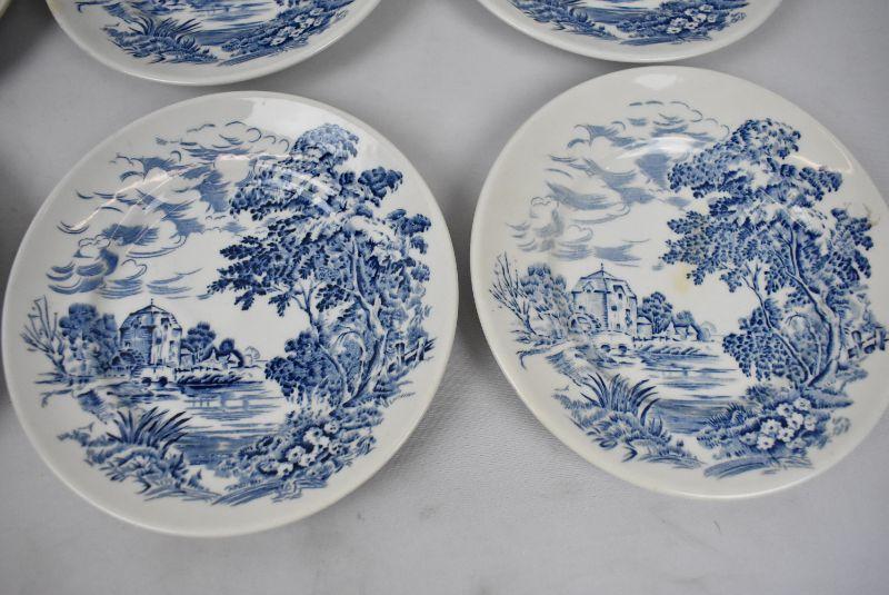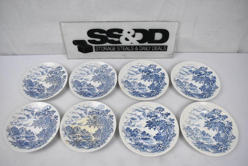 8 pc White & Blue Wedgwood "Countryside" Enoch. 4 dessert plates 5 7/8" & 4 saucers 5.5" Some discoloration Vintage