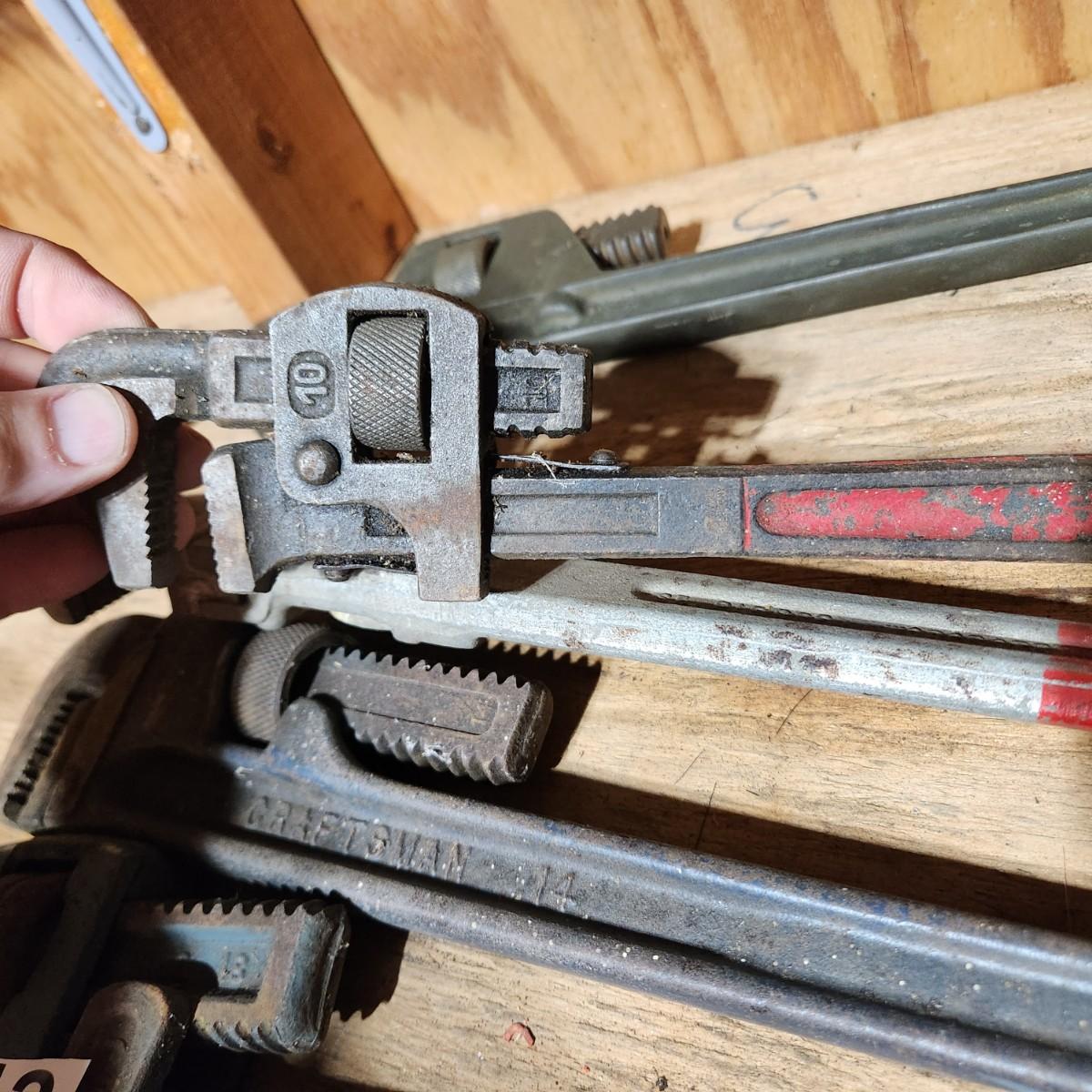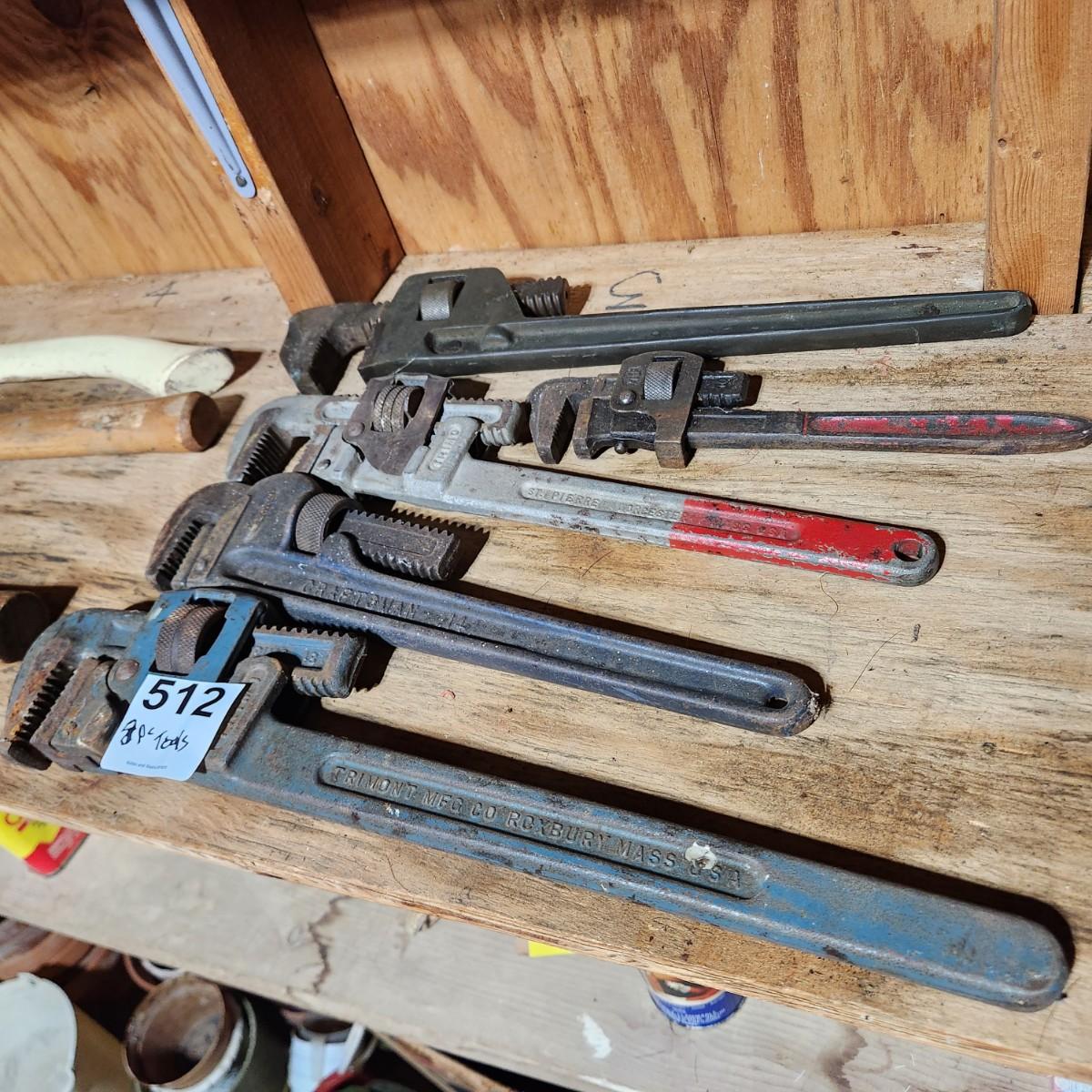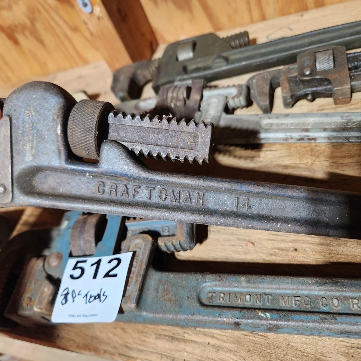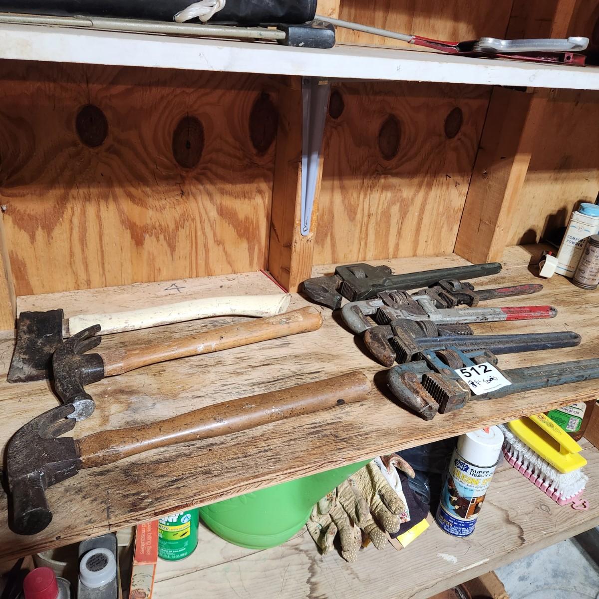 8 Pcs. Tool Lot Hammers, Axe, Pipe Wrenches