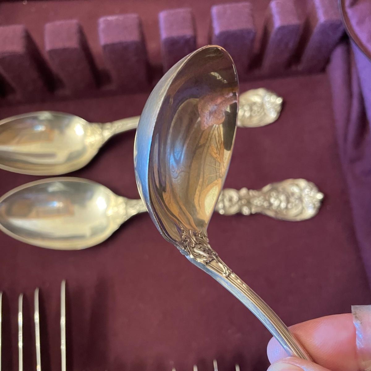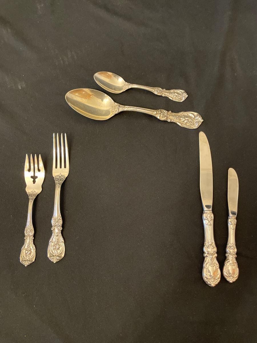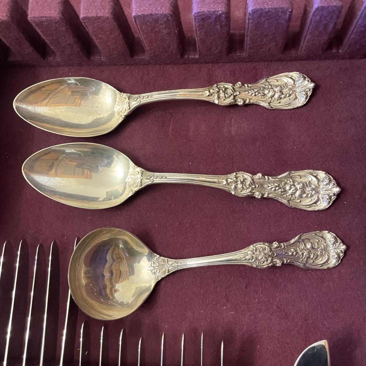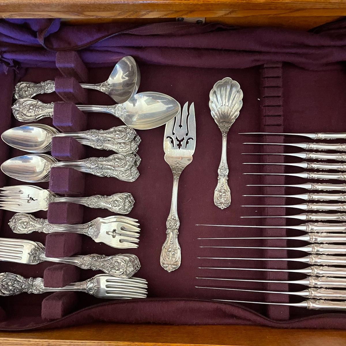 There are 53 sterling pieces of flatware for an eight person setting from Reed & Barton here that comes with a Gump's felt-like organizer tray. Flatware features Reed & Barton's Francis I pattern. Lot includes 8 each of dinner knives, small knives, dinner forks and salad forks plus 16 teaspoons, a butter knife, 2 large serving spoons, a soup ladle and a salad serving fork.