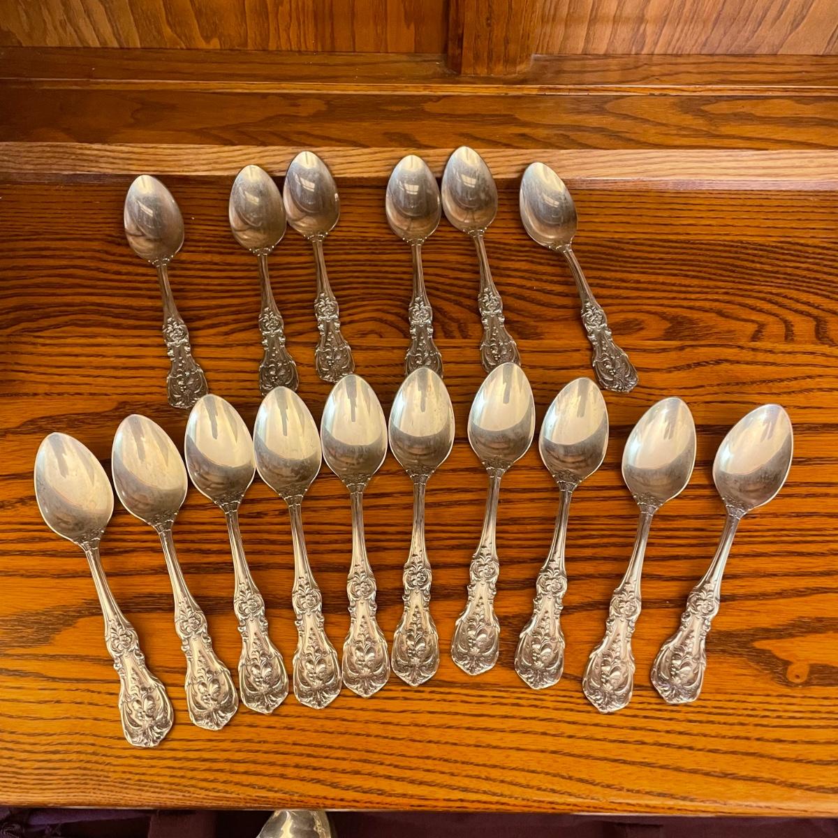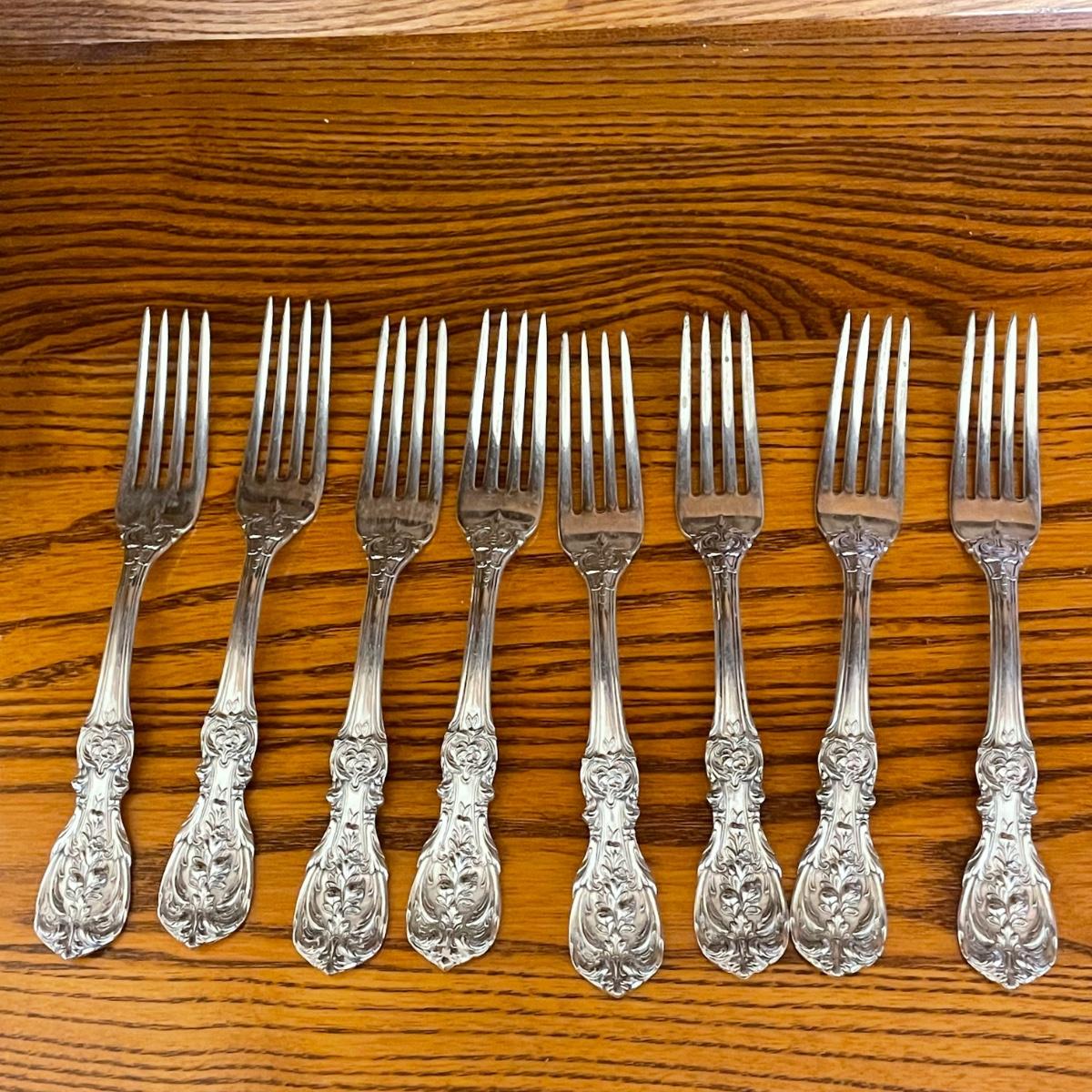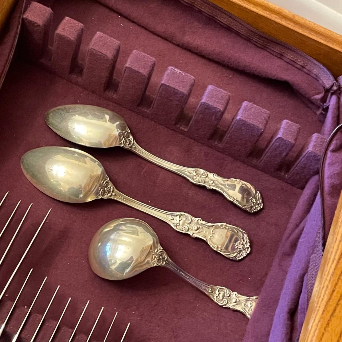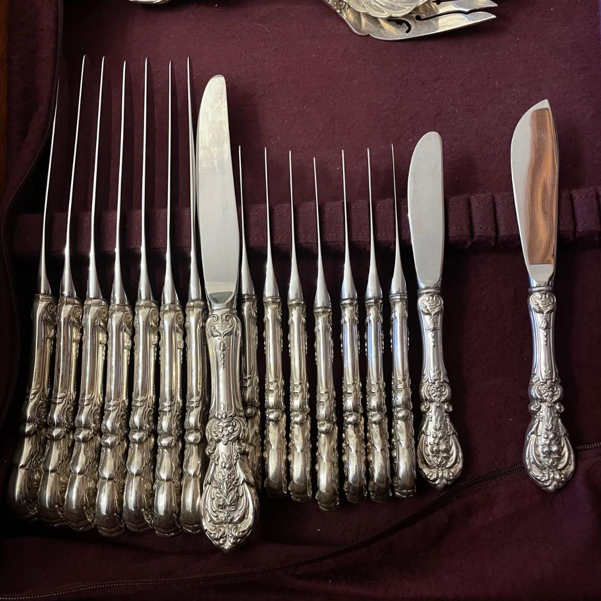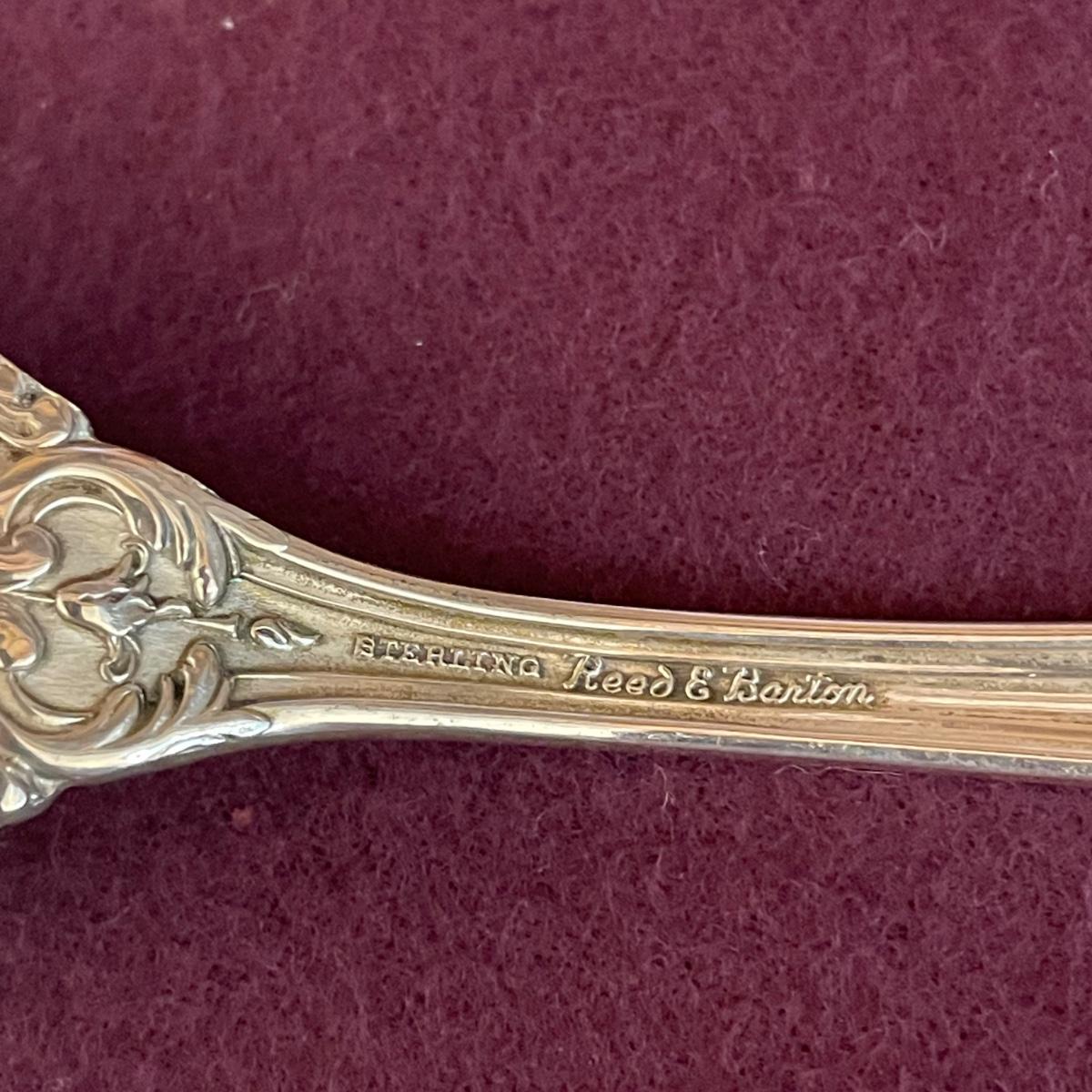 There are 53 sterling pieces of flatware for an eight person setting from Reed & Barton here that comes with a Gump's felt-like organizer tray. Flatware features Reed & Barton's Francis I pattern. Lot includes 8 each of dinner knives, small knives, dinner forks and salad forks plus 16 teaspoons, a butter knife, 2 large serving spoons, a soup ladle and a salad serving fork.