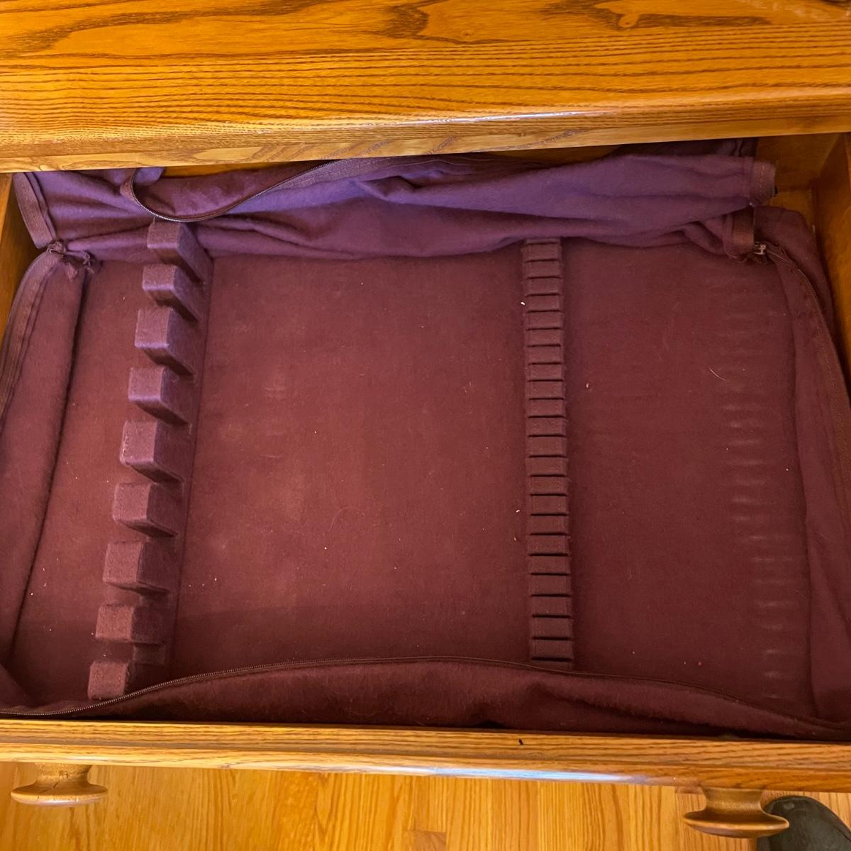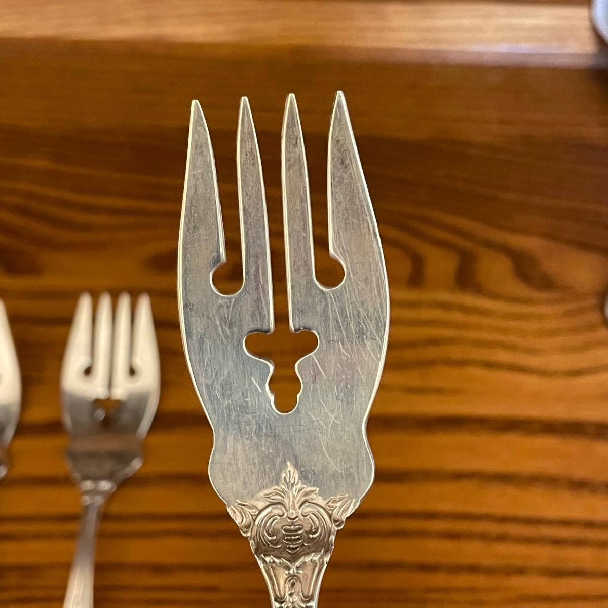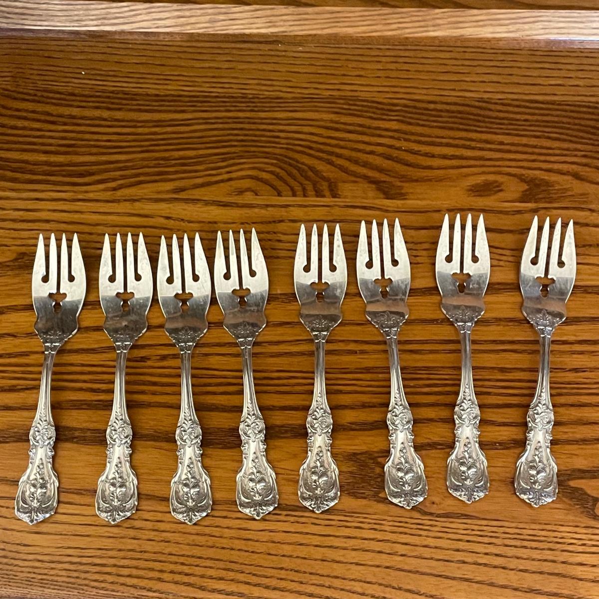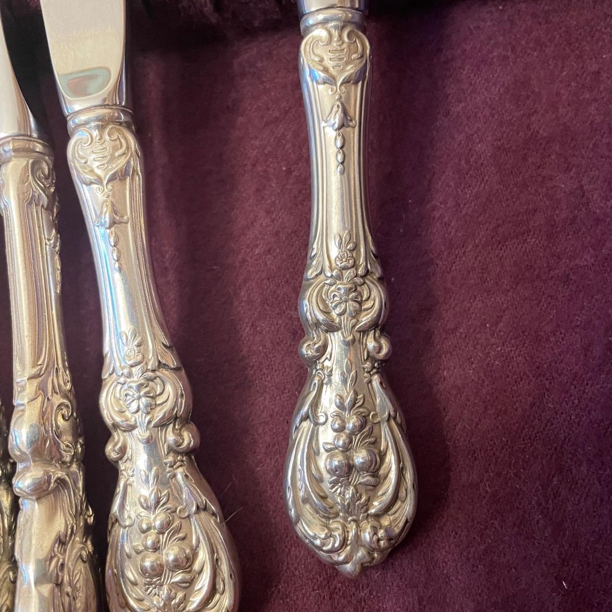 There are 53 sterling pieces of flatware for an eight person setting from Reed & Barton here that comes with a Gump's felt-like organizer tray. Flatware features Reed & Barton's Francis I pattern. Lot includes 8 each of dinner knives, small knives, dinner forks and salad forks plus 16 teaspoons, a butter knife, 2 large serving spoons, a soup ladle and a salad serving fork.