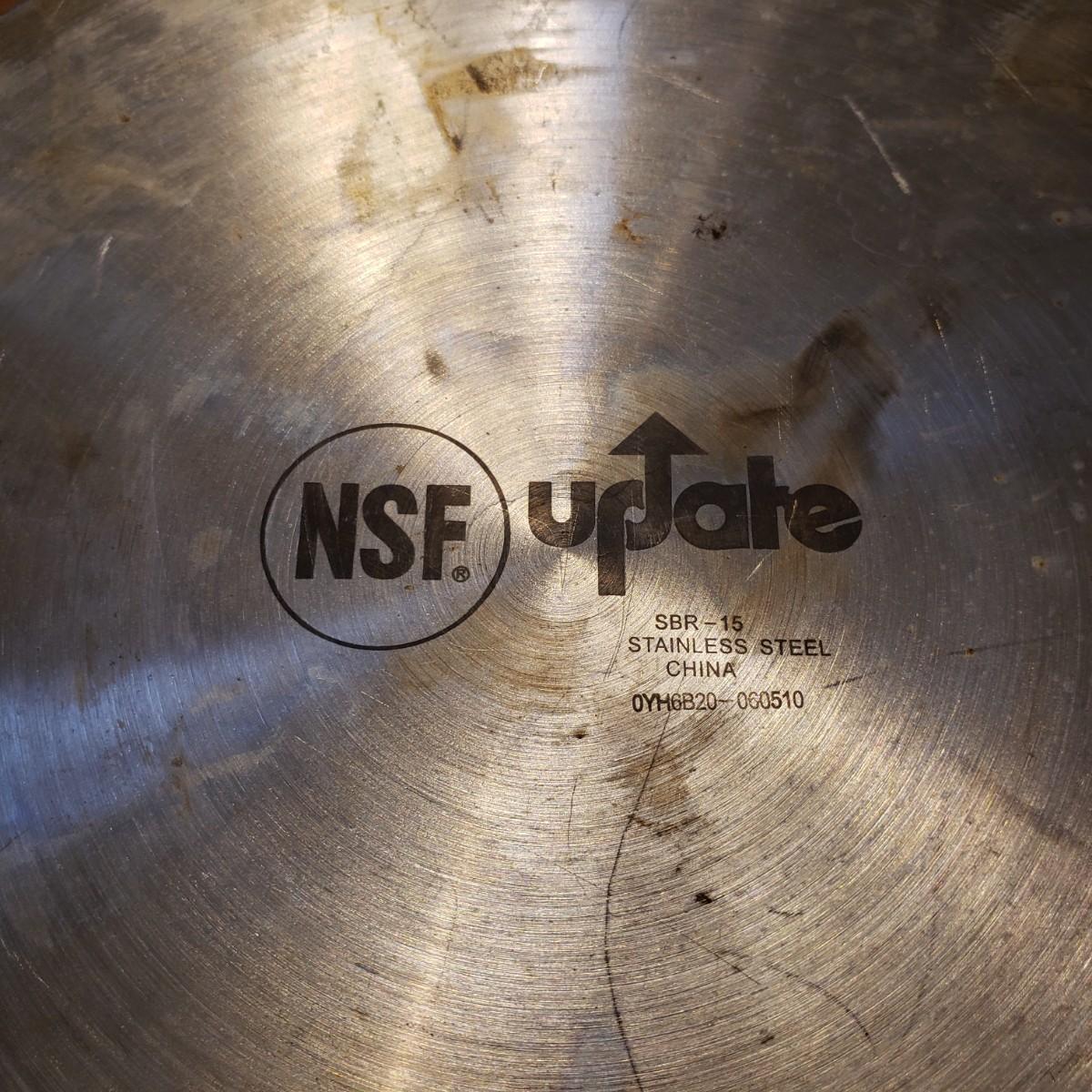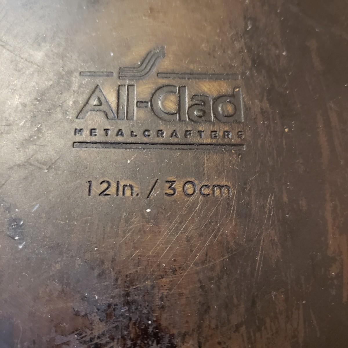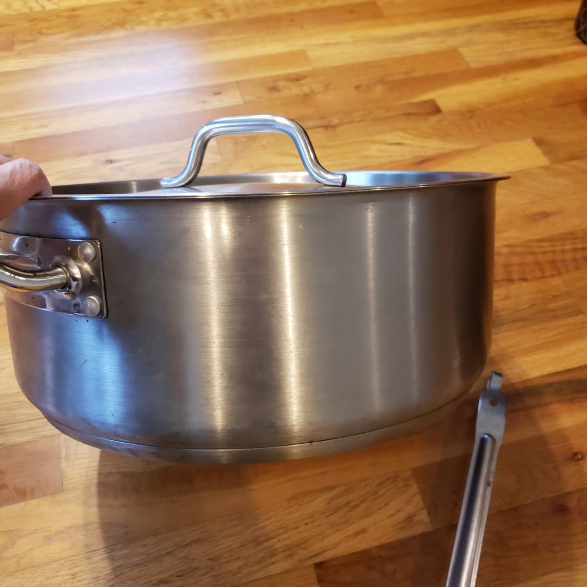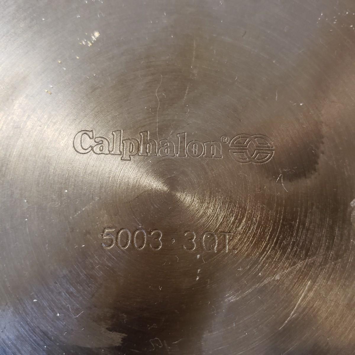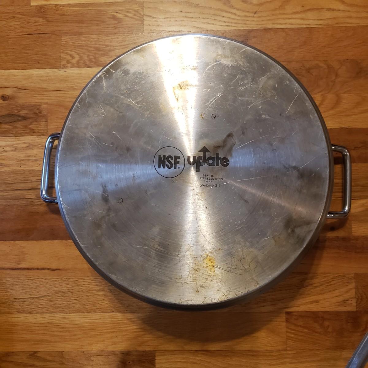 This is an eight piece variety of pots and pans from Calphalon, All-Clad and NSF, with an added bonus large stainless spoon. The pots range in sizes from the very large NSF pot with lid measuring 15" x 6". There is a dent in the lid, see pictures. Some pots have some blemishes. See pictures for sizes and condition.