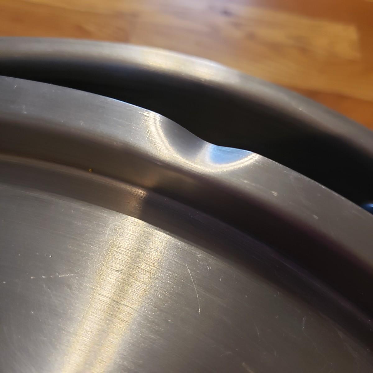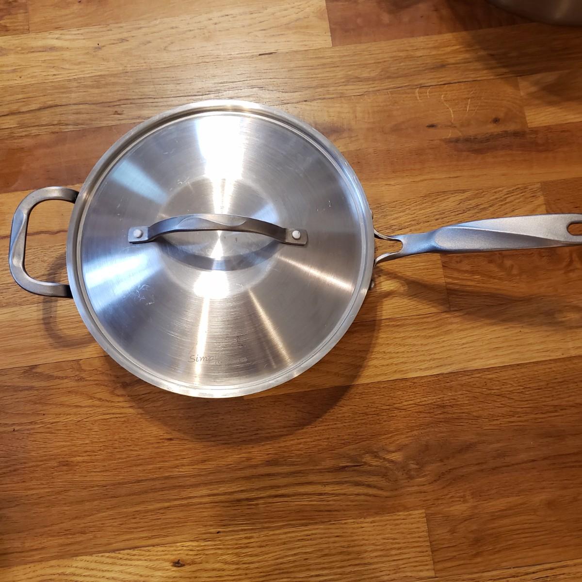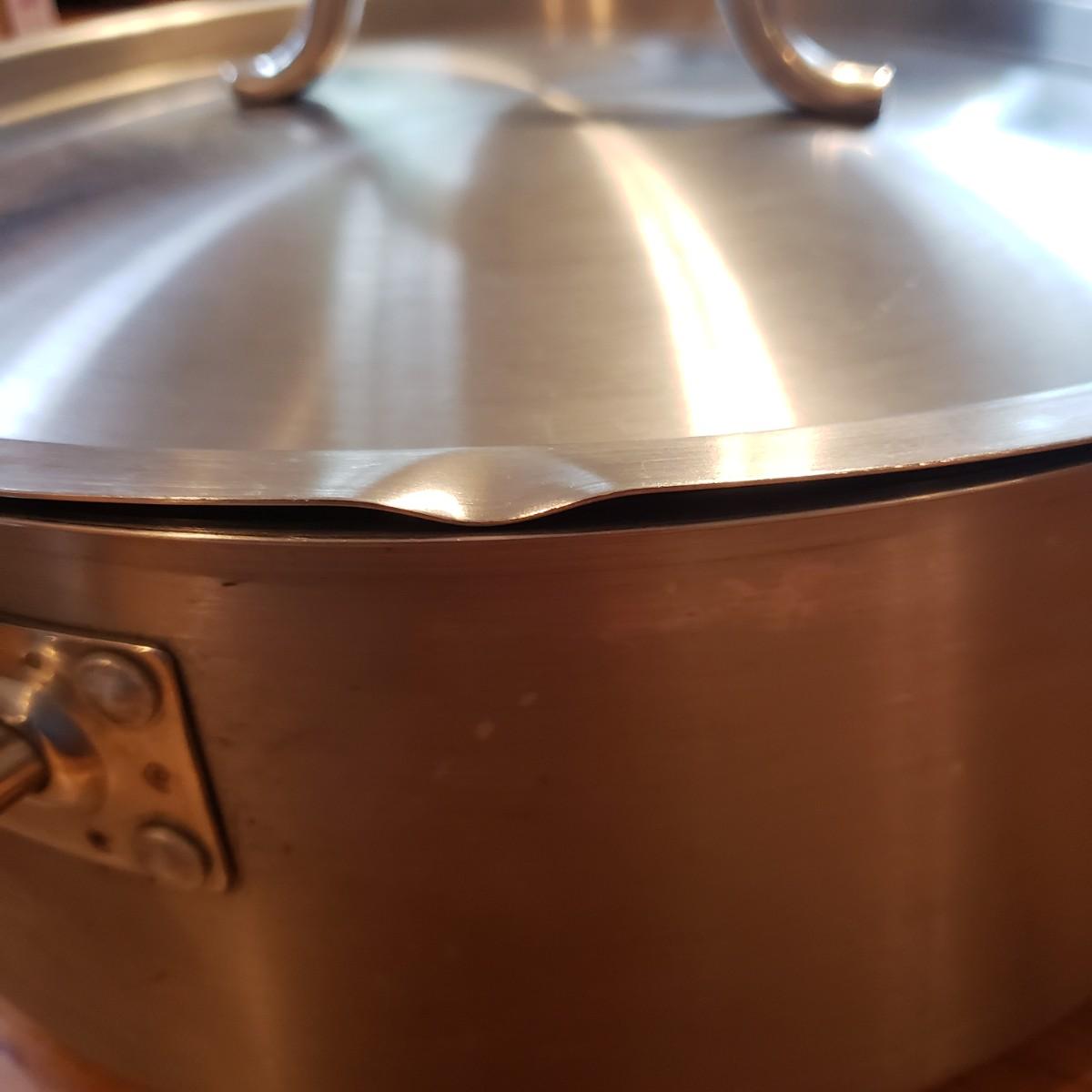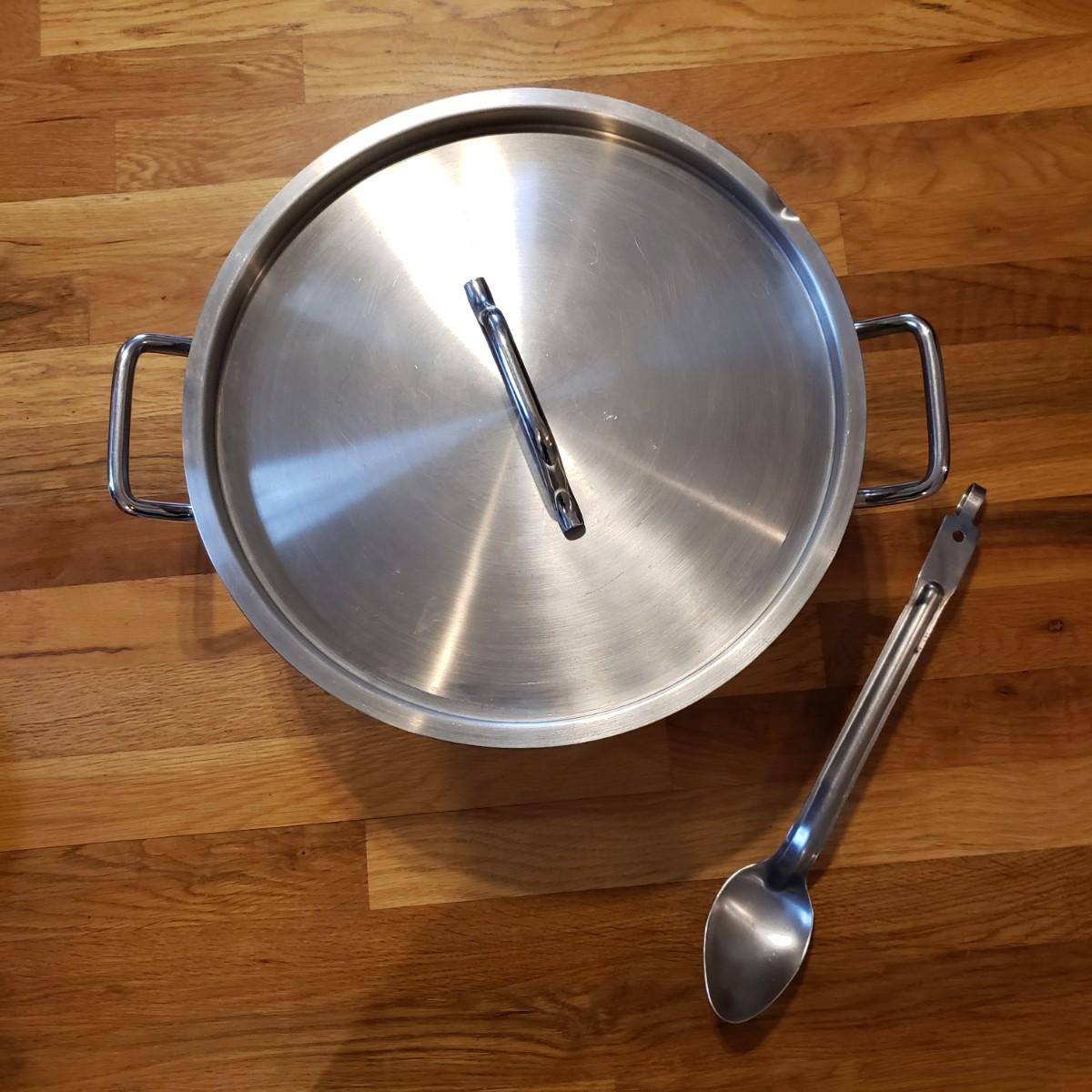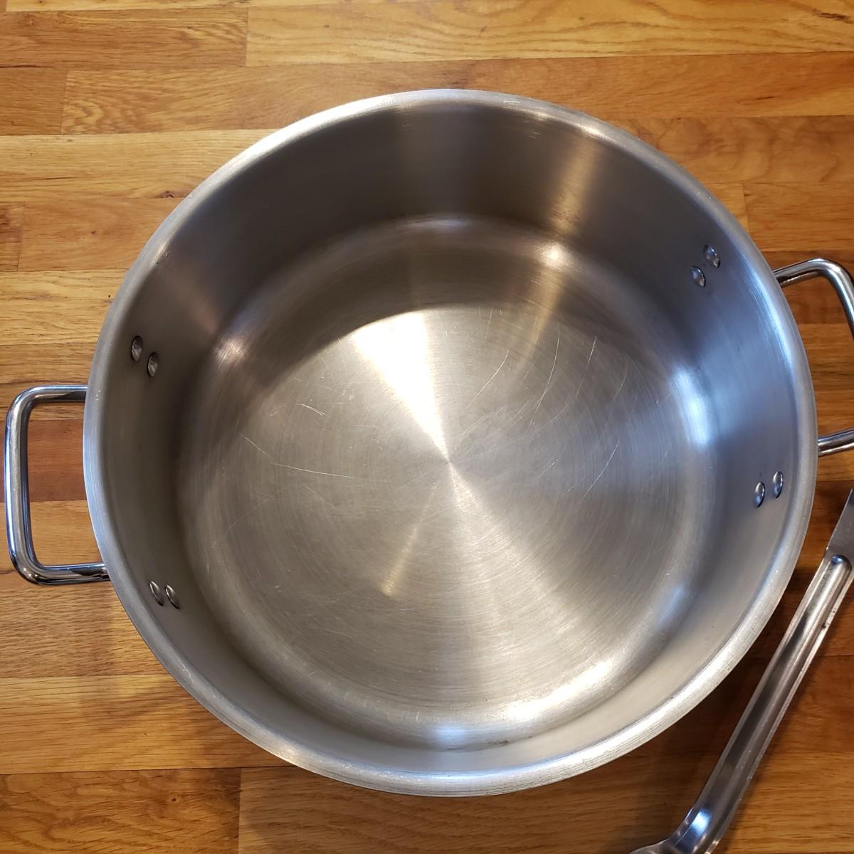 This is an eight piece variety of pots and pans from Calphalon, All-Clad and NSF, with an added bonus large stainless spoon. The pots range in sizes from the very large NSF pot with lid measuring 15" x 6". There is a dent in the lid, see pictures. Some pots have some blemishes. See pictures for sizes and condition.