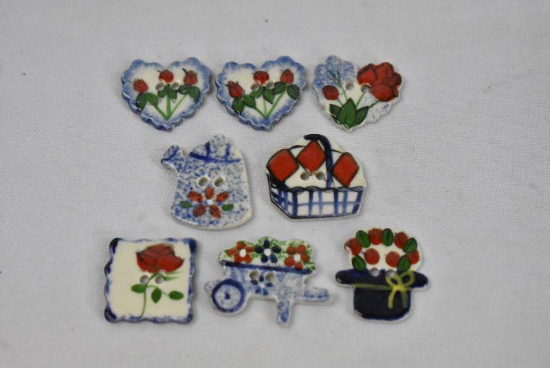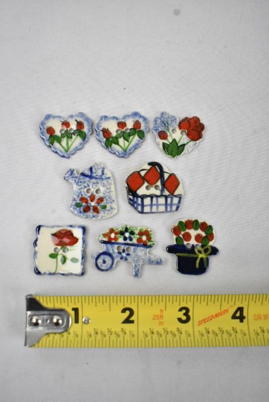 8 Piece Porcelain Hand Painted Buttons, Blue & Red Floral