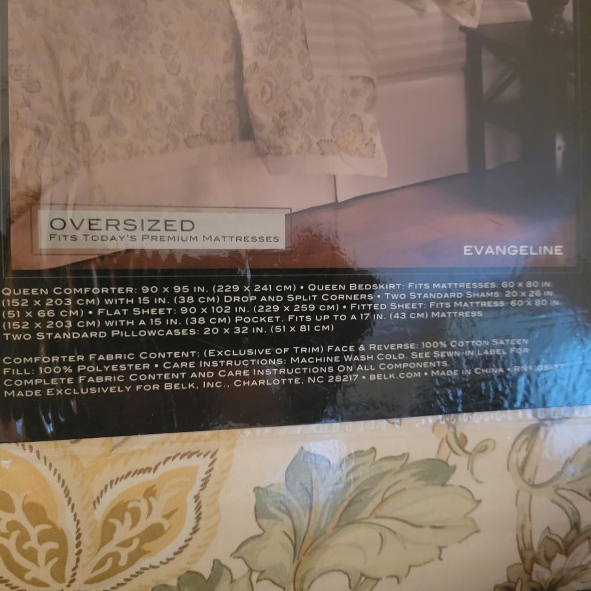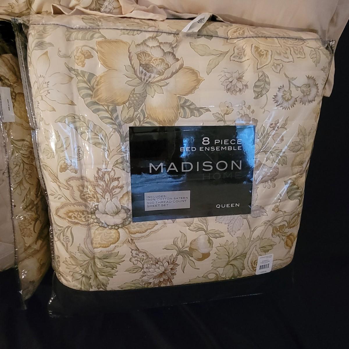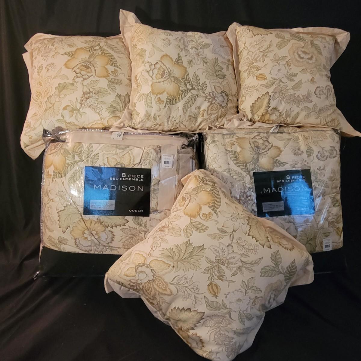Two matching 8 piece queen bed sets. Each set includes oversized comforter, 4 piece sheet set, 2 shams and a bedskirt. Also includes 4 matching pillows. All are new and unused.