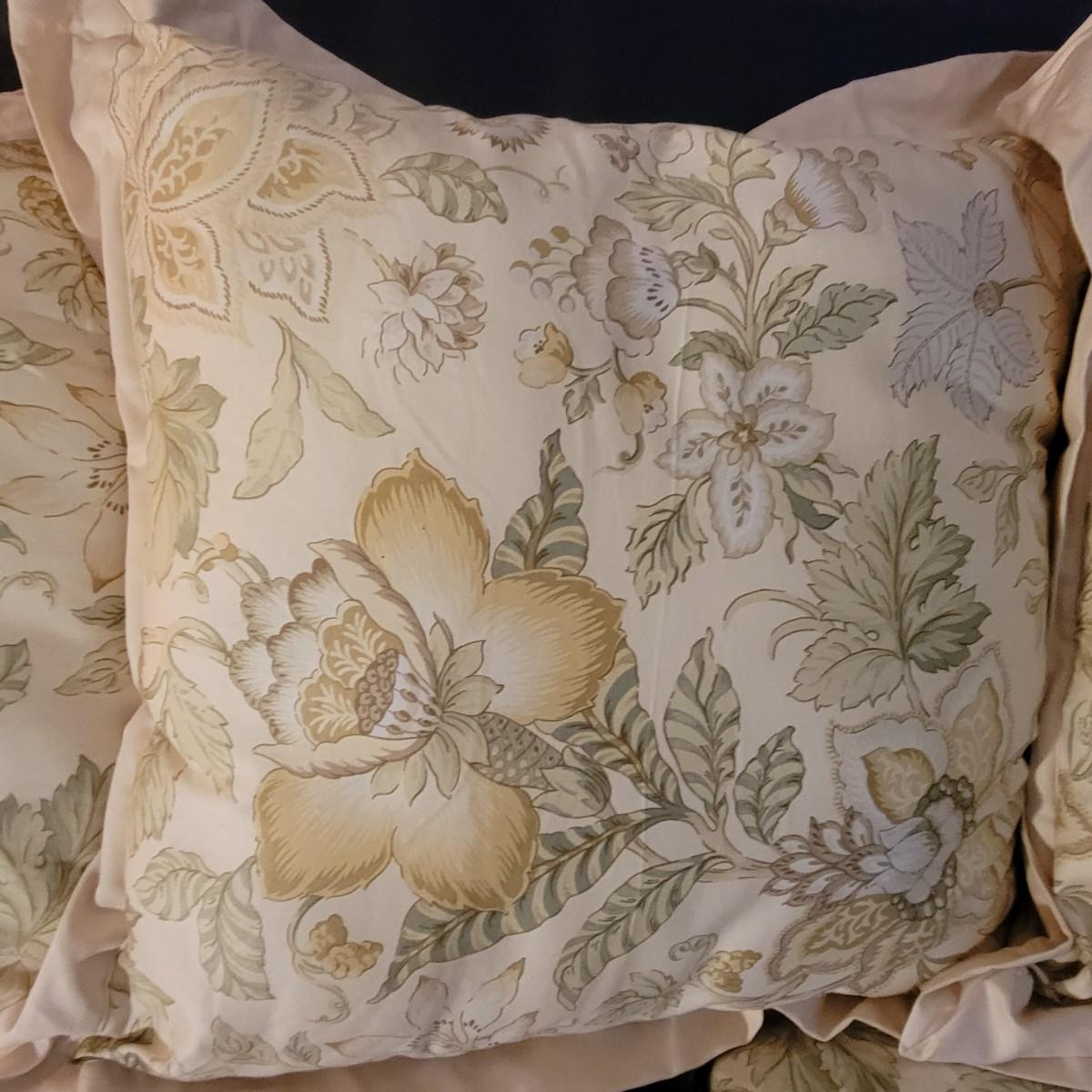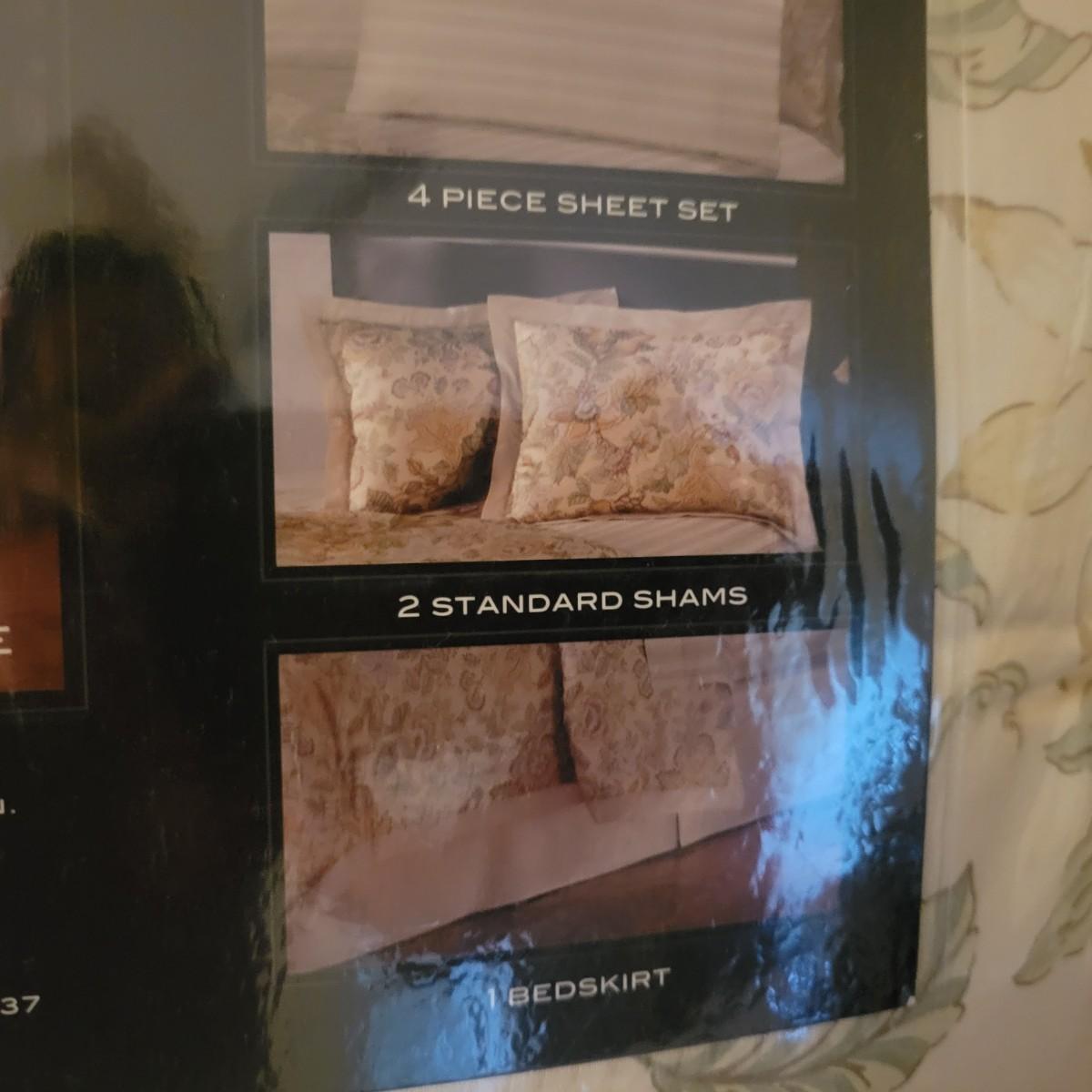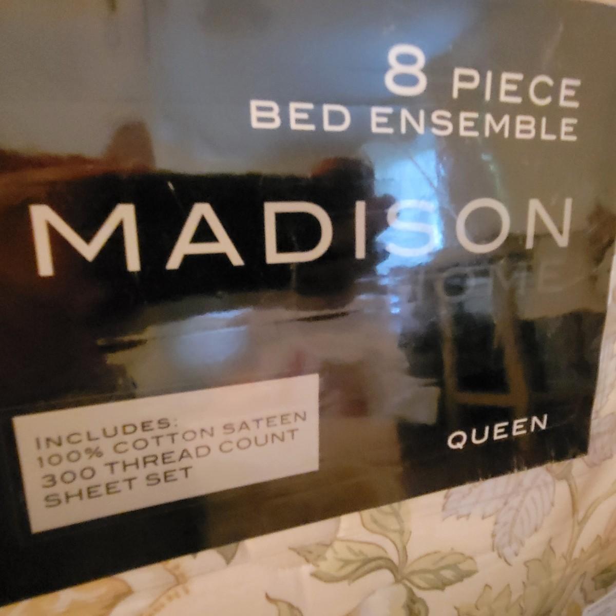 Two matching 8 piece queen bed sets. Each set includes oversized comforter, 4 piece sheet set, 2 shams and a bedskirt. Also includes 4 matching pillows. All are new and unused.