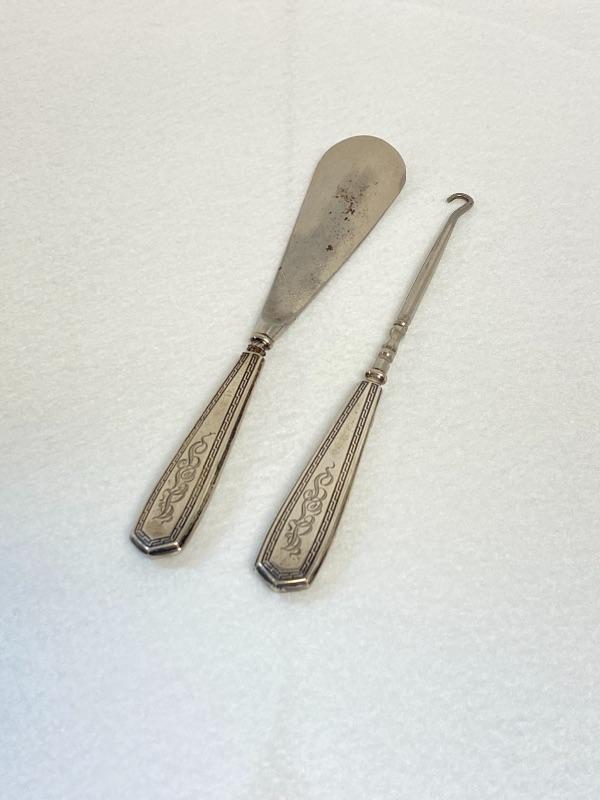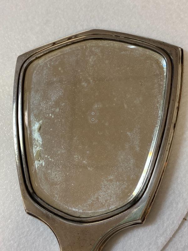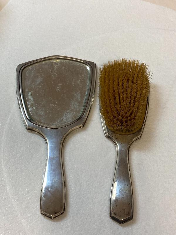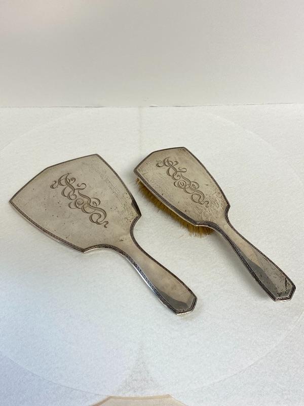 Shoe Horn, Button Hook, 7” Garment Brush, 5.5” Garment Brush, 3.25 x 4.5” Lidded glass jar, 3.35” x 4.5” Lidded Cotton Ball Jar, 9” Hair Brush, 10” Mirror