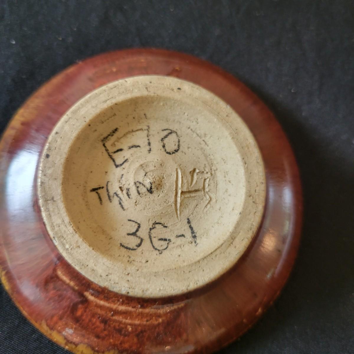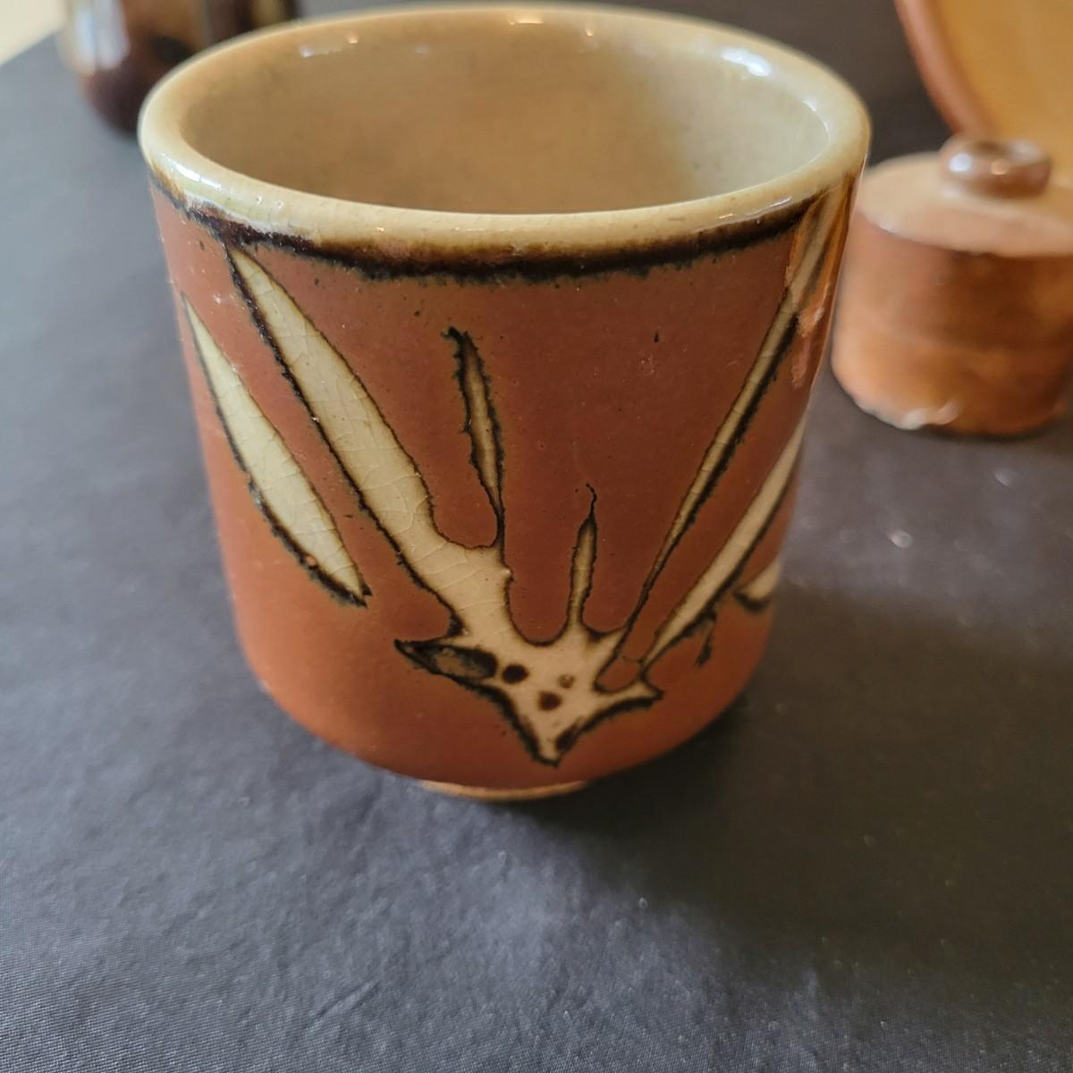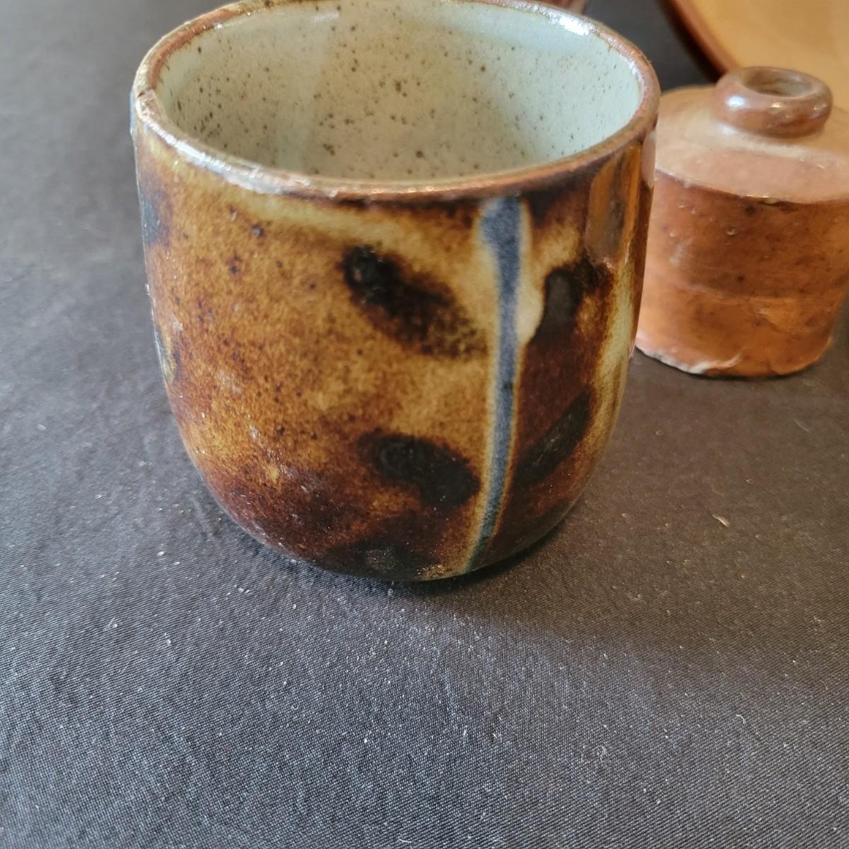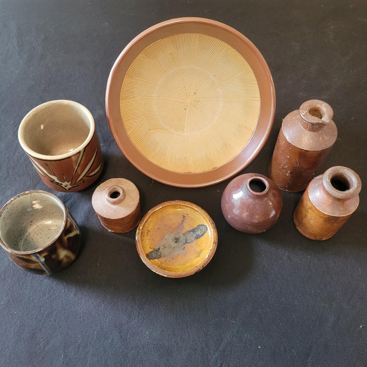 An assortment of glazed pottery pieces. No notable chips or damage on any of them. two cups, four jugs, a small saucer and a bowl. Bowl measures approximately 7.5" x 3" and has a textured interior. A few pieces are signed. Shipping available