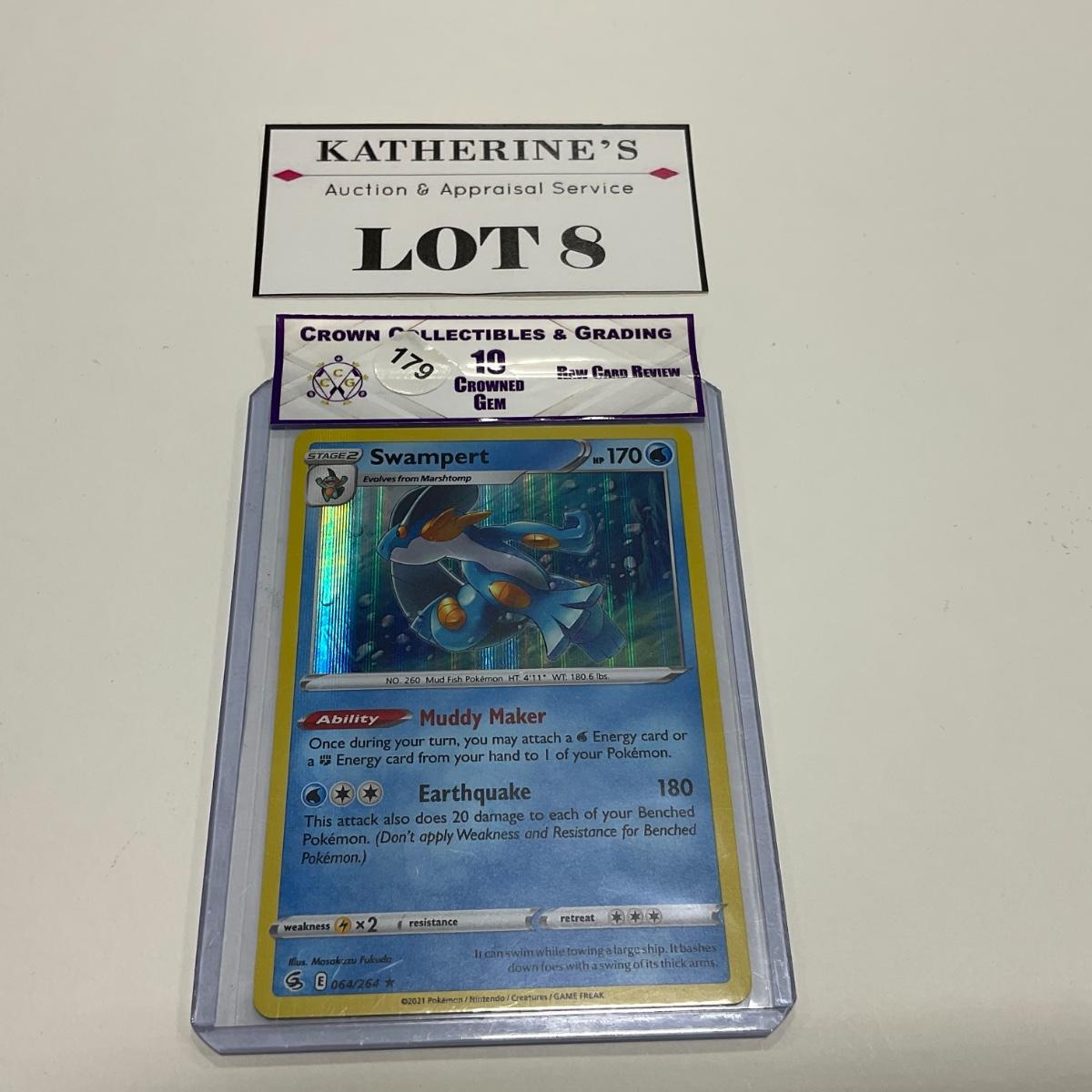 One 2021 Swampert Crowned Gem Raw card review 10. Please see photos for details and condition. ::: Shipping is available on this lot. If you require shipping you must let us know at the close of the auction. We will coordinate with you after the item has been won. Shipping fees will include insurance up to or exceeding the value of all items being mailed. If you have any questions regarding this lot please contact the auctioneer either via this website, by direct email or by phone. PICK UP TIMES and other important information can be found in the TERMS and DESCRIPTION of the auction. Please take a look for pertinent information. Thanks!