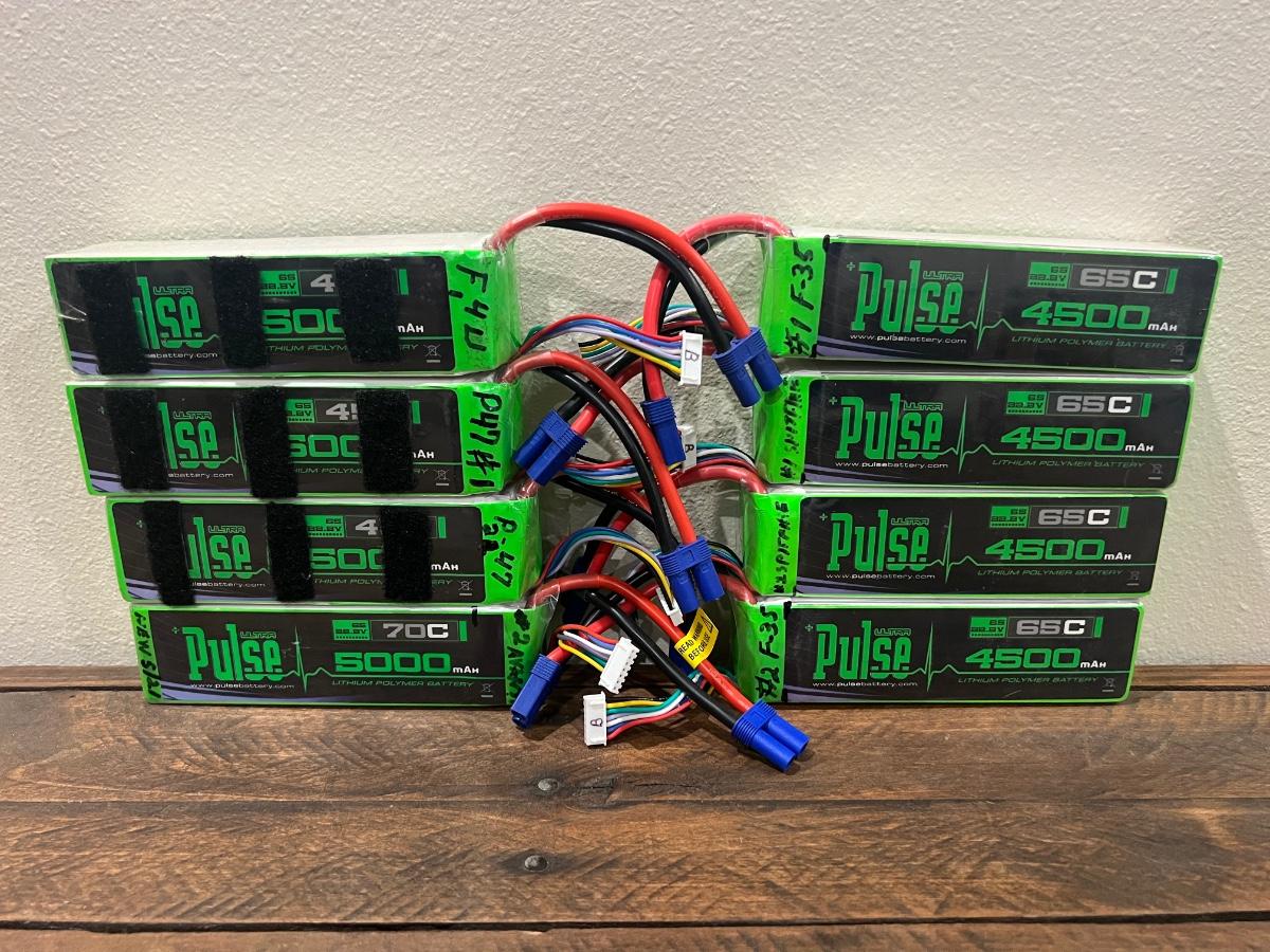 Lot of (4) Pulse 5000 batteries and (4) Pulse 4500 batteries. All tested good 4 months ago at local airfield but are being sold AS-IS.