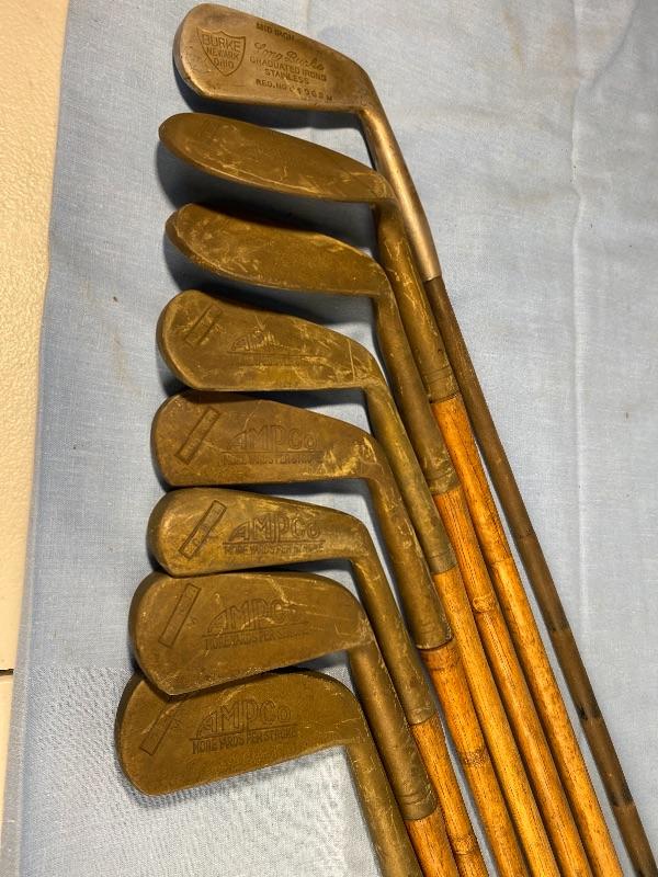 8 Rare Antique AMPCO and BURKE Hickory Shafts Golf Clubs