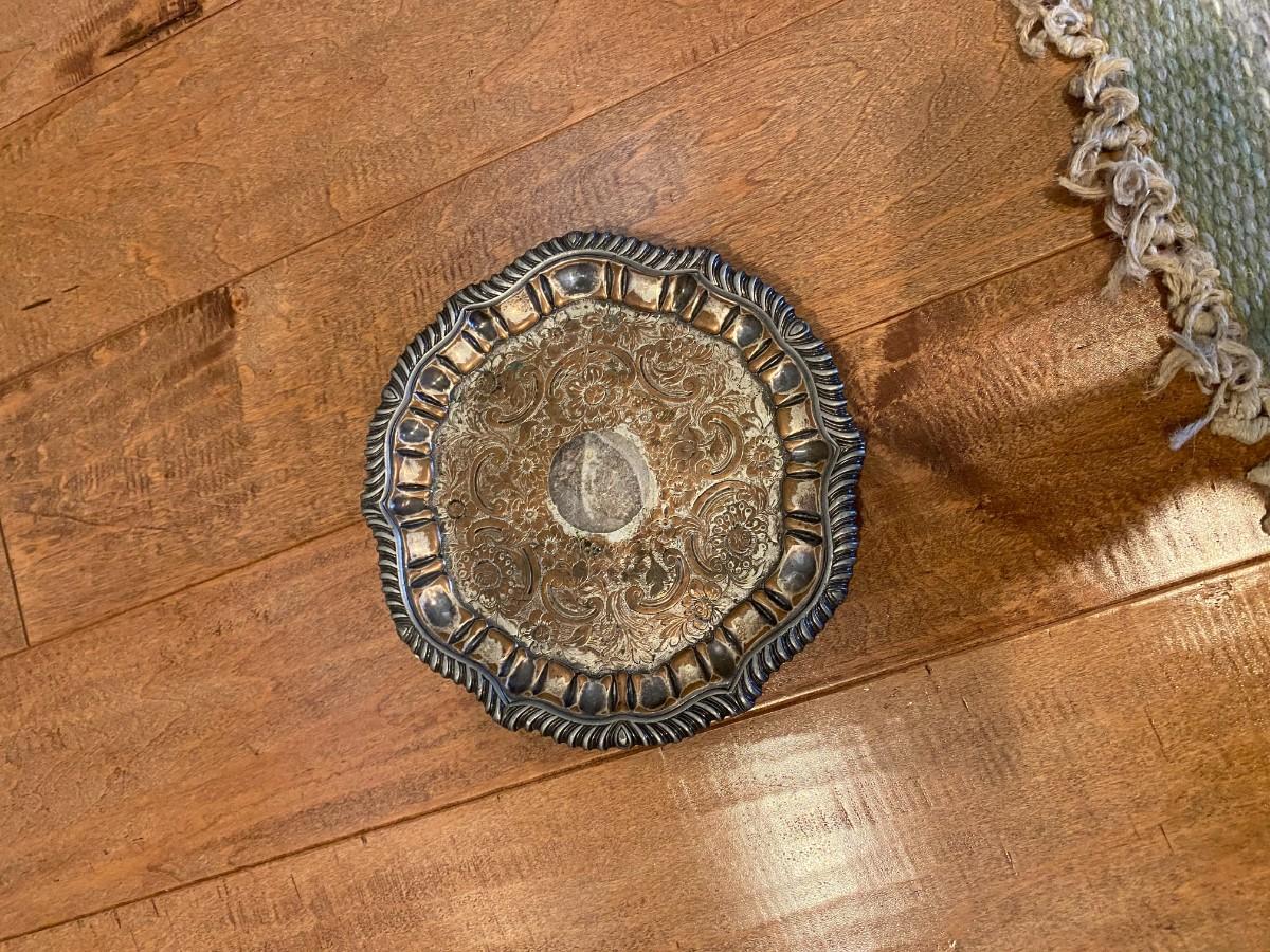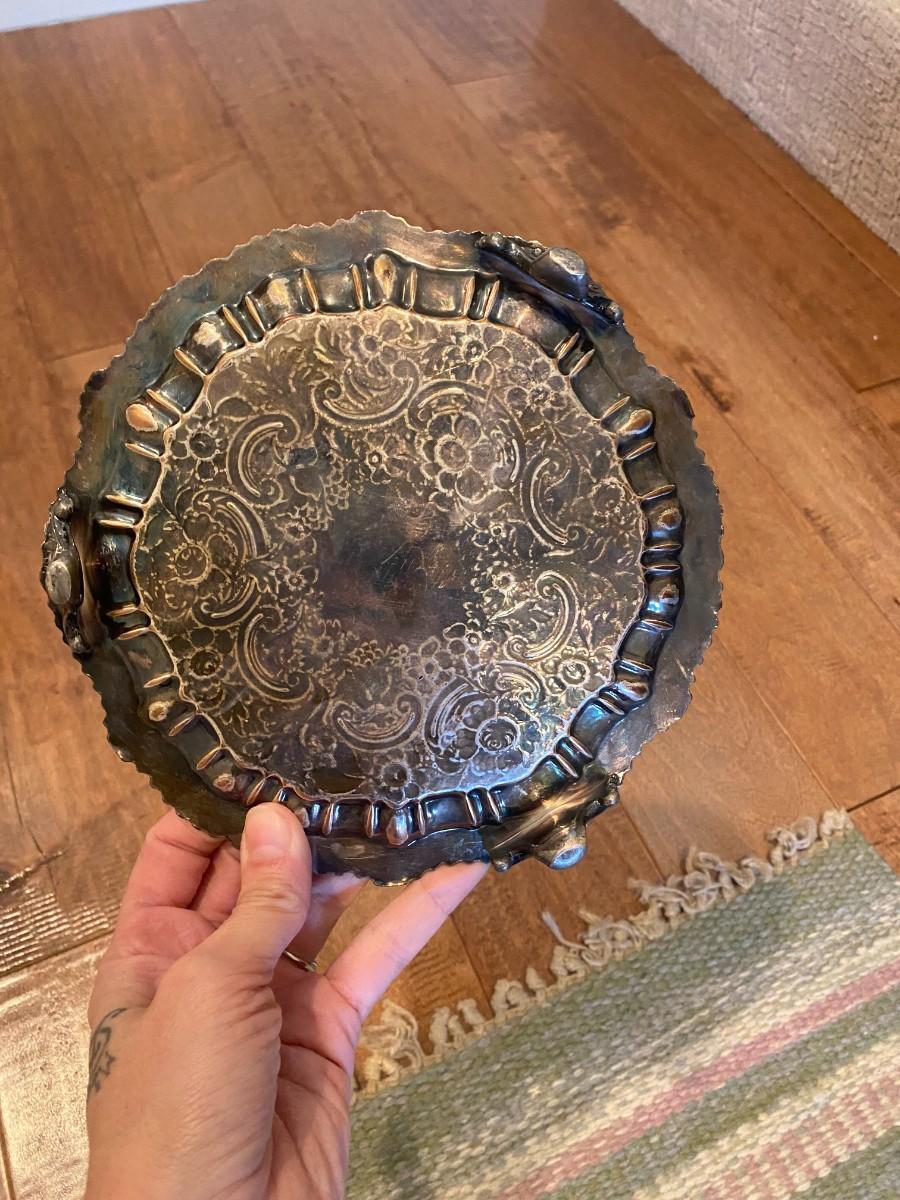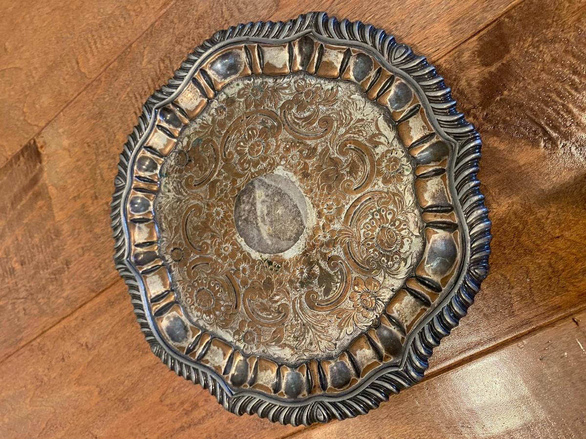 8” round footed silver plate card tray.