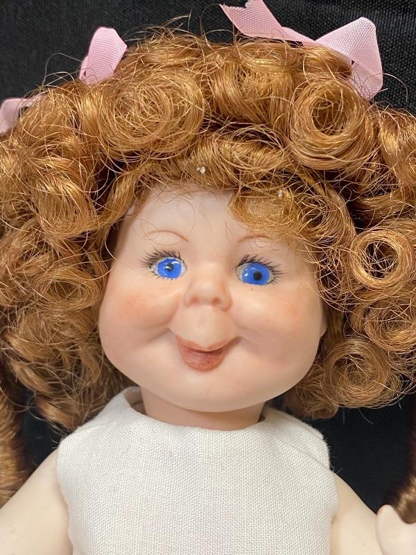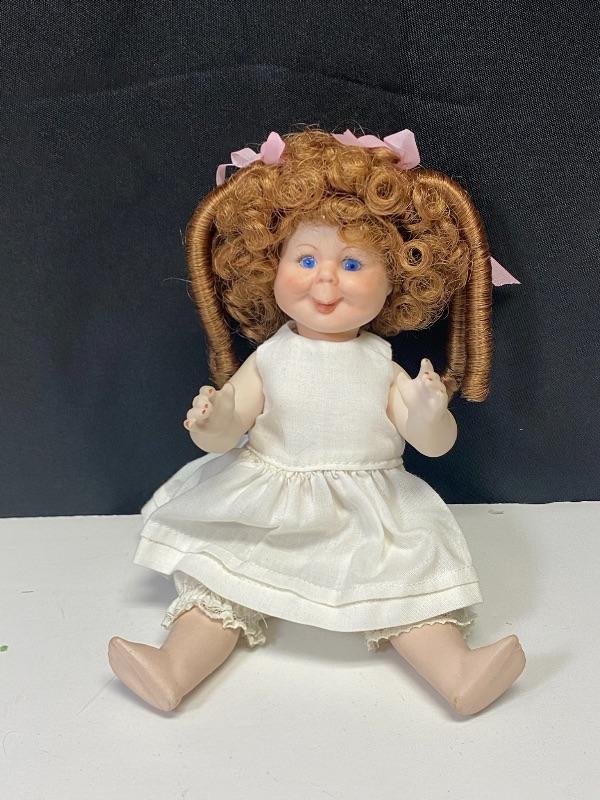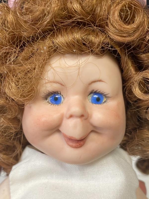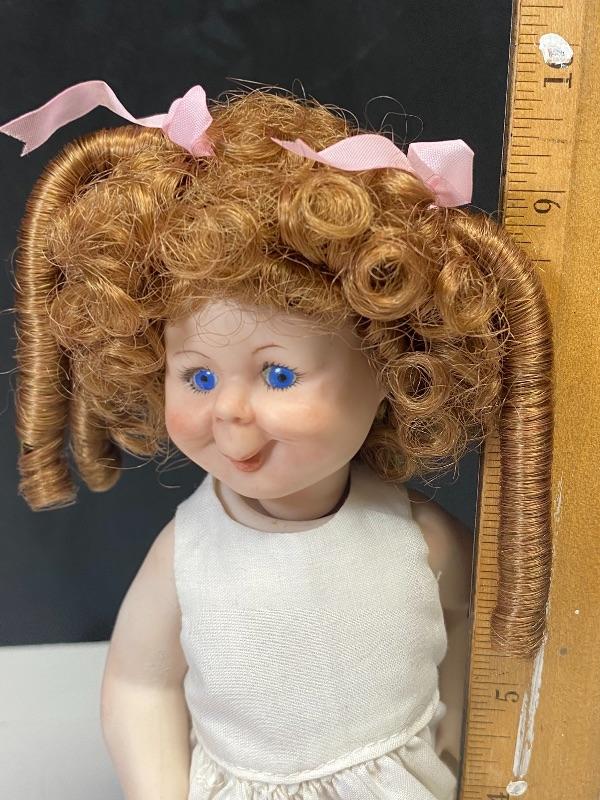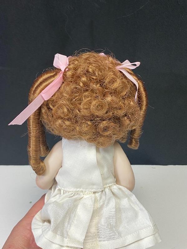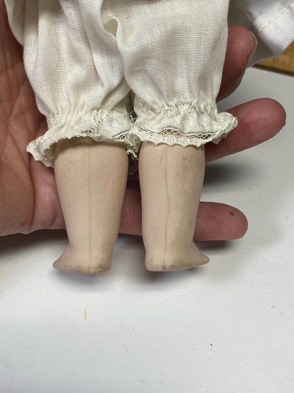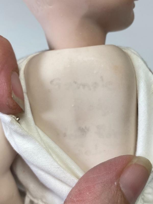 Small 8" Simon & Halbig bisque doll. Blue glass eyes with an extra curly wig. Back of head is marked Greta K⭐R #124. Jointed body, faintly marked "Sample not for Sale" on her back. Good condition.