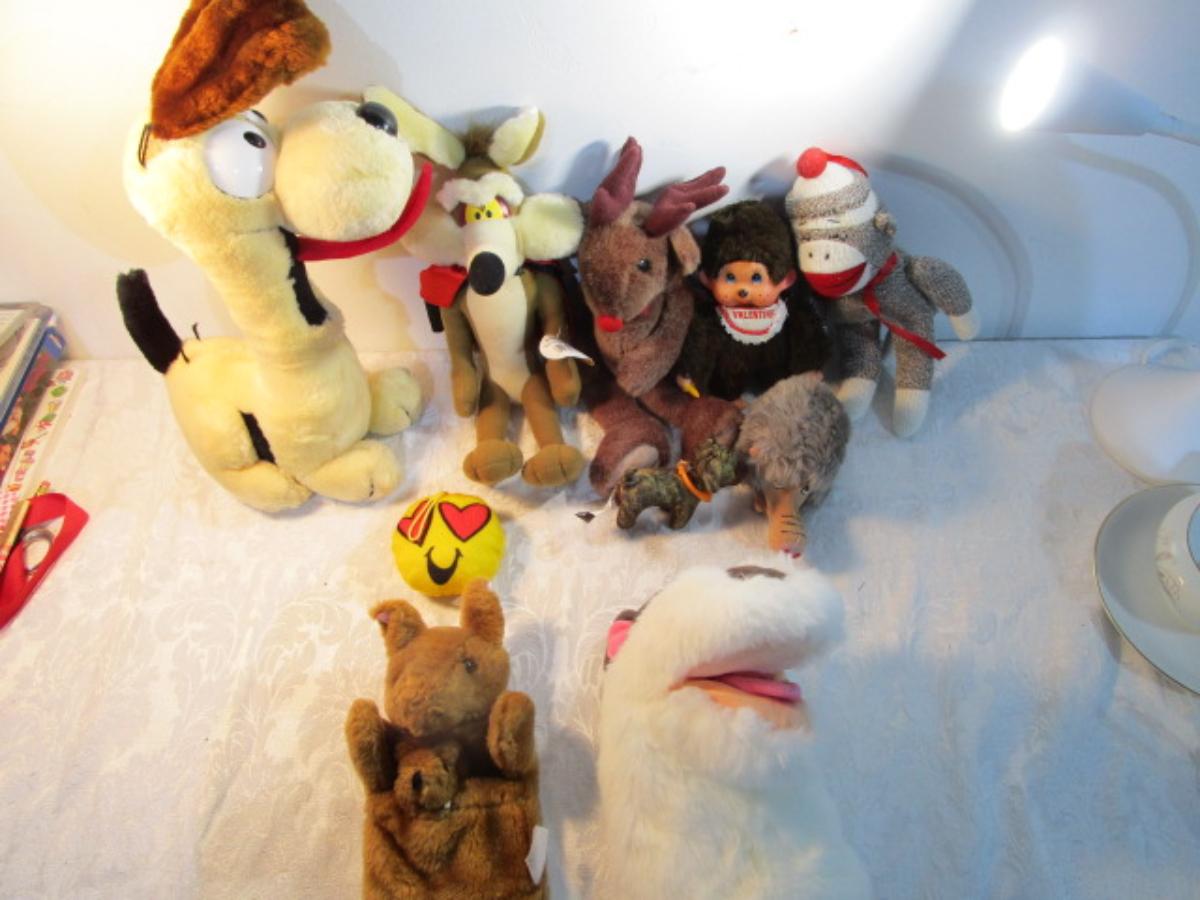 Wily Coyote, Odie, reindeer, monkey, sock monkey, dog, stuffed Smiley , kangaroo & dog puppets