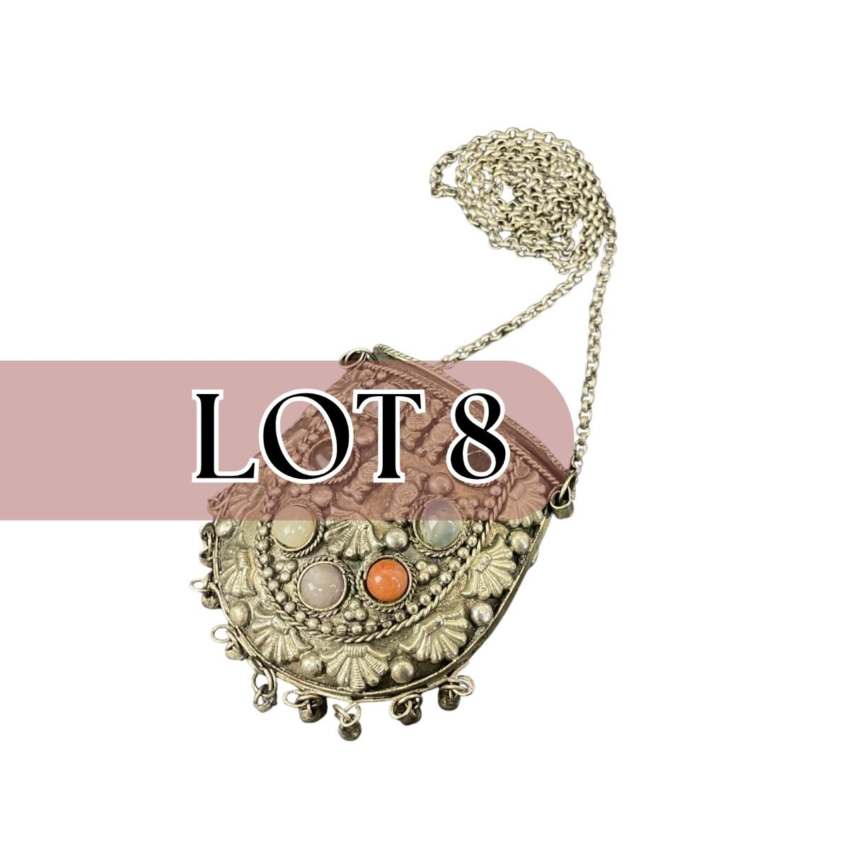 One vintage 1960’s mini Sajai Tibetan metal purse with polished stone chunks. Please see photos for details and condition. Any condition statement is given as a courtesy to a client, is an opinion, and should not be treated as a statement of fact. Reference to condition written, oral or within a condition report shall not be regarded as a full account of condition and may not include all defects, alterations, or restorations. Absence of a condition report does not imply a lot is flawless or lacking imperfections or damage. Katherine’s Auction & Appraisal Service shall have no responsibility for any error or omission. Returns shall not be accepted on the basis of condition. ::: Shipping is available on this lot. If you require shipping you must let us know at the close of the auction. We will coordinate with you after the item has been won. Shipping fees will include insurance up to or exceeding the value of all items being mailed. If you have any questions regarding this lot please contact the auctioneer either via this website, by direct email or by phone. PICK UP TIMES and other important information can be found in the TERMS and DESCRIPTION of the auction. Please take a look for pertinent information. Thanks!