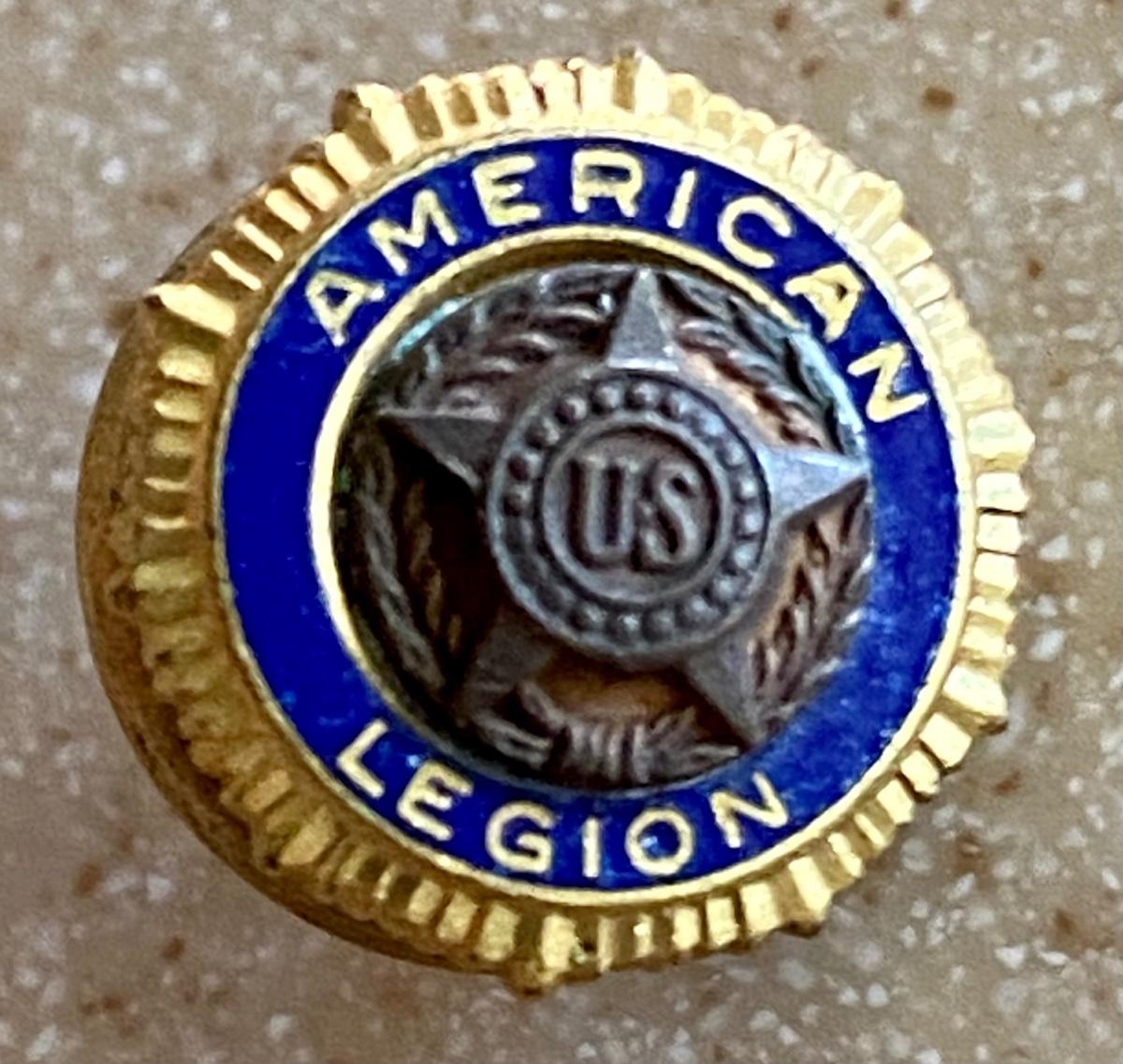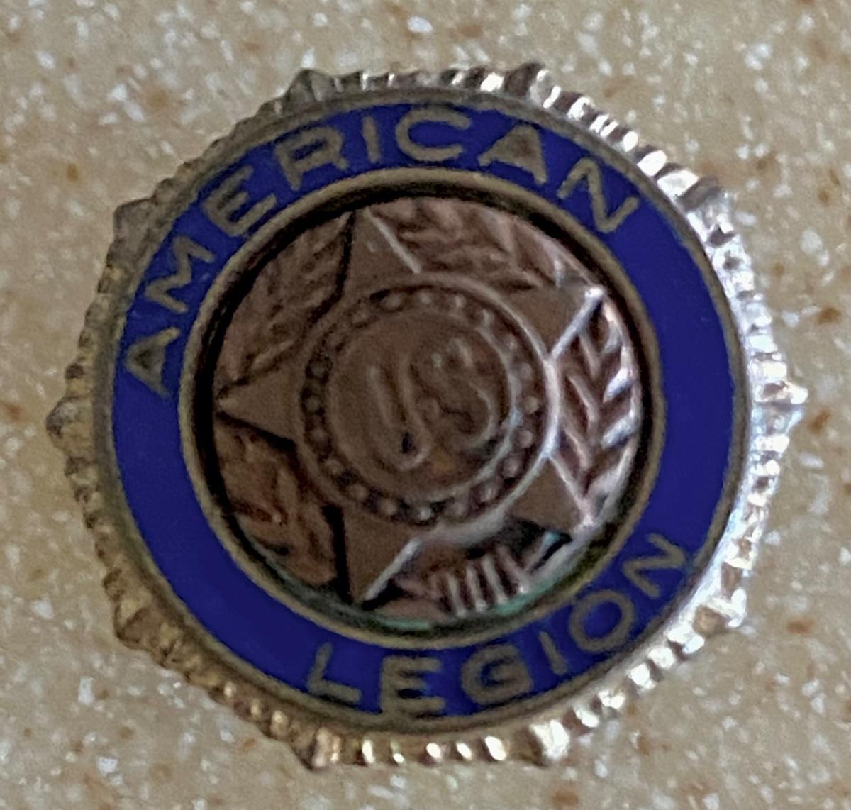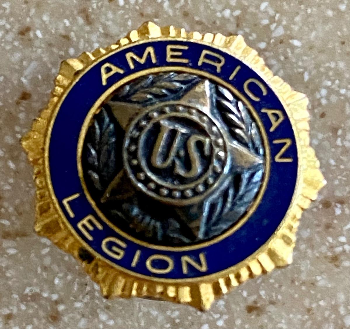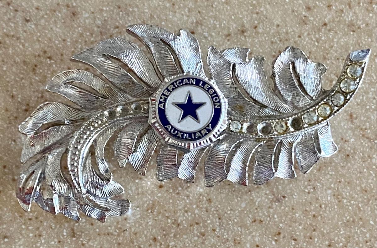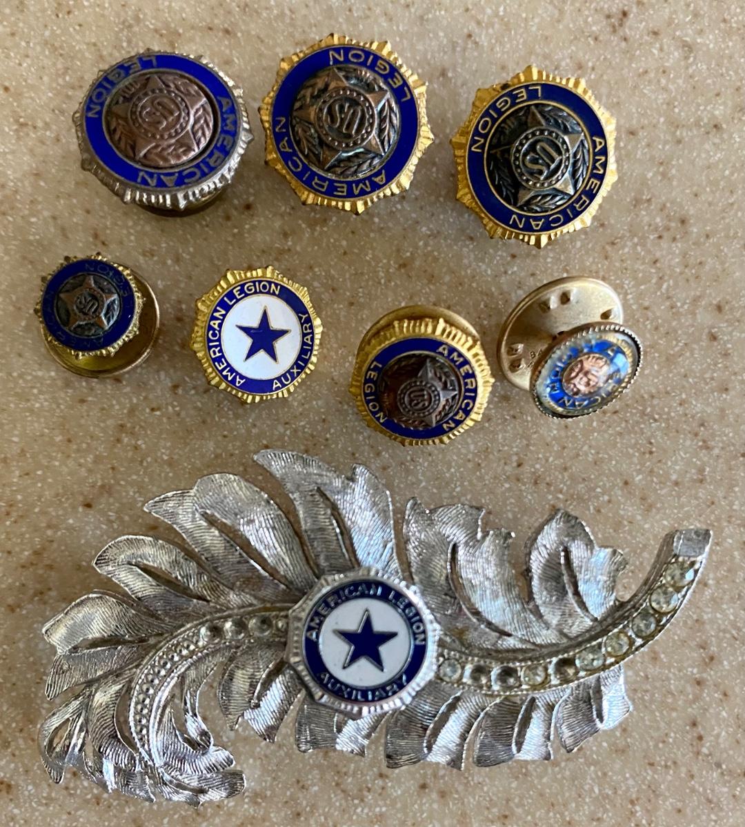 Lot includes 5 American Legion pins and 3 American Legion Auxiliary pins. The large silver pen is missing some of the stones.