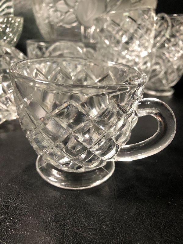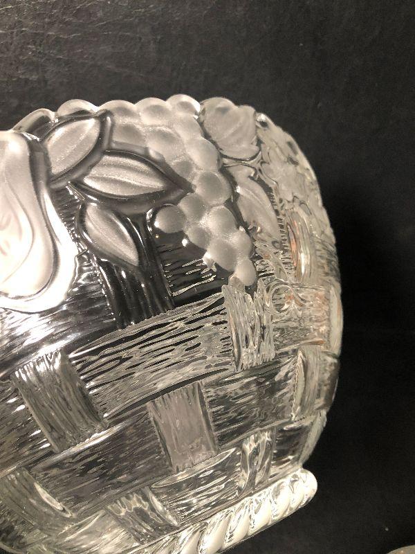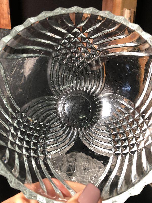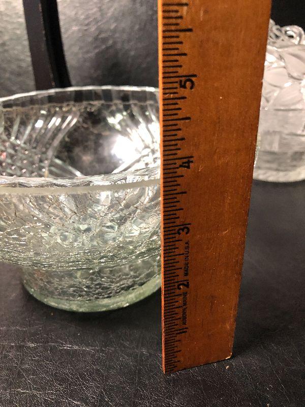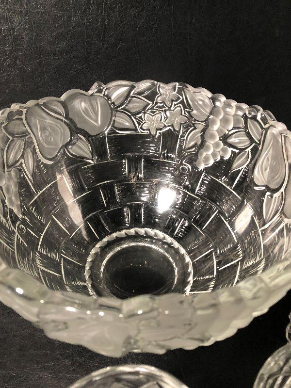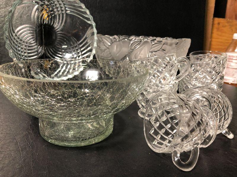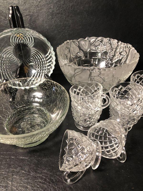 Lot includes large fruit bowl, crackel glass bowl, glasses and more *Please review all photos for condition and contents of lot.