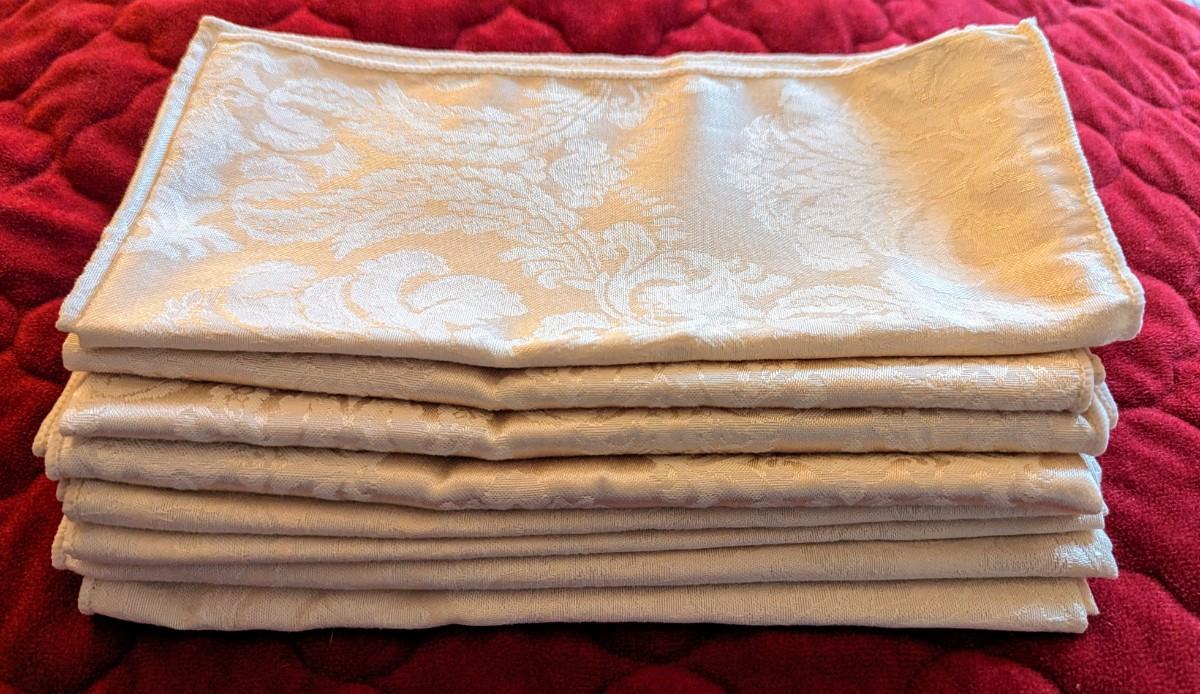 8 Vintage Cream Damask dinner napkins.