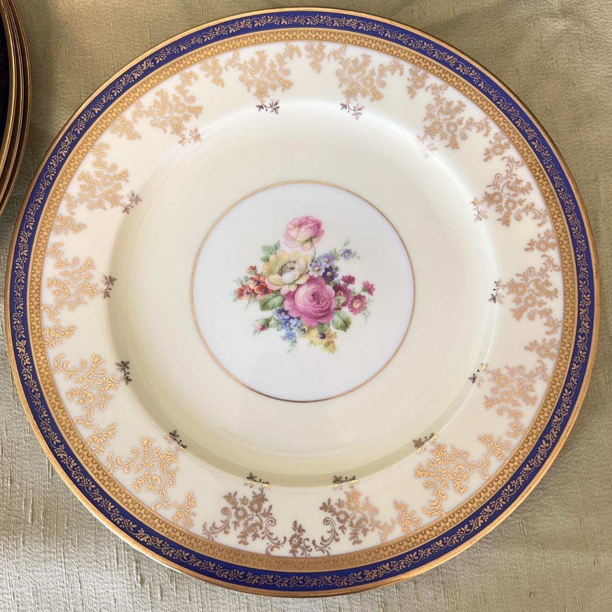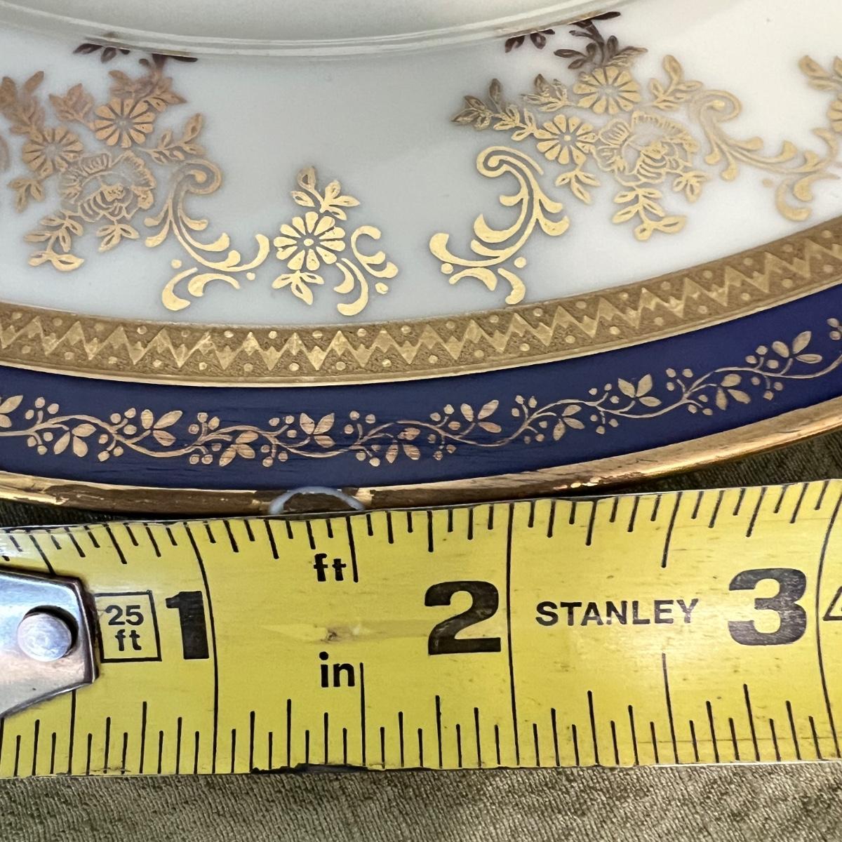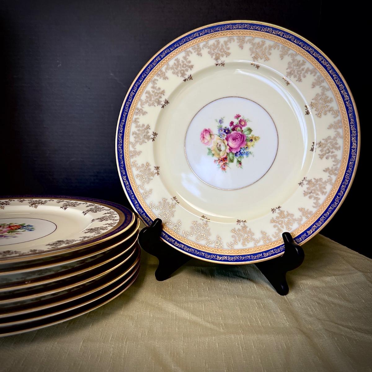 8 vintage Edgerton gold encrusted, blue band, floral center pattern E126-19. These plates are gorgeous! See second to last pic. Tiny chipped piece glued back on.