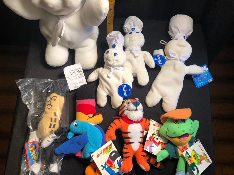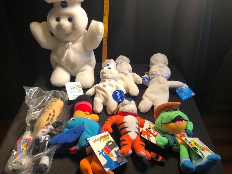 8 Vintage Food Themed Stuffed Animals - Mr Peanut, Tony The Tiger, Fruit Loop Toucan, Smacks Dig em, 3 smaller Pillsbury Doughboys, and 1 Large Pillsbury Doughboy - Lot 254