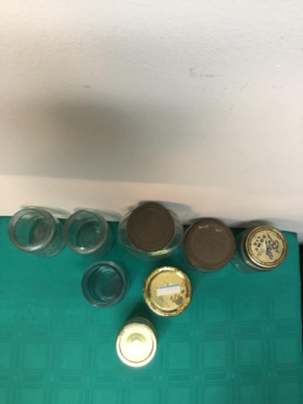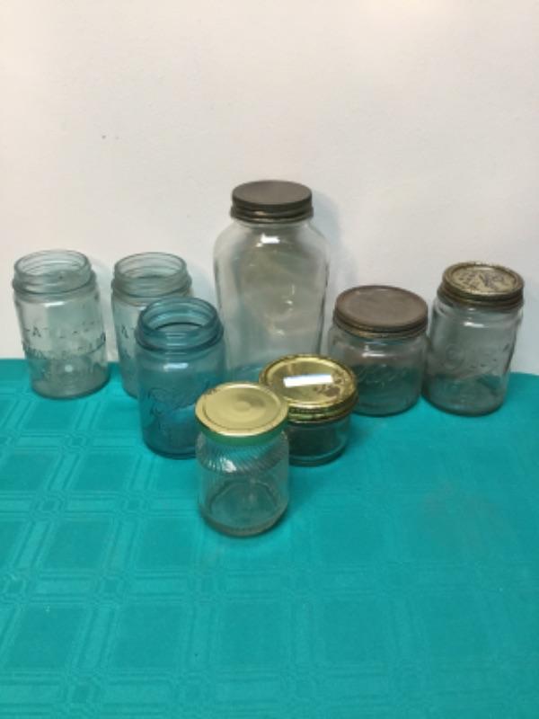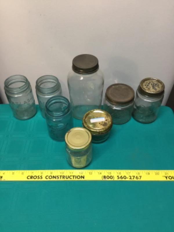 Eight vintage mason and canning jars of various sizes. Two are Atlas, two Kerr, two unmarked, one Ball, and one Drey, Five of these come with lids.