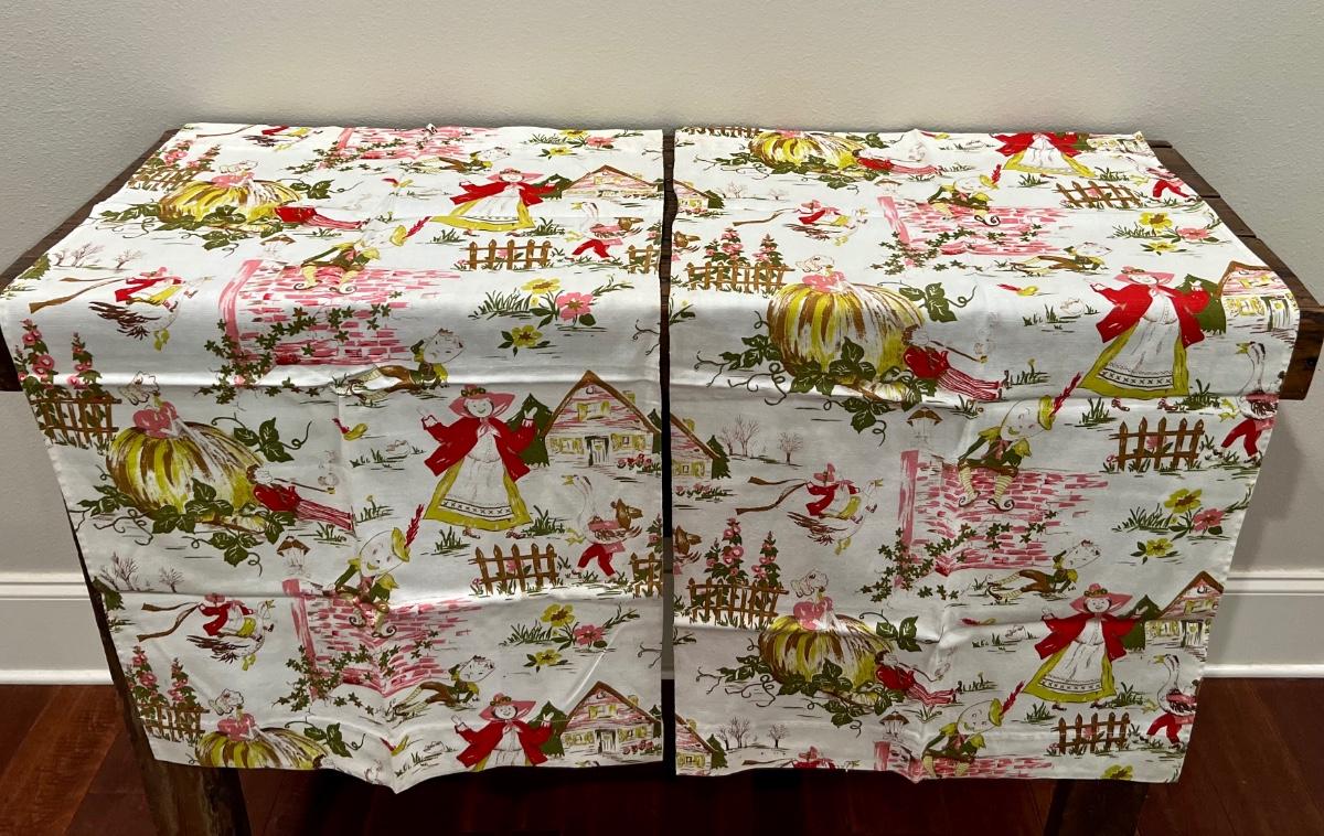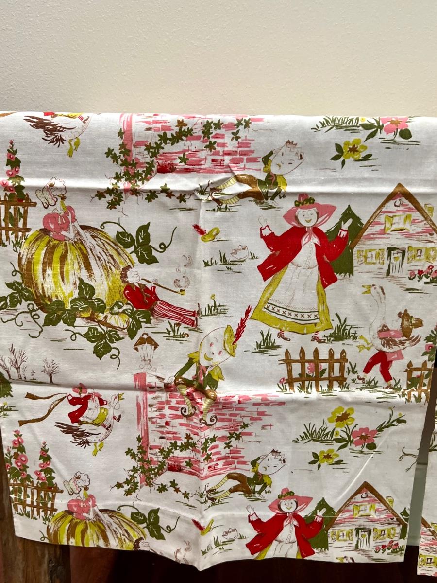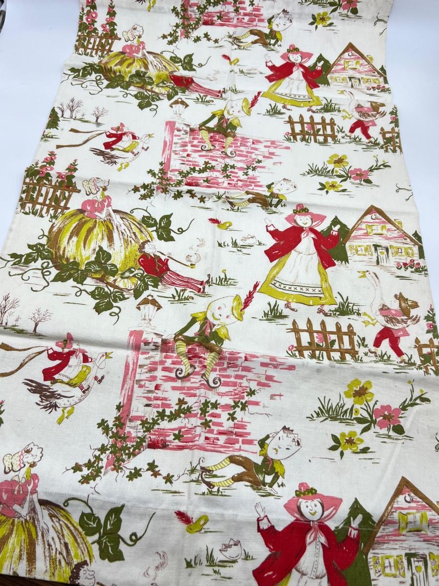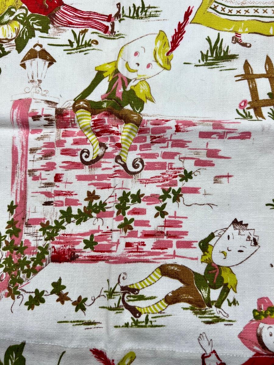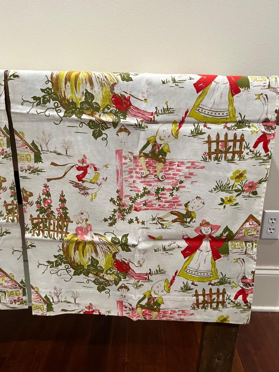 8 Vintage Nursery Rhymes Humpty Dumpty curtain valances. Each measures 38 inches long and 21 1/2 inches wide. Some may need to be spot cleaned.