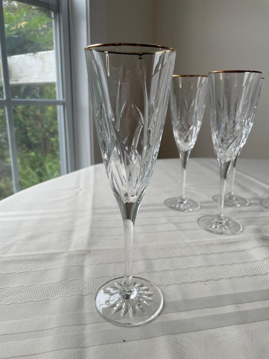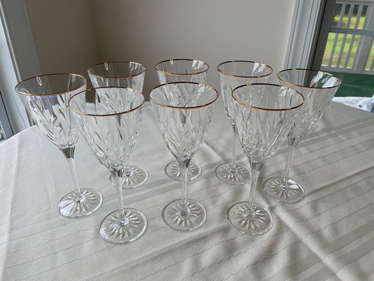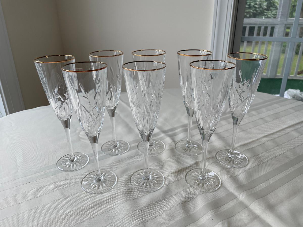 16 total glasses - 8 Wine and 8 Champagne. Clear glass with gold-tone trim.