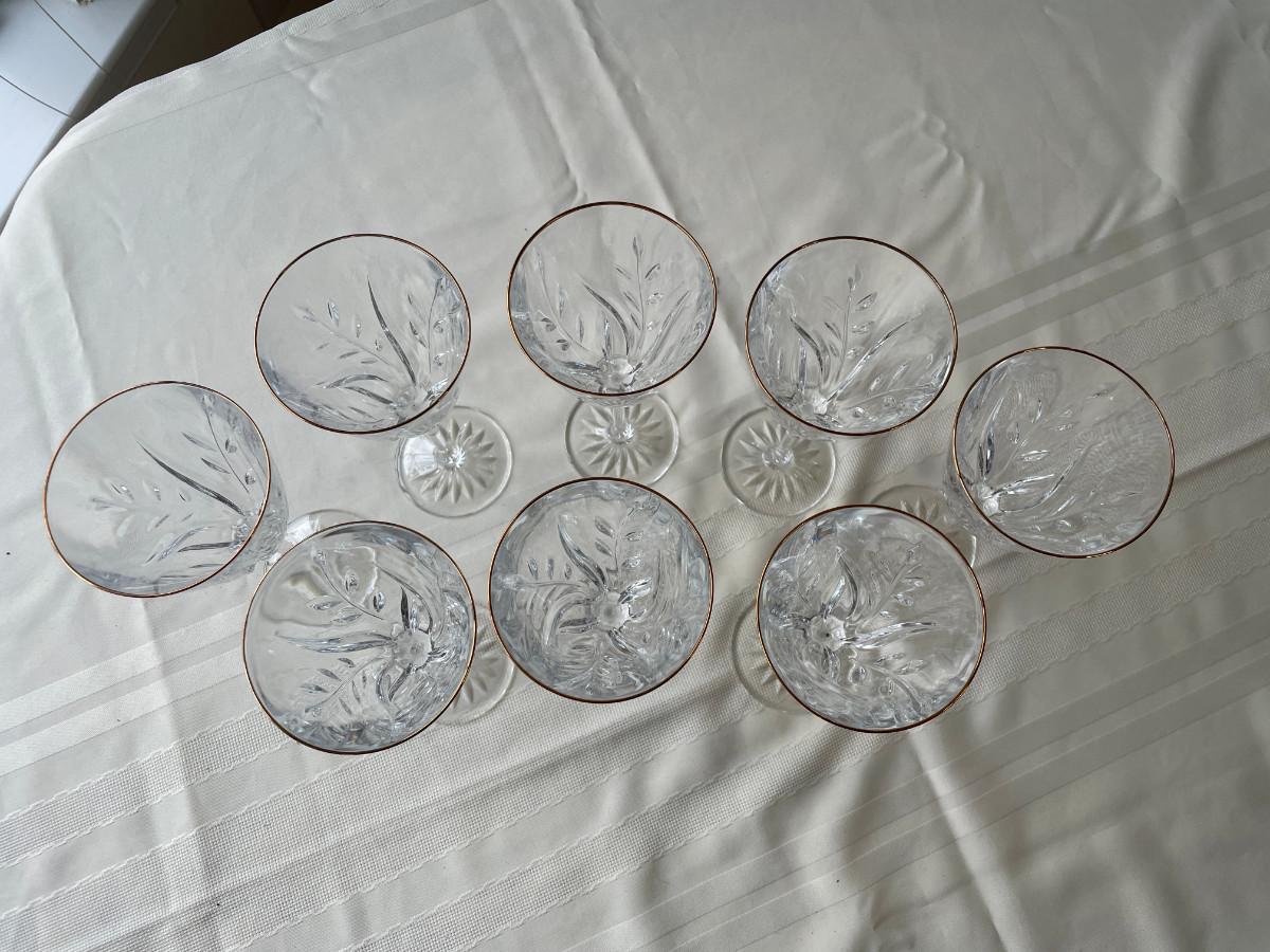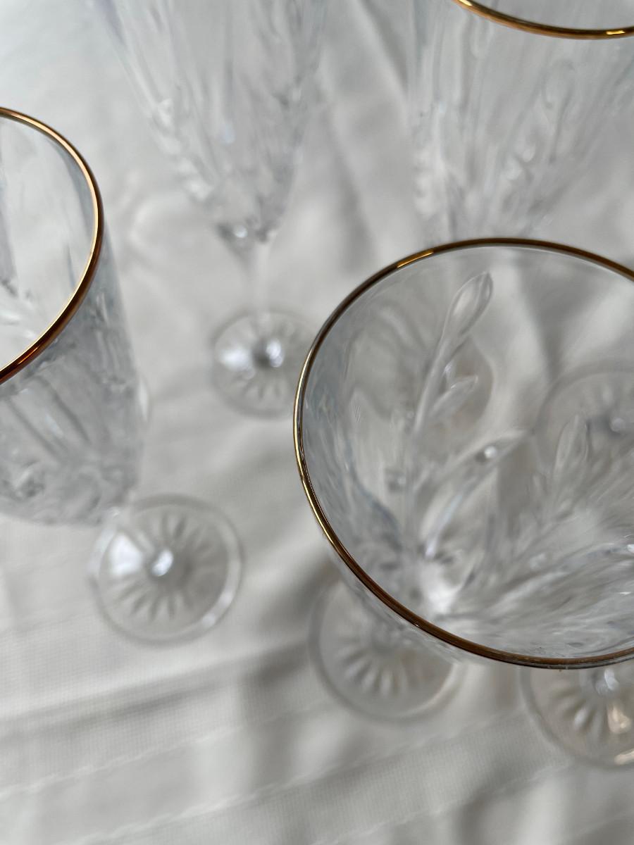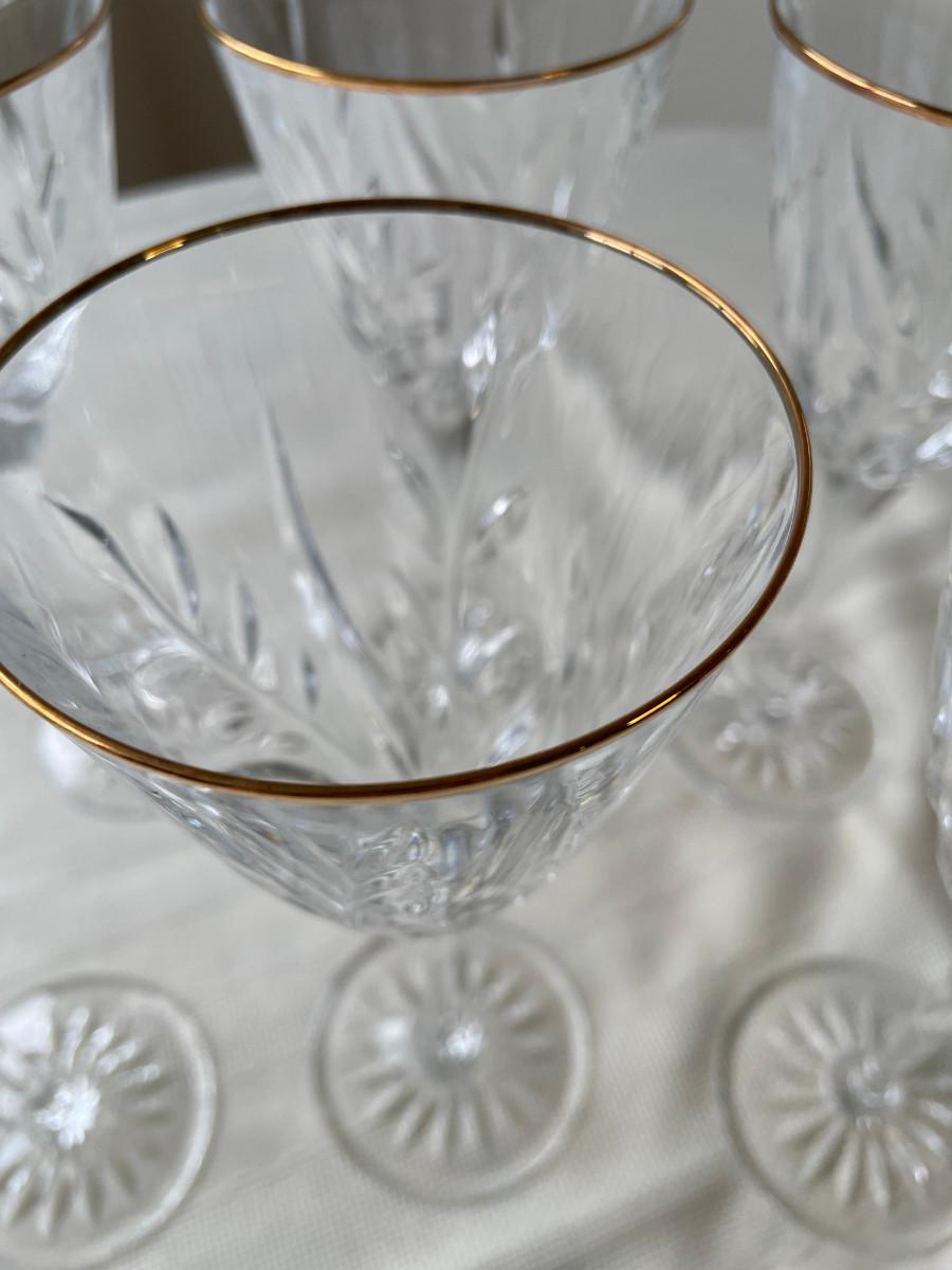 16 total glasses - 8 Wine and 8 Champagne. Clear glass with gold-tone trim.