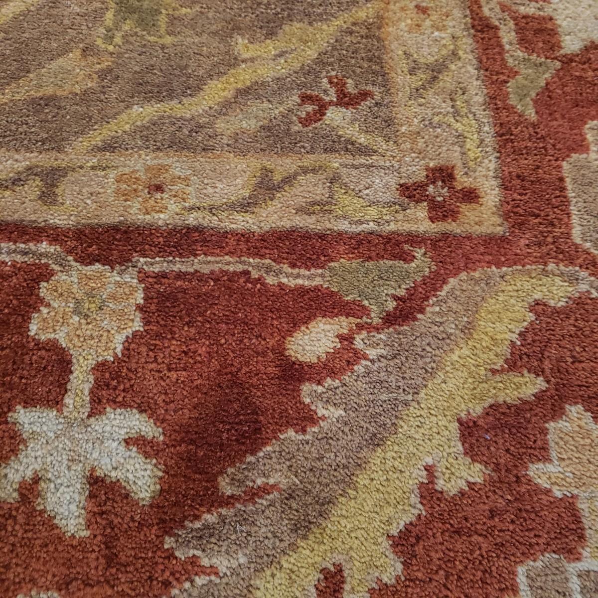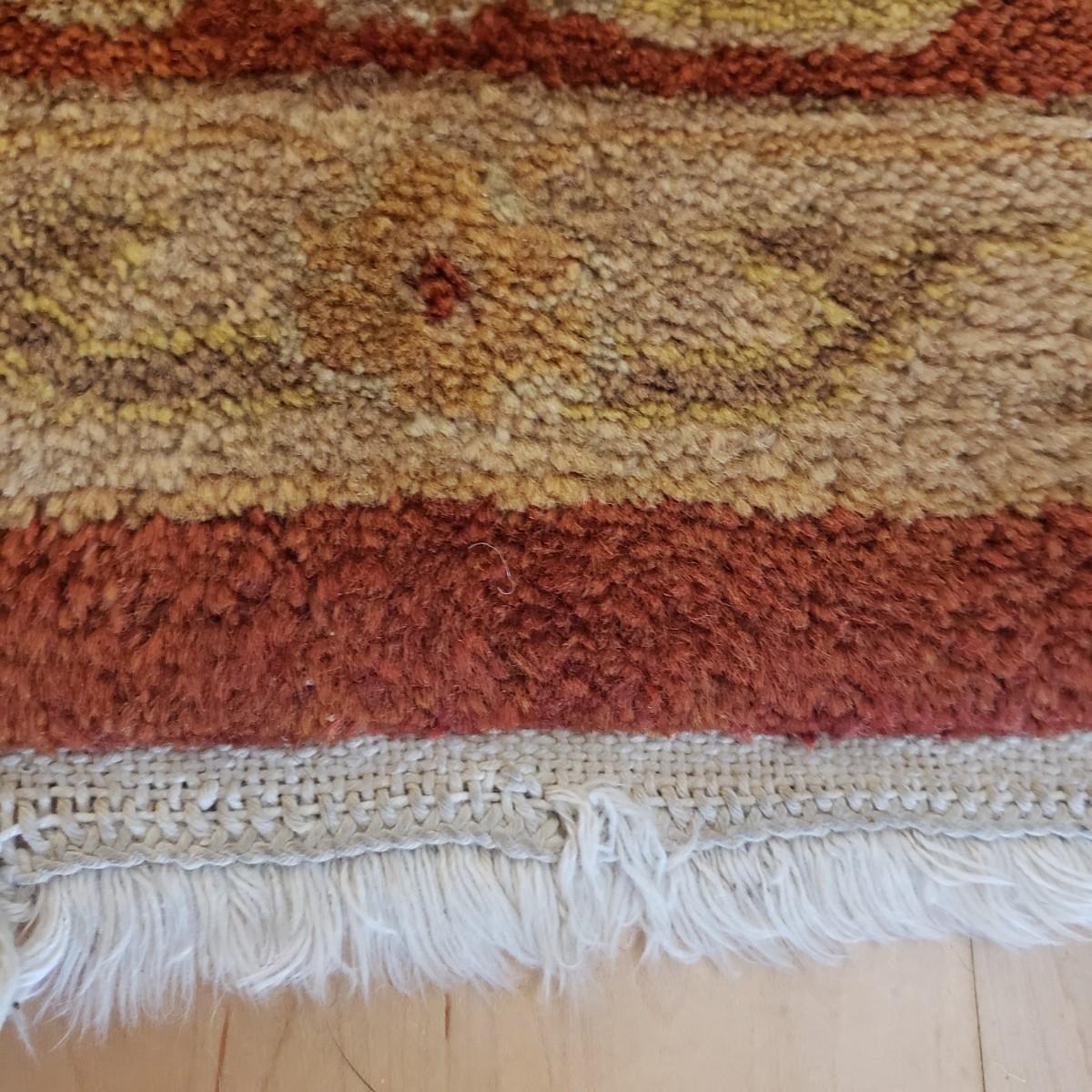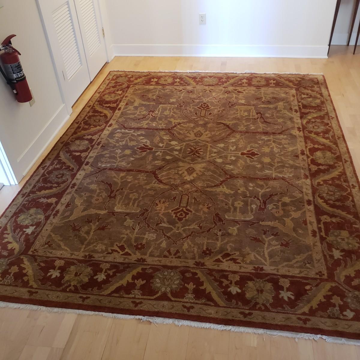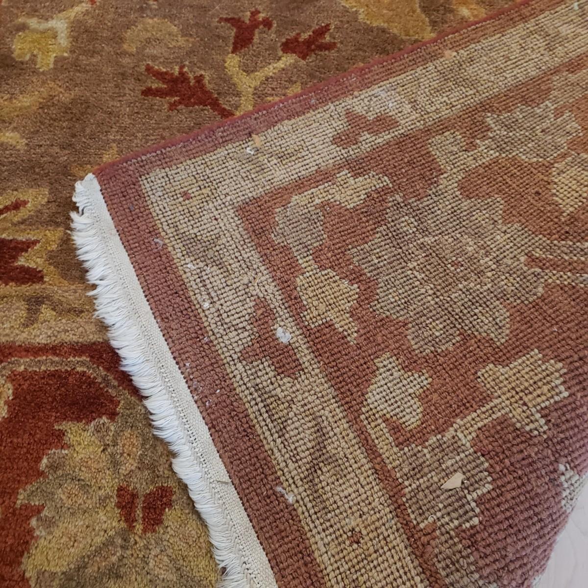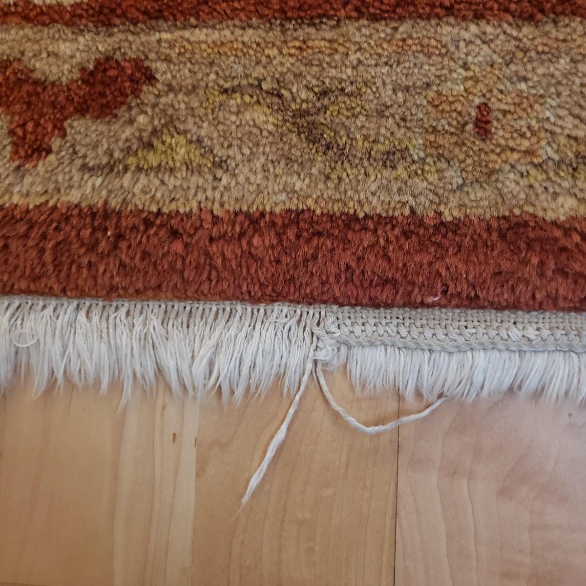 This appears to be a hand tufted area rug with rust and tan colors. The rug measures 8' x 10'. There are no brand markings on the underside. The fringe has a few snags, see pictures.