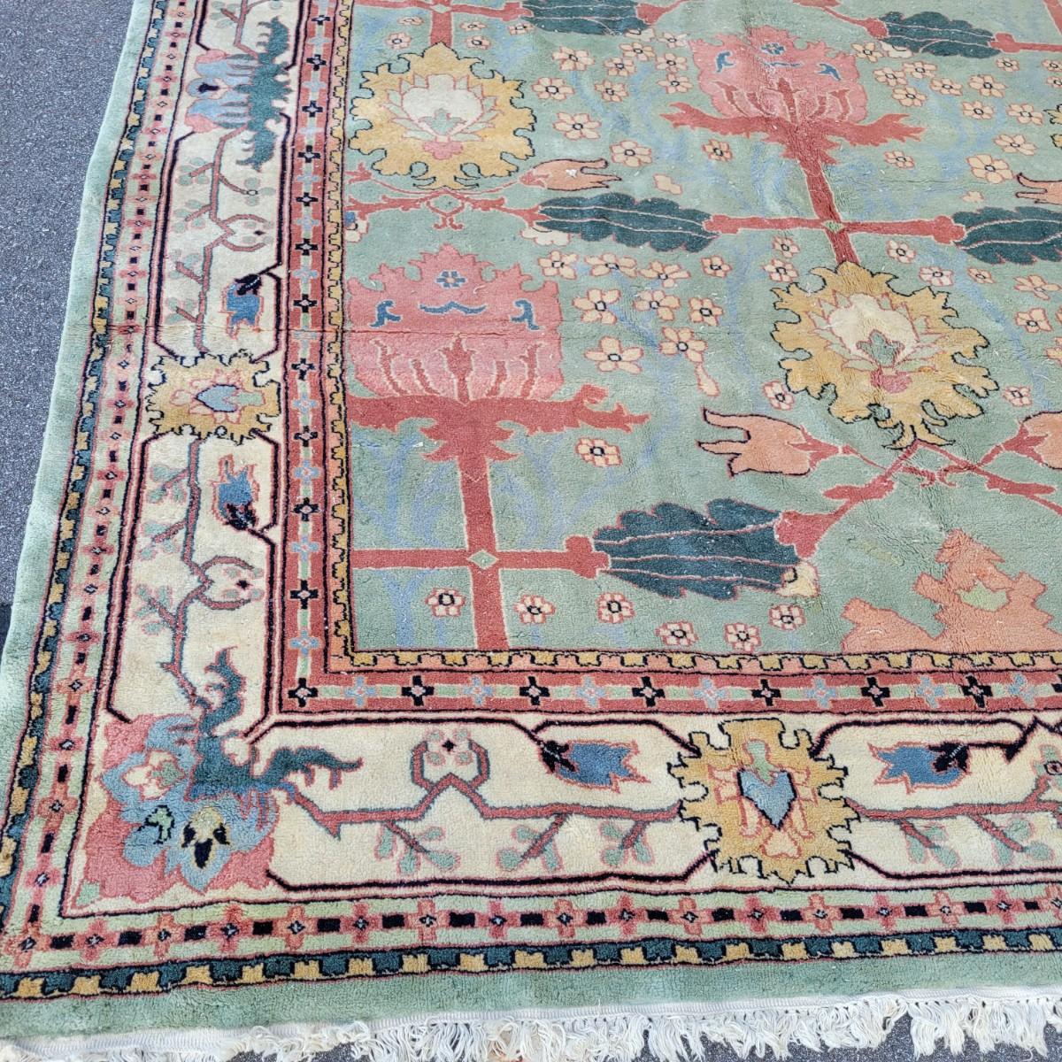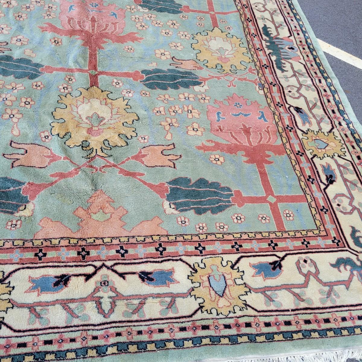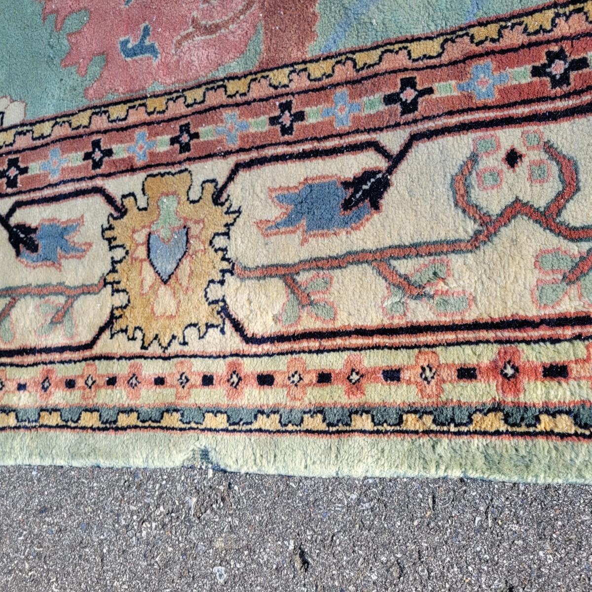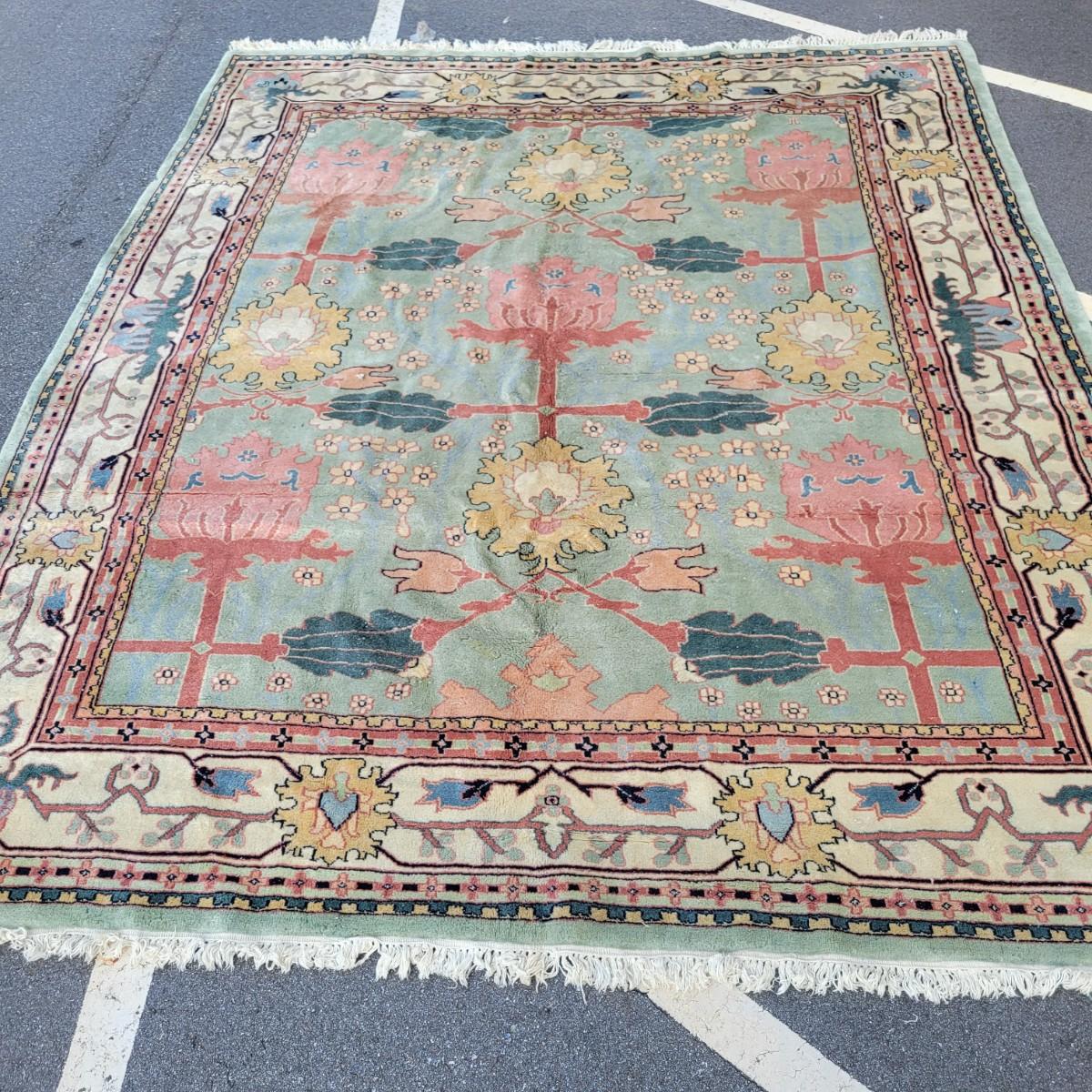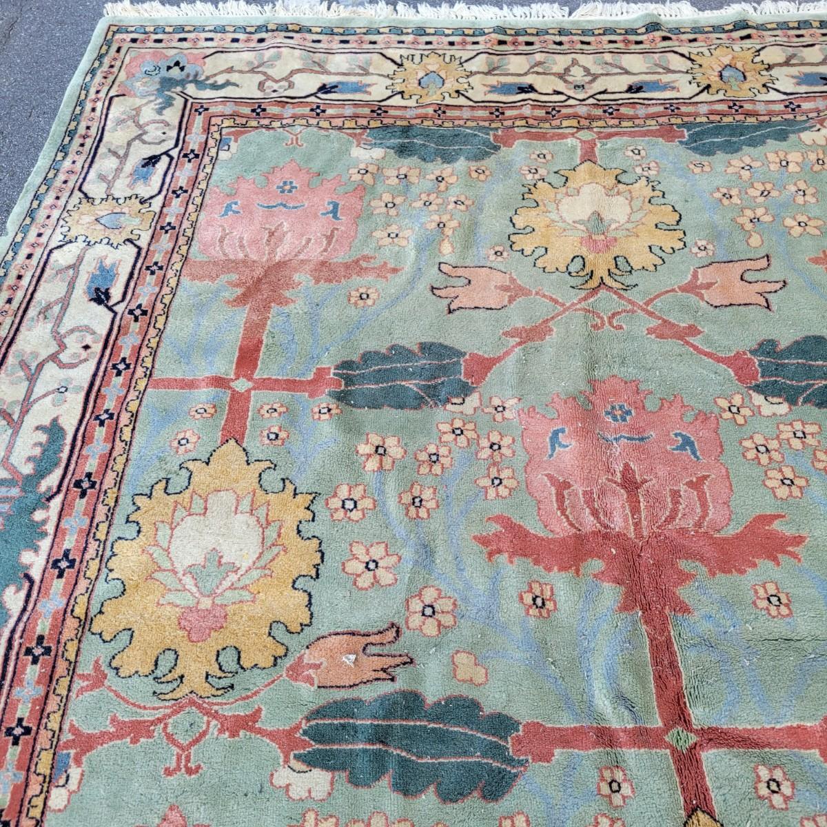 Large area rug in good condition with no notable fading, but does have a small damaged area on one side shown in images and some stains. Stains are hard to see with the background and aren't massive. Features pink roses on a blue background. Measures approximately 8' x 10' Local pickup only