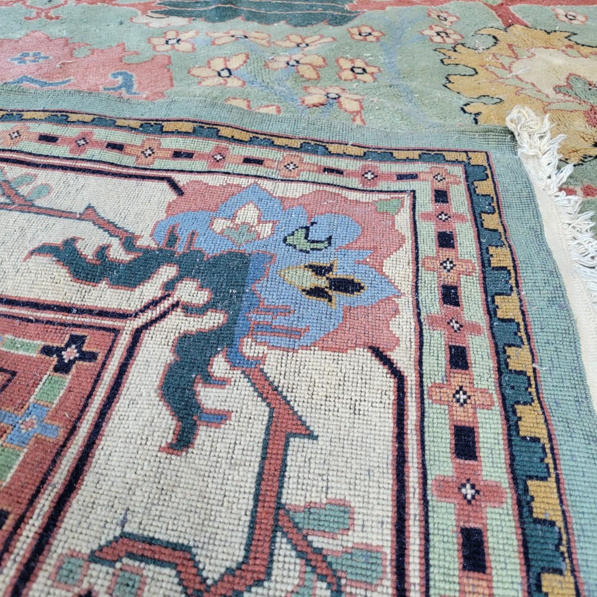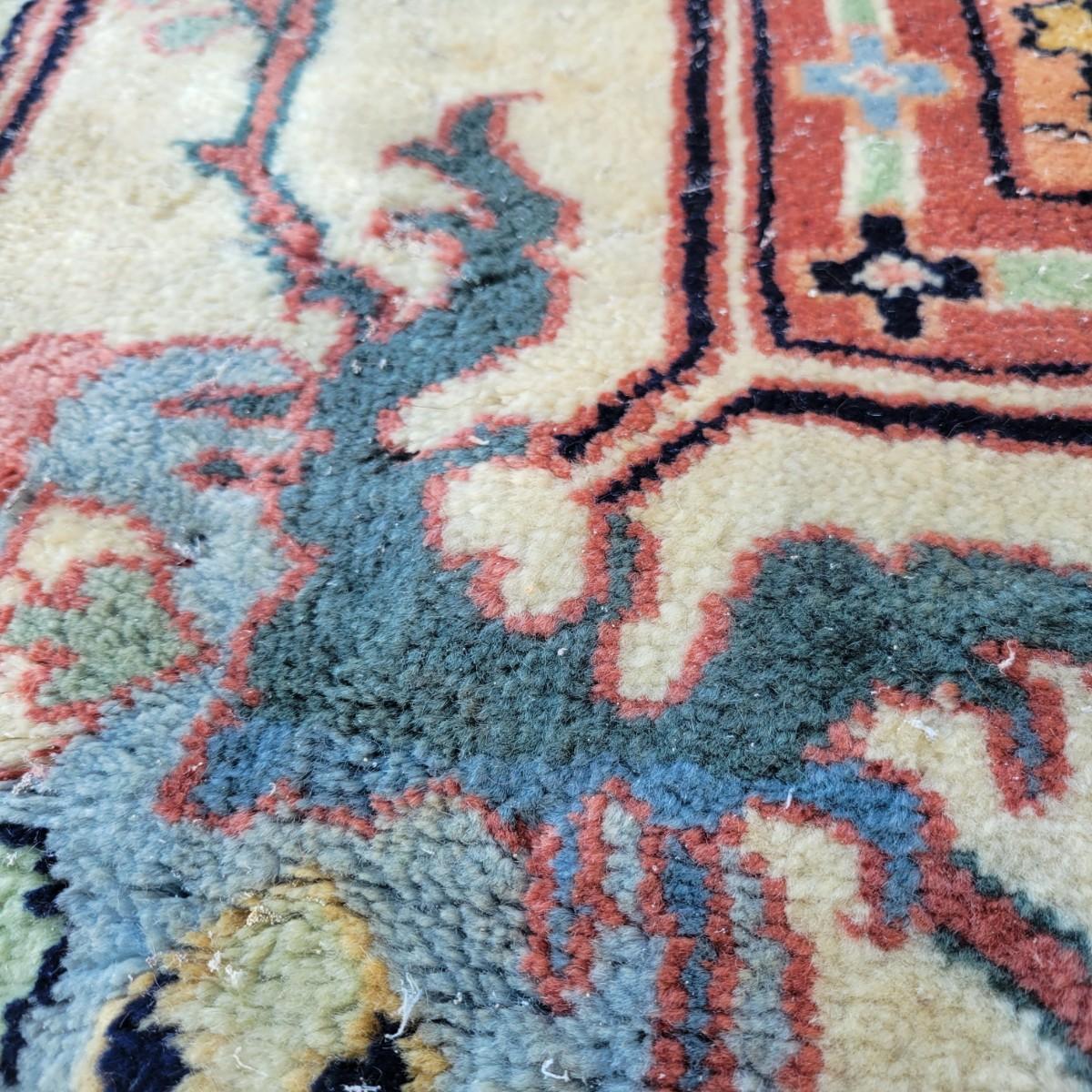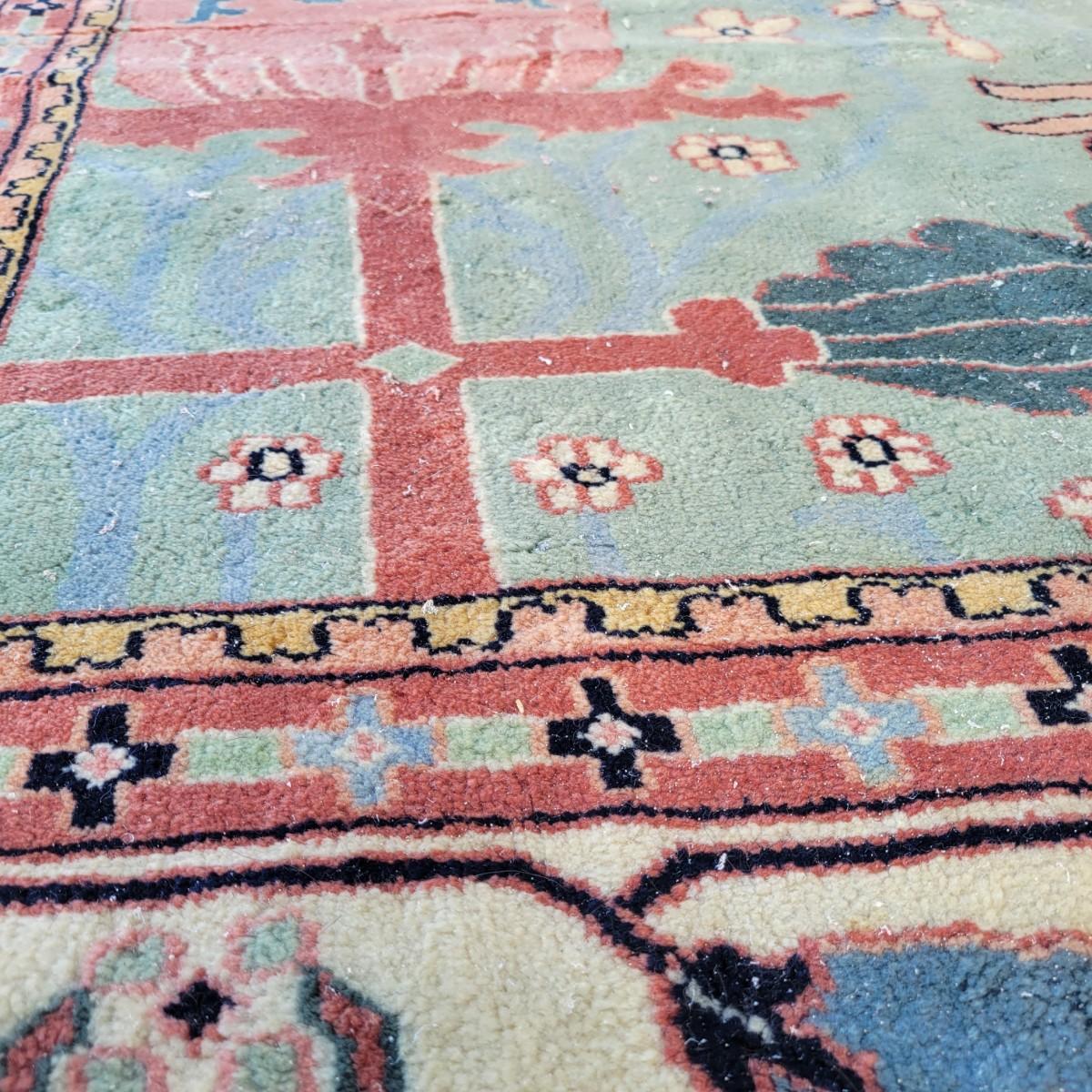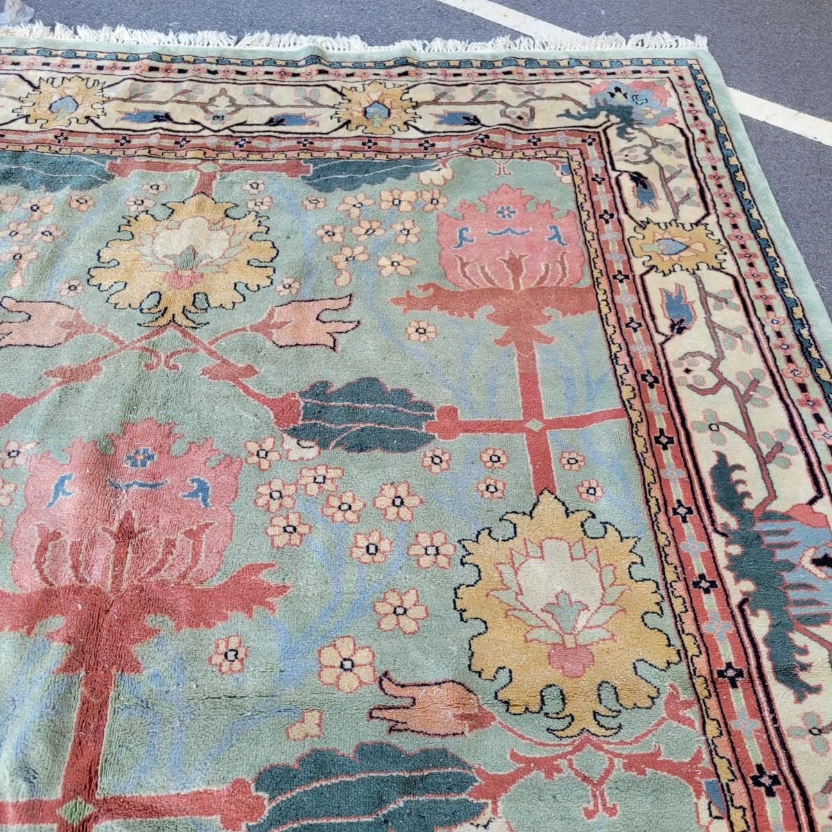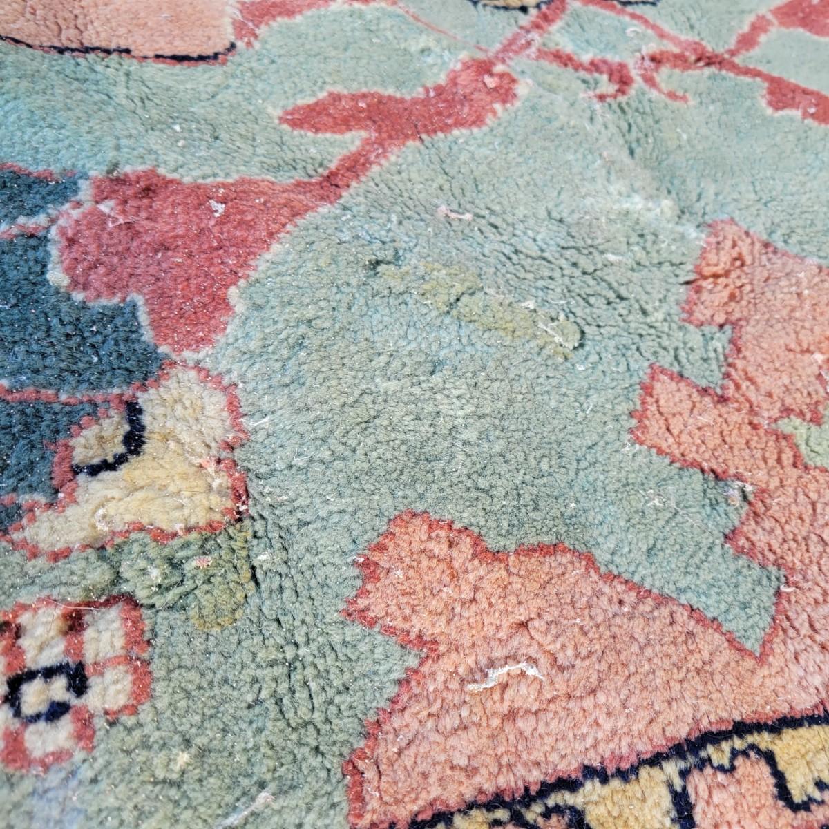 Large area rug in good condition with no notable fading, but does have a small damaged area on one side shown in images and some stains. Stains are hard to see with the background and aren't massive. Features pink roses on a blue background. Measures approximately 8' x 10' Local pickup only