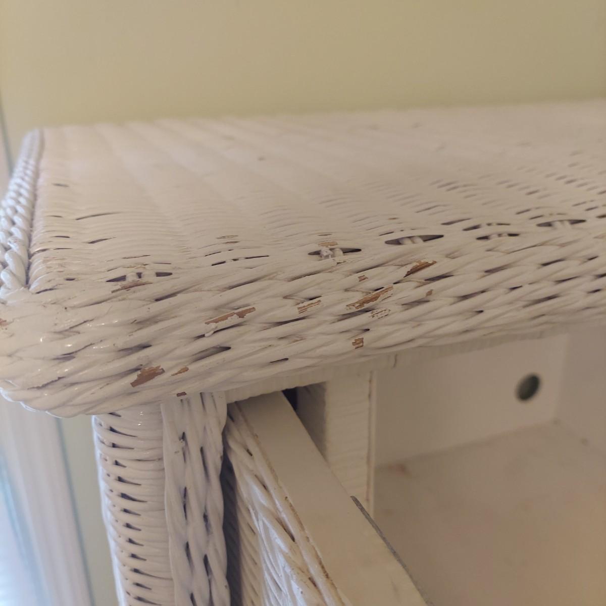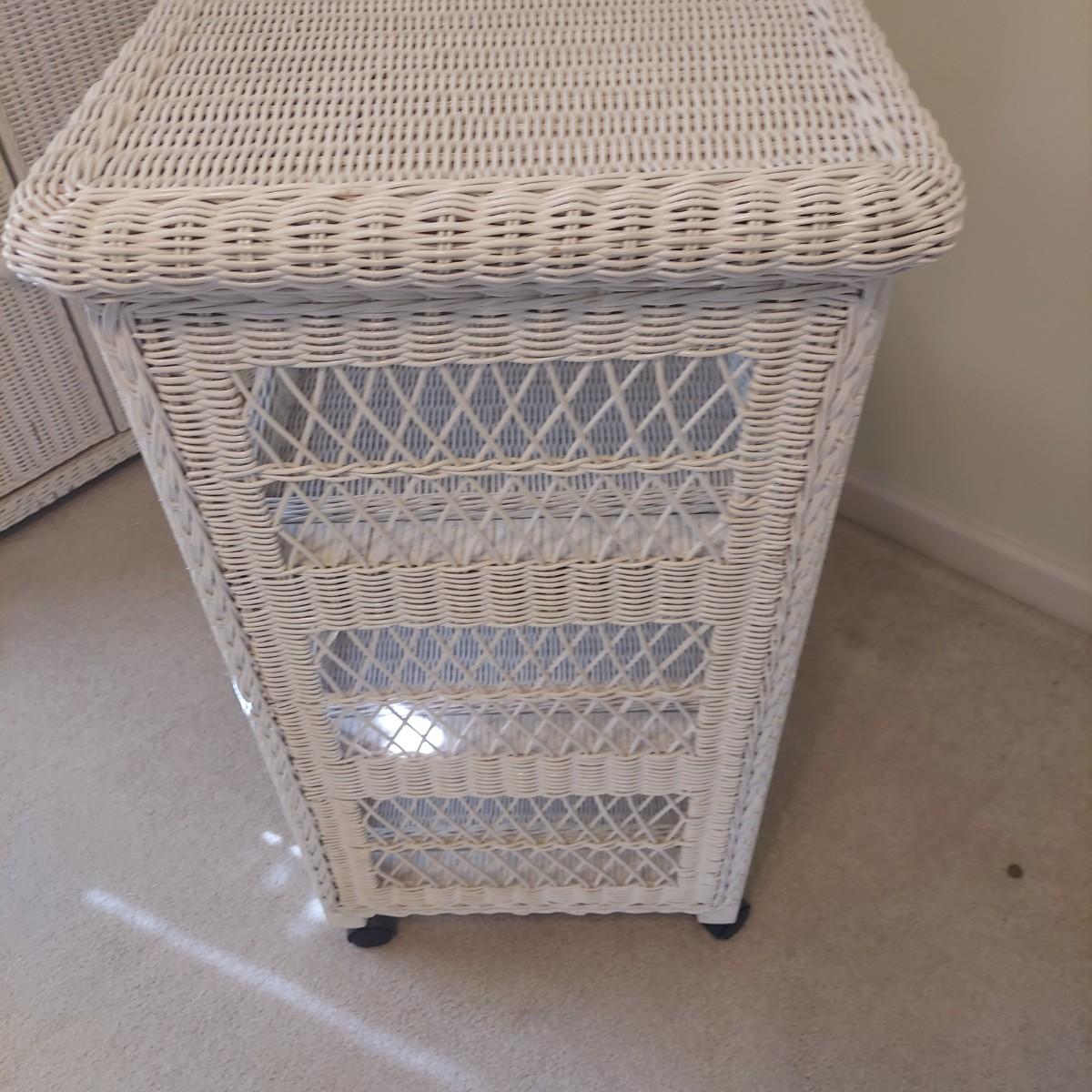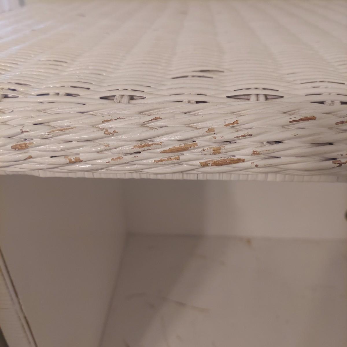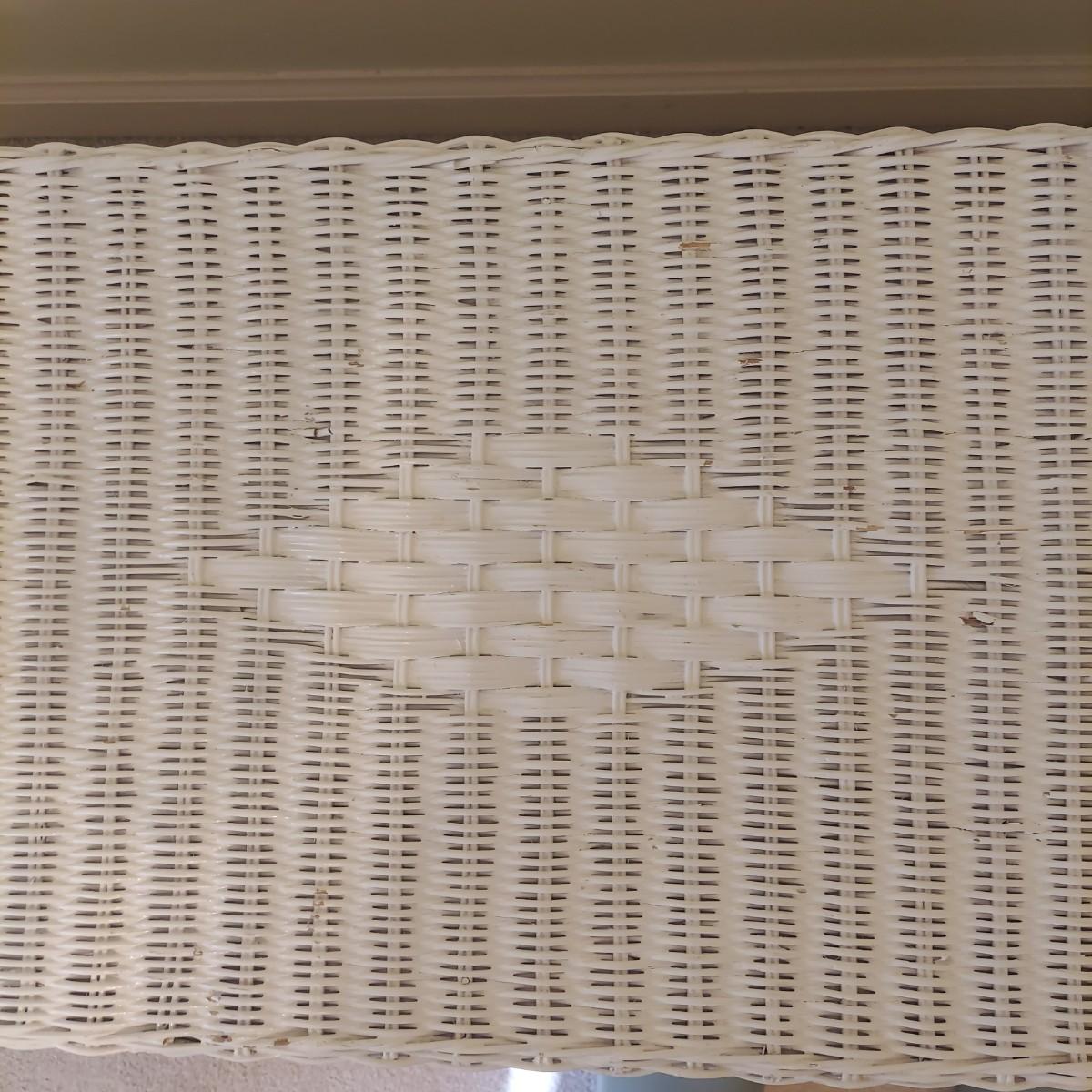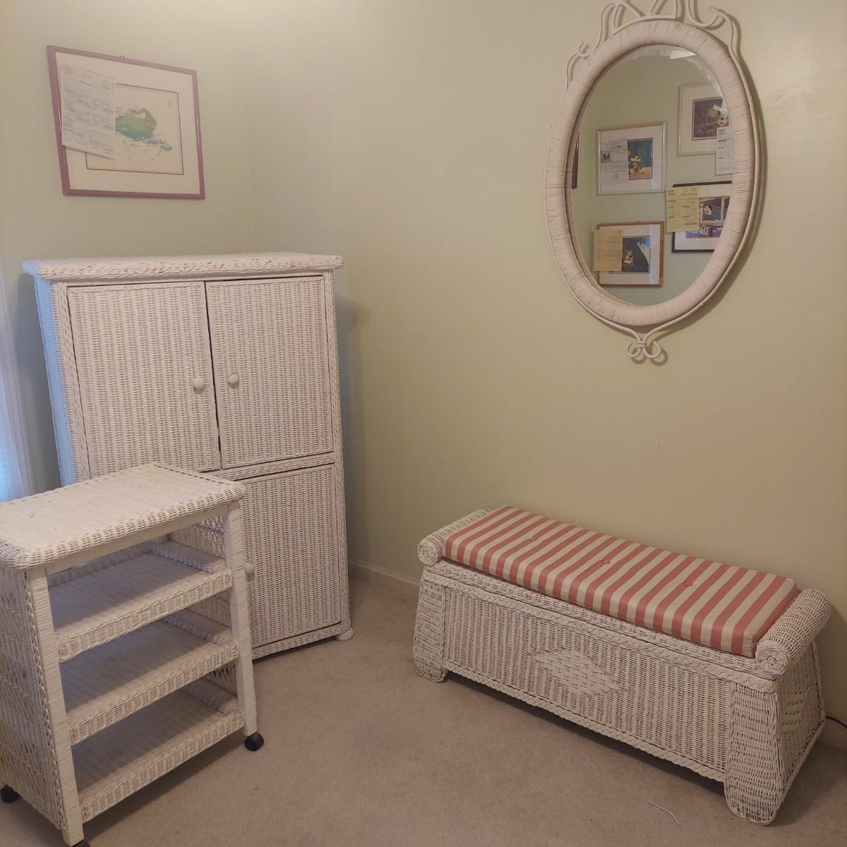 Four pieces of wicker bedroom furniture that are painted white. The large bureau measures 37” x 23” x 55"H. The storage chest measures 46” x 18” x 19"H and has a removable cushion. Mirror has a wrought iron frame. All pieces have chipping paint. Please see photos for details. Local Pickup Only
