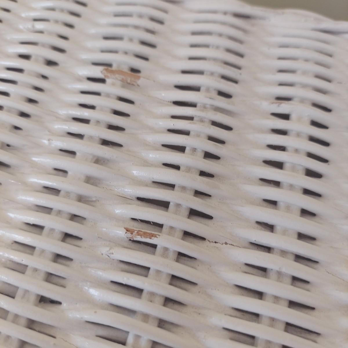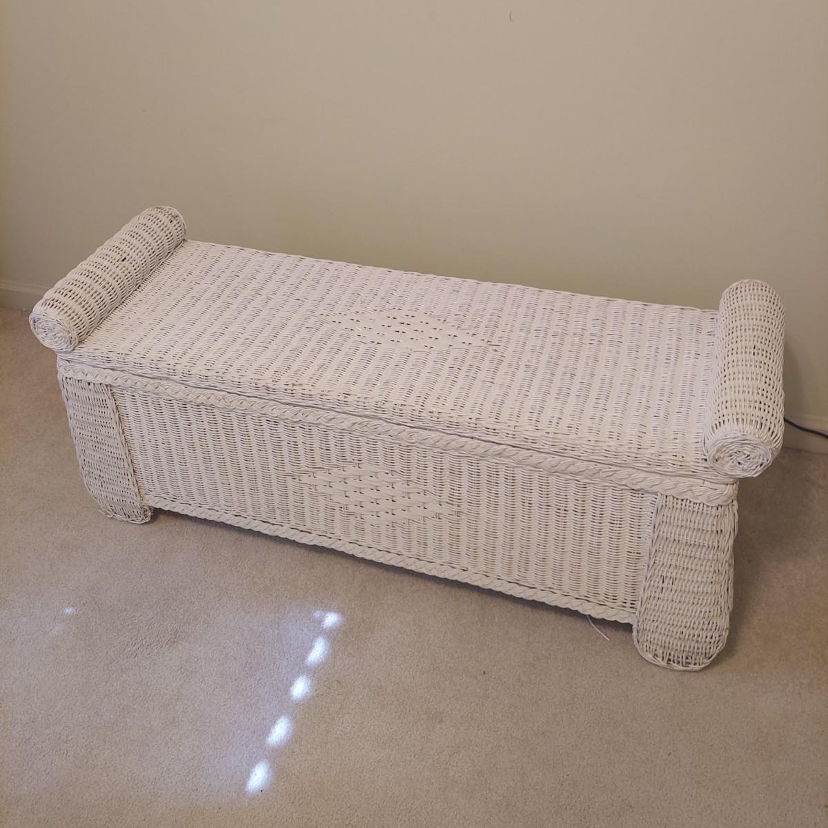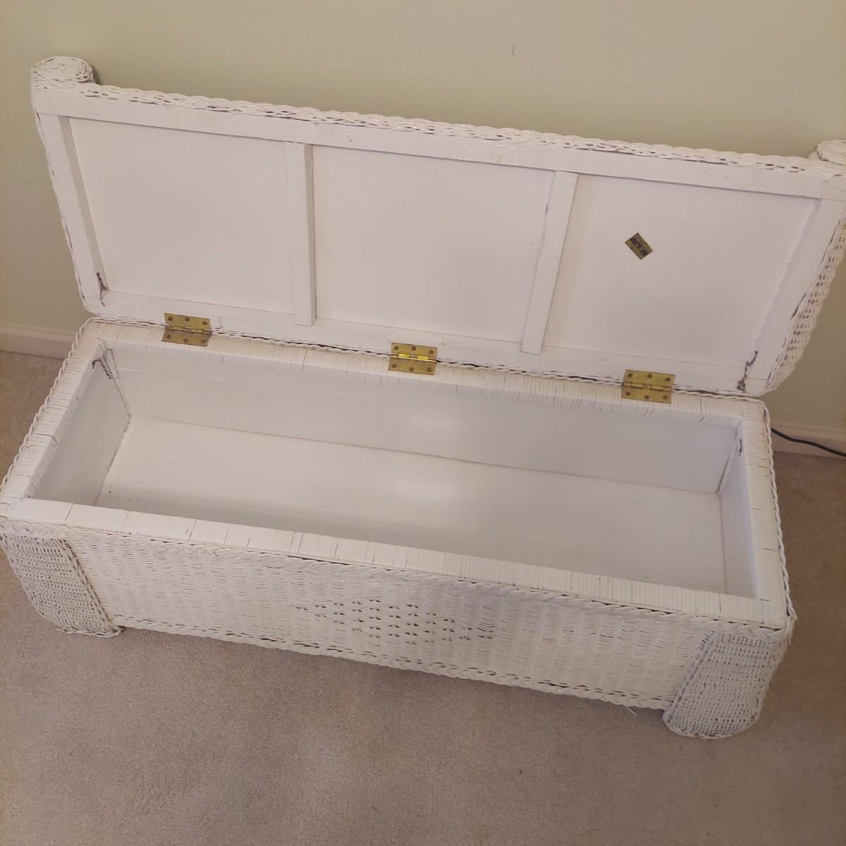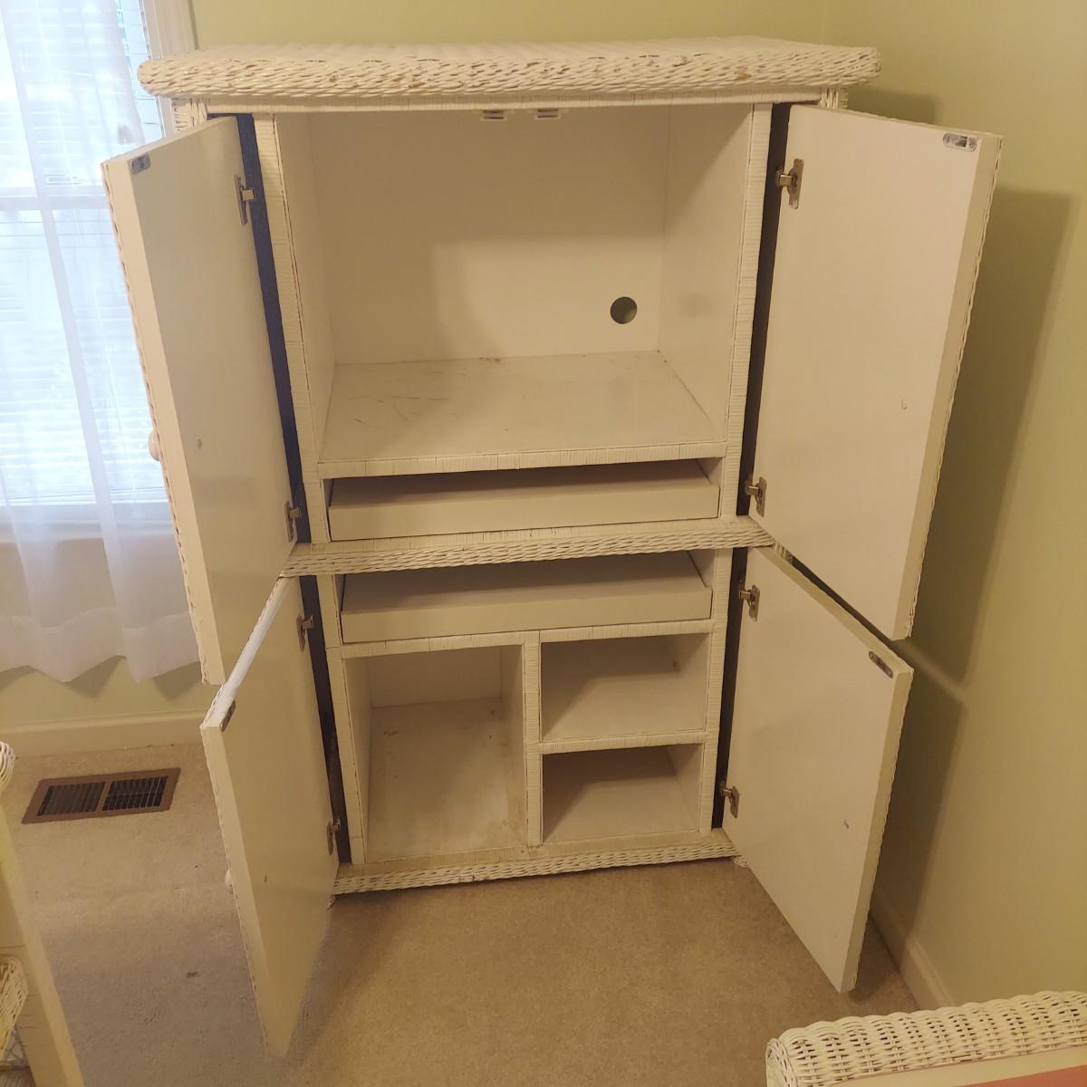 Four pieces of wicker bedroom furniture that are painted white. The large bureau measures 37” x 23” x 55"H. The storage chest measures 46” x 18” x 19"H and has a removable cushion. Mirror has a wrought iron frame. All pieces have chipping paint. Please see photos for details. Local Pickup Only