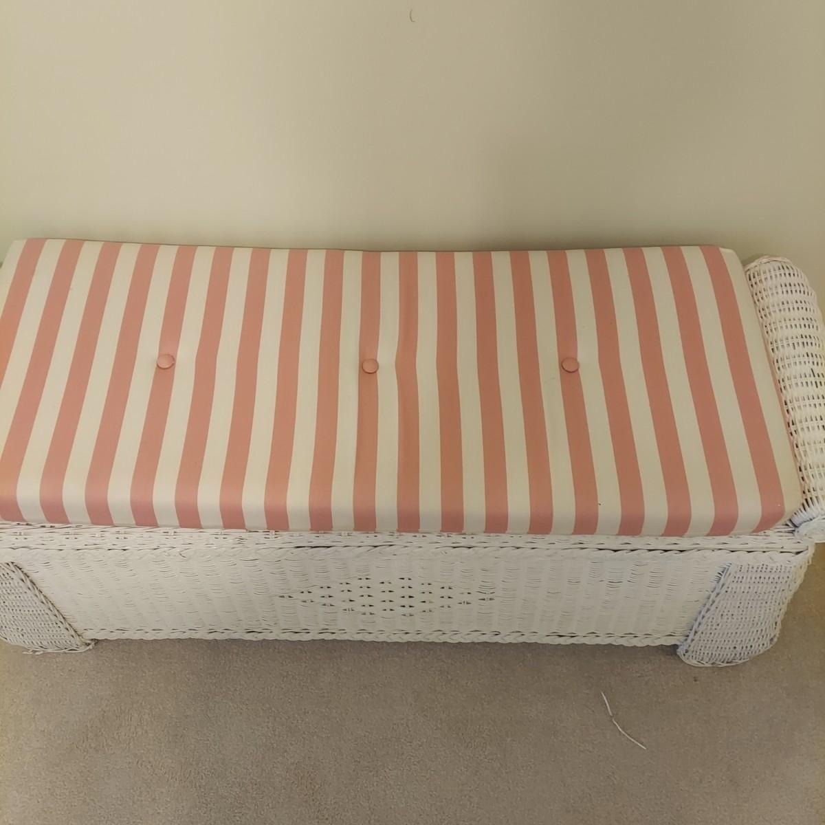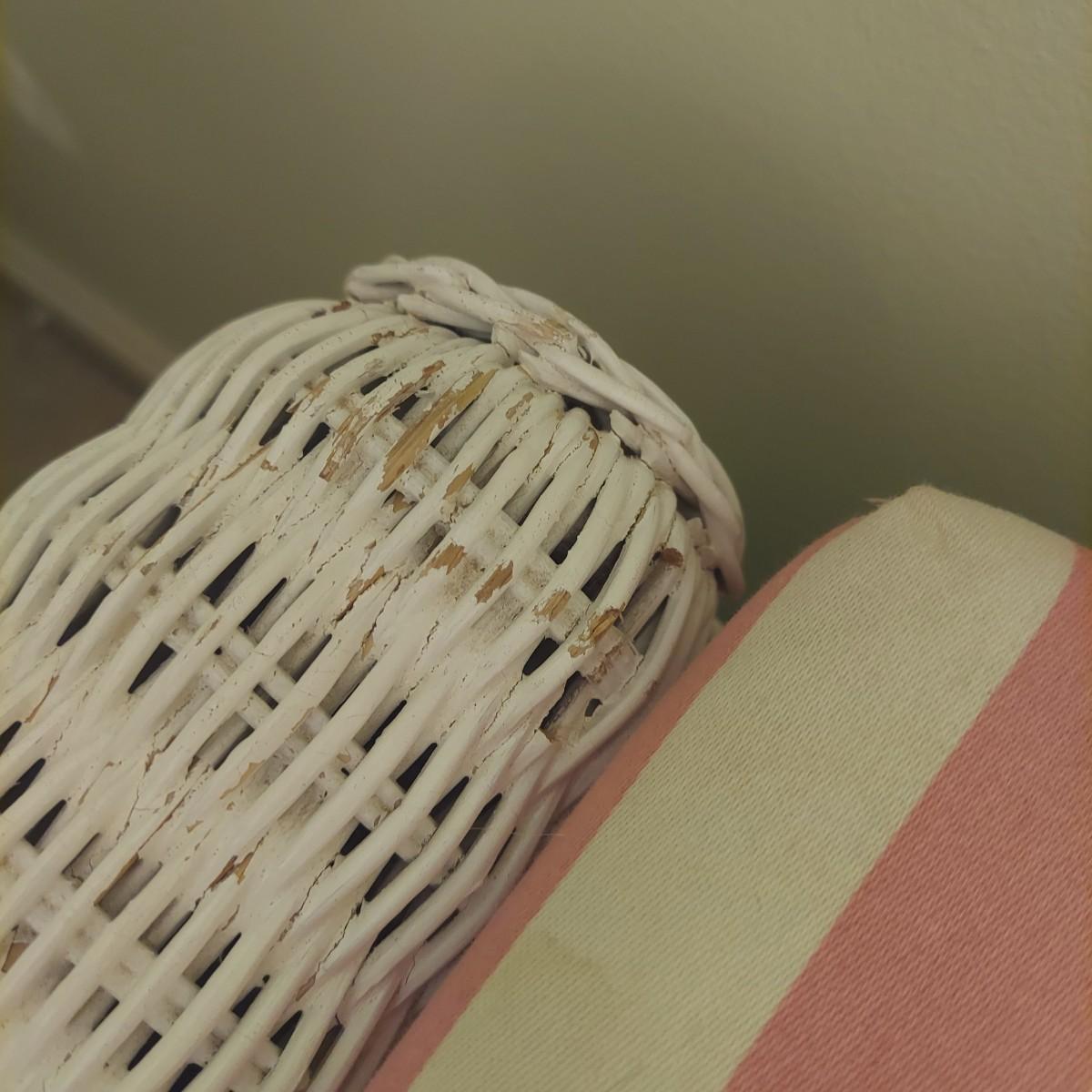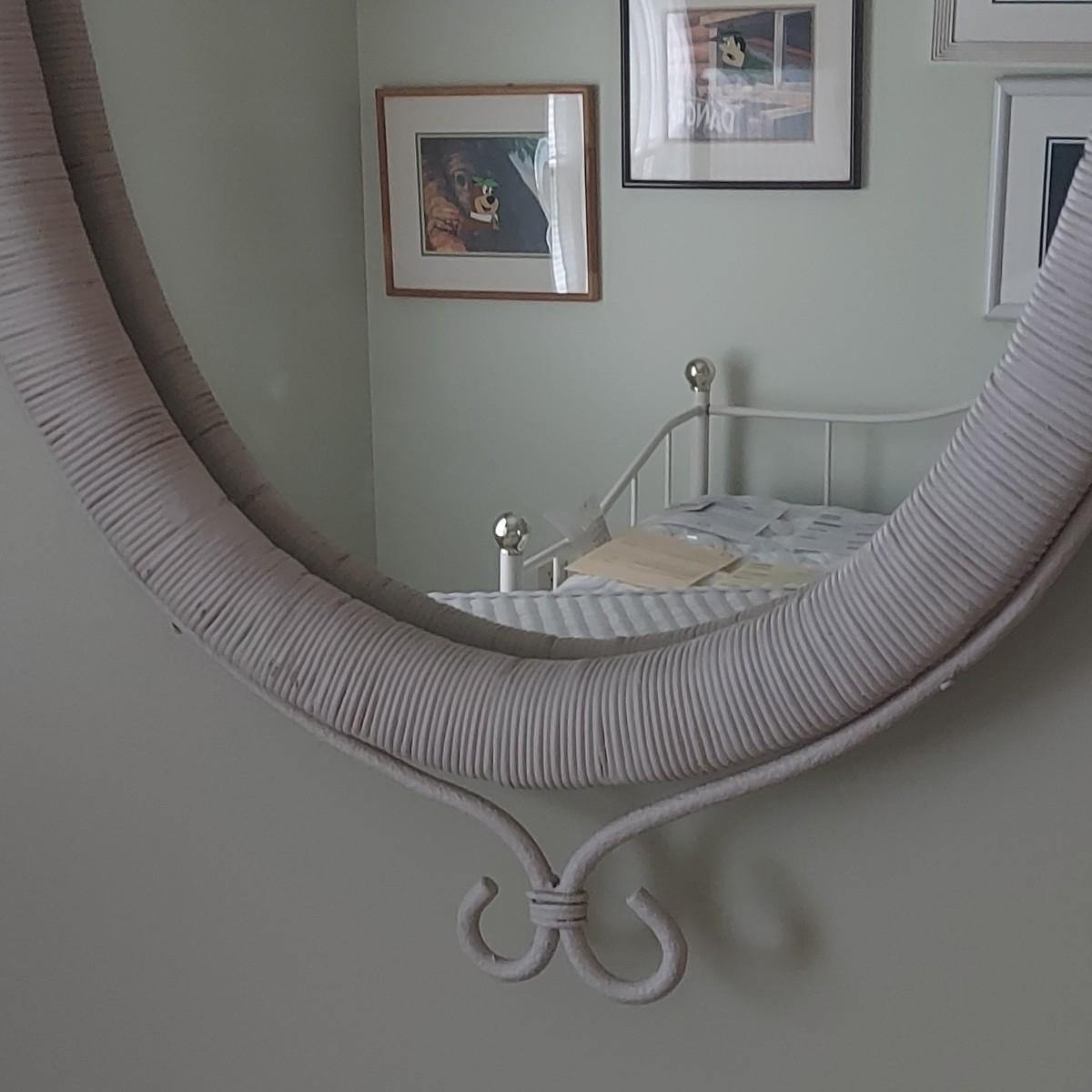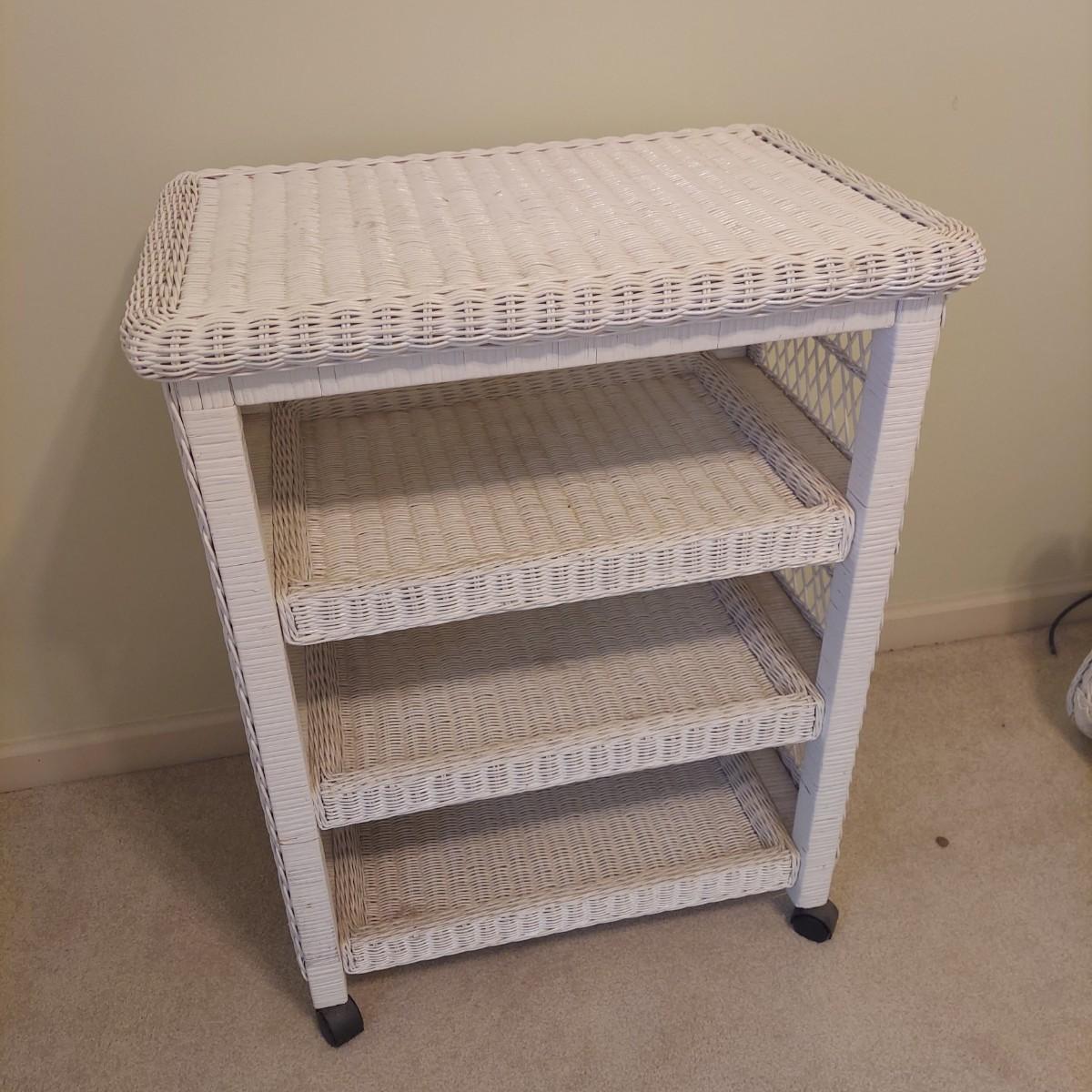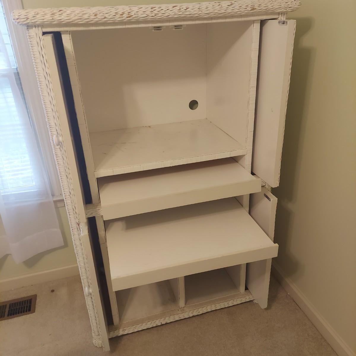 Four pieces of wicker bedroom furniture that are painted white. The large bureau measures 37” x 23” x 55"H. The storage chest measures 46” x 18” x 19"H and has a removable cushion. Mirror has a wrought iron frame. All pieces have chipping paint. Please see photos for details. Local Pickup Only