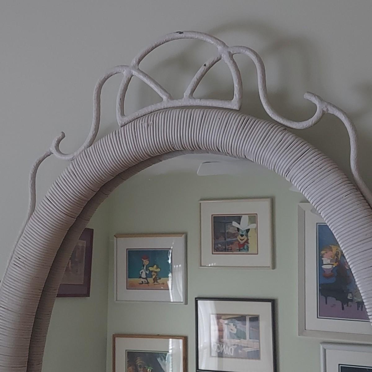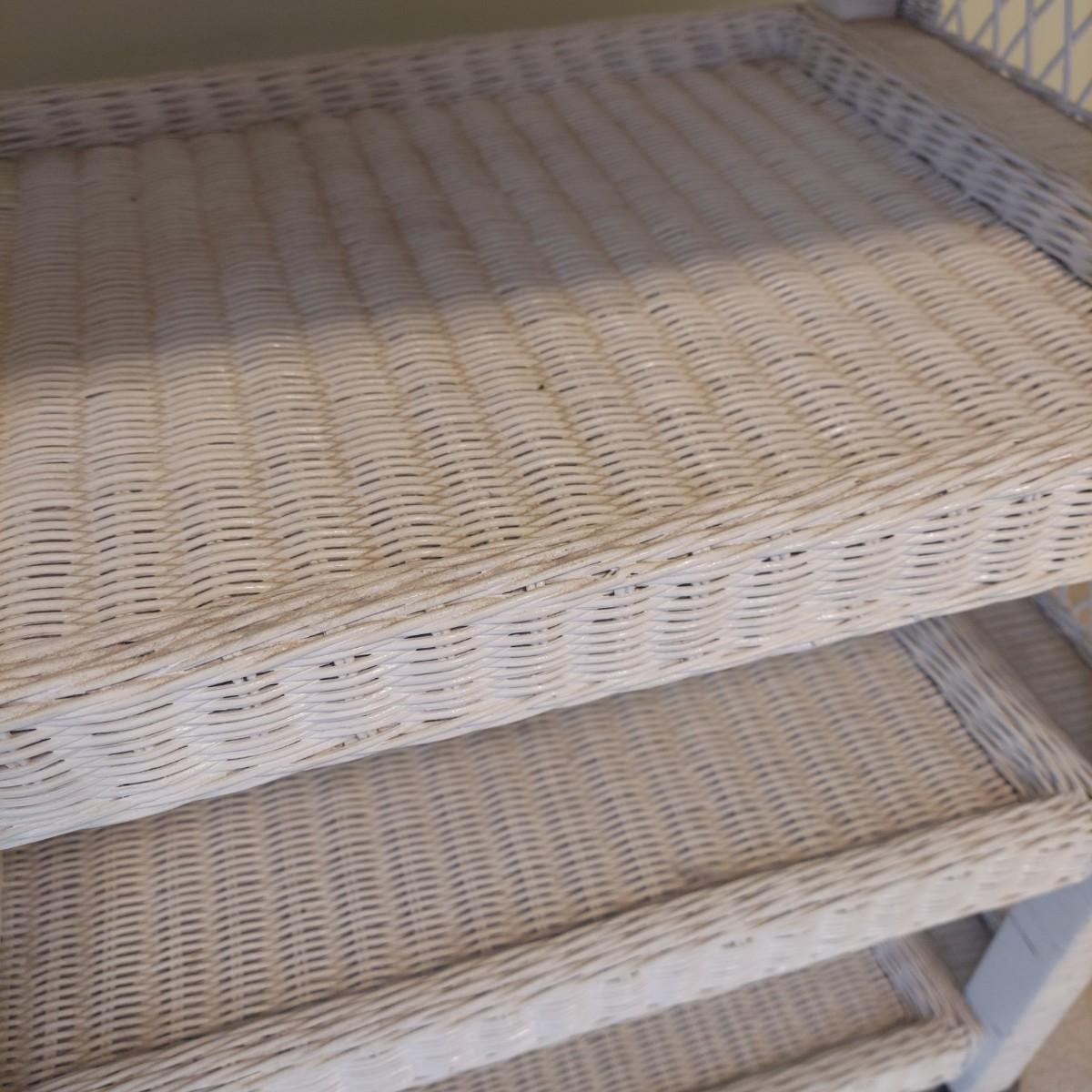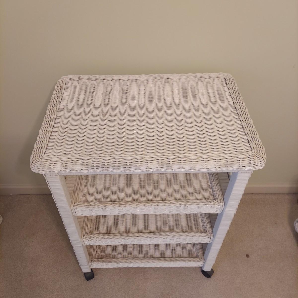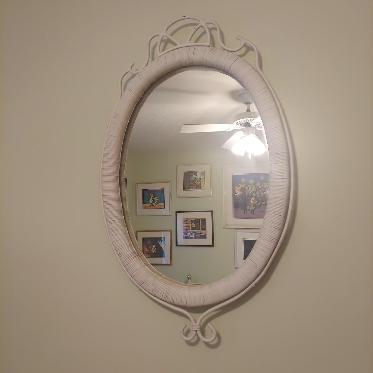 Four pieces of wicker bedroom furniture that are painted white. The large bureau measures 37” x 23” x 55"H. The storage chest measures 46” x 18” x 19"H and has a removable cushion. Mirror has a wrought iron frame. All pieces have chipping paint. Please see photos for details. Local Pickup Only