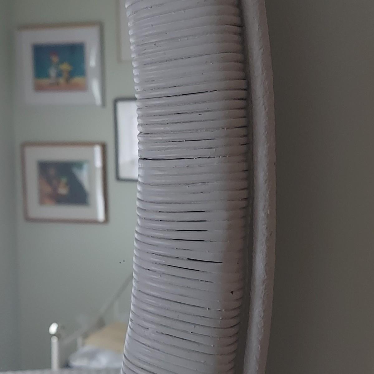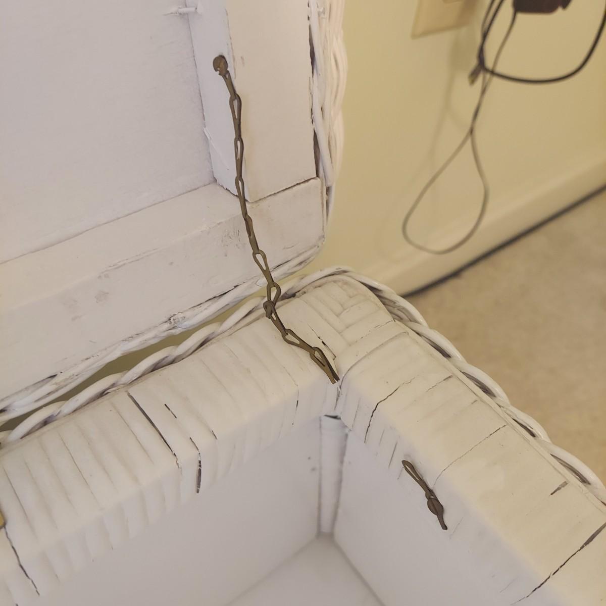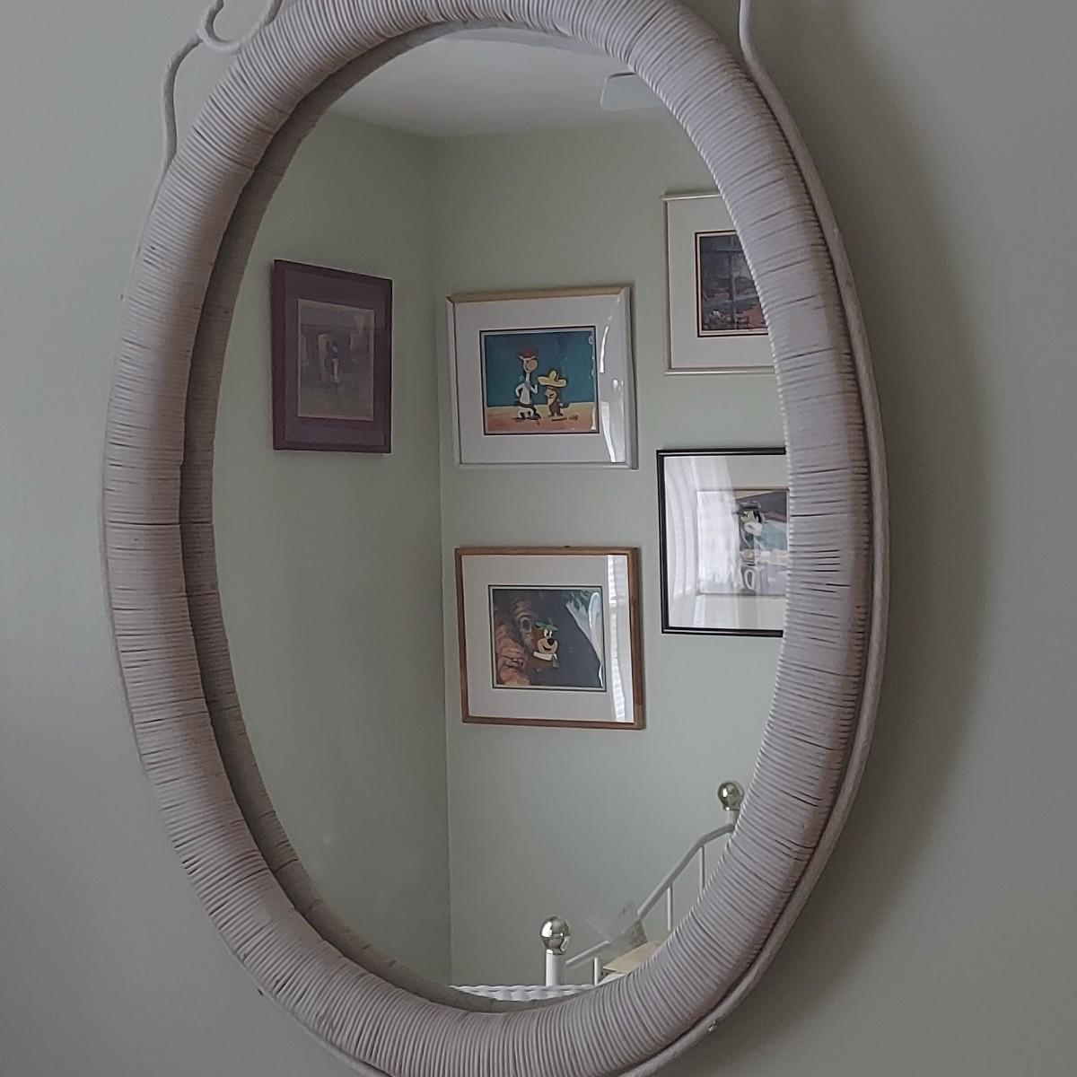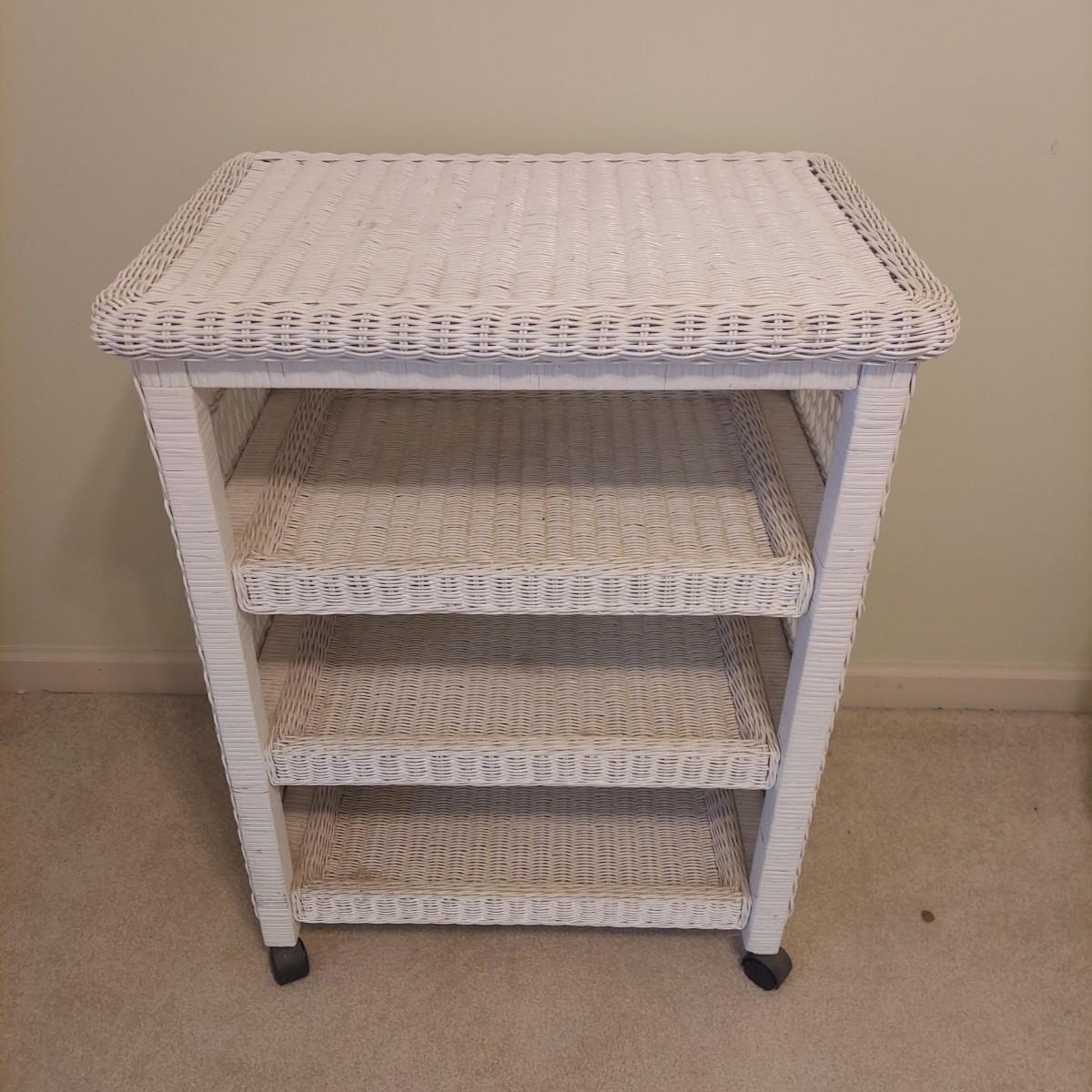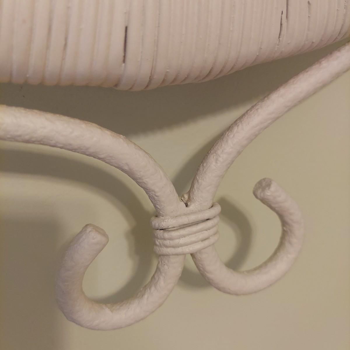 Four pieces of wicker bedroom furniture that are painted white. The large bureau measures 37” x 23” x 55"H. The storage chest measures 46” x 18” x 19"H and has a removable cushion. Mirror has a wrought iron frame. All pieces have chipping paint. Please see photos for details. Local Pickup Only